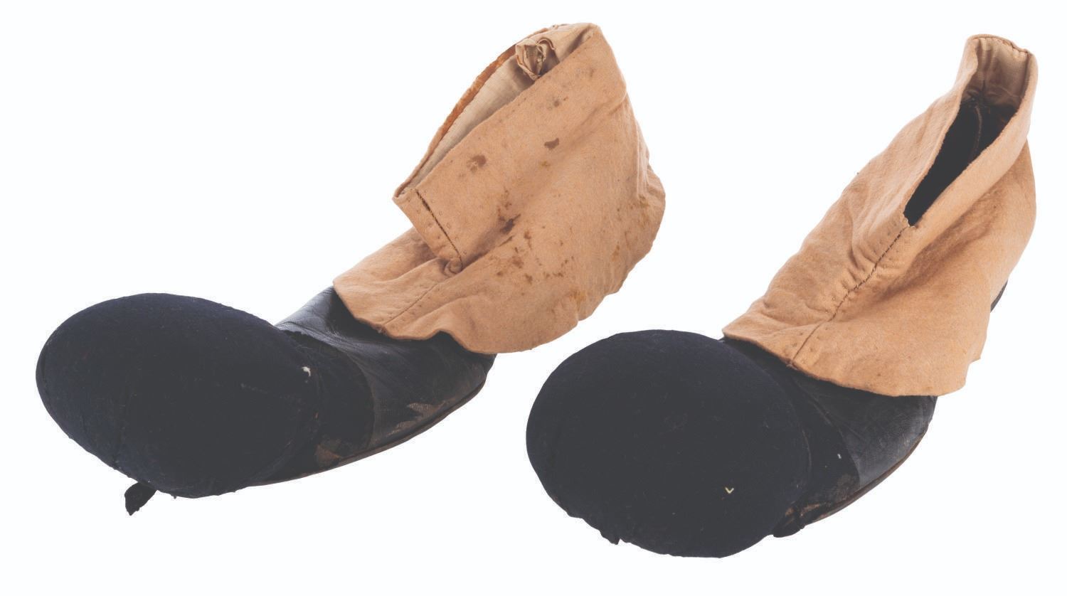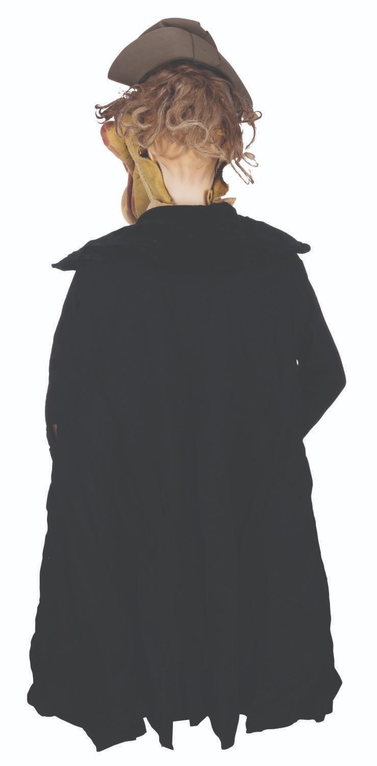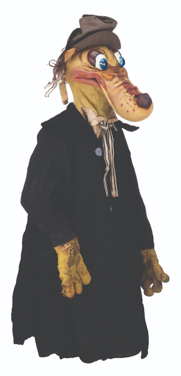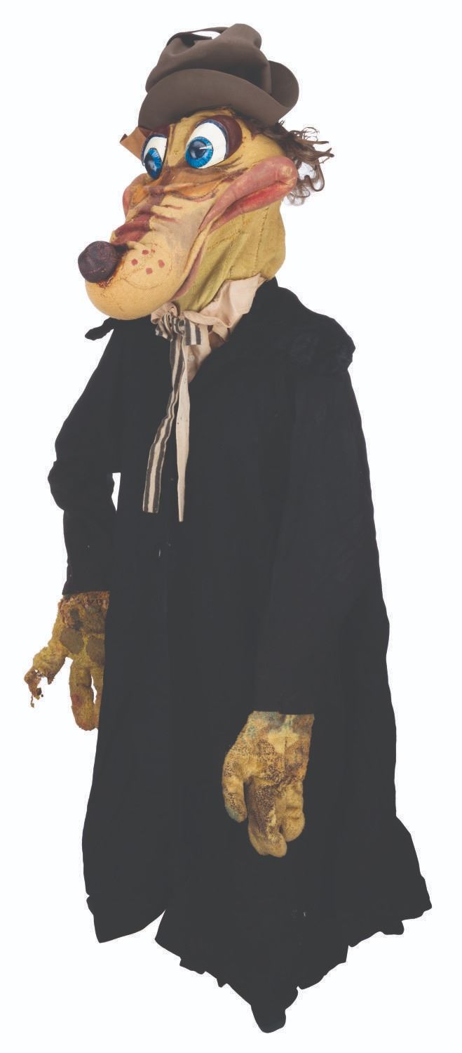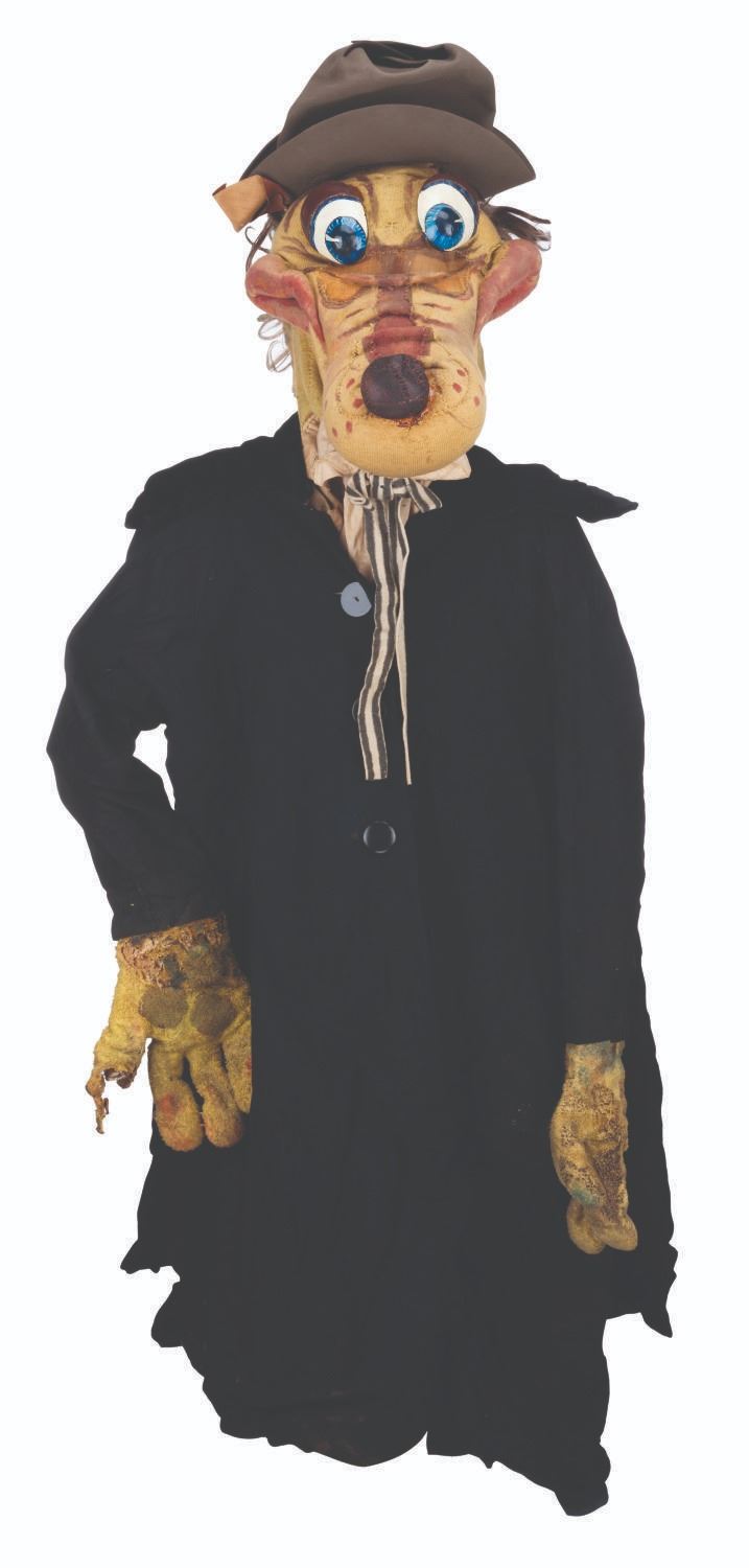 (Clampett, 1960s) A one of a kind walk around costume of Willy the Wolf. The head piece, constructed of cotton, nylon, velvet, felt, vinyl, terry cloth, wig hair, wire, and wood measures 16” x 10.5” x 9” tall and is in fair condition with paint cracking and adhesive residue on the nose, soiling and stains, and discoloration from age. The body which is constructed of linen, velvet, and terry cloth and measures 40” long and 16” from shoulder to shoulder is in poor condition with heavy deterioration to the hands, heavy soiling and staining to the cape including terrycloth residue from the hands from having adhered to and ripped from the fabric as well as intentional distress including rips and tears. The shoes are modified men’s shoes with felt spats which have detached and bulbus, cotton end caps and measure 13” x 4.25” wide are in poor condition with soiling, stains, and wear.