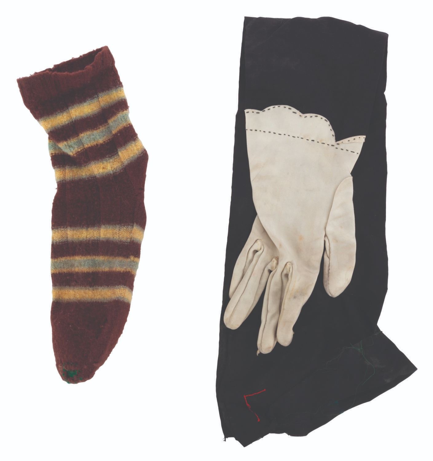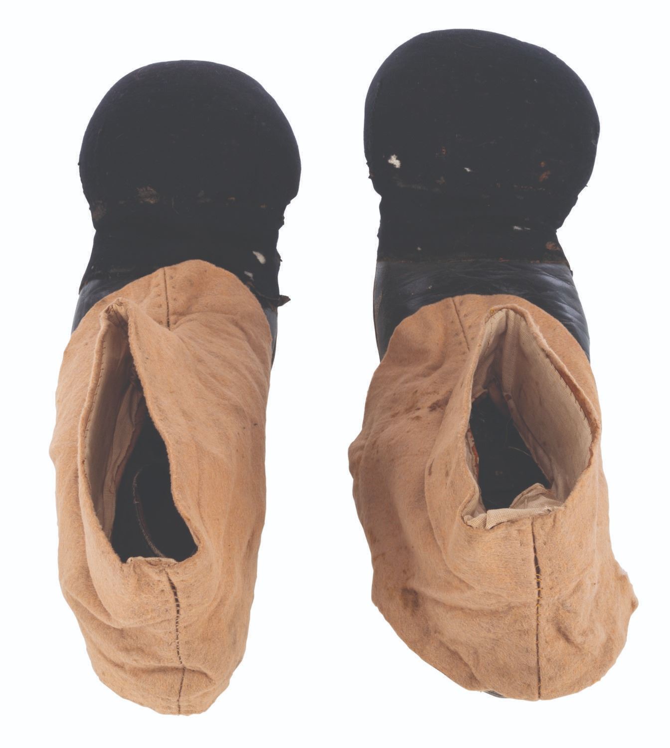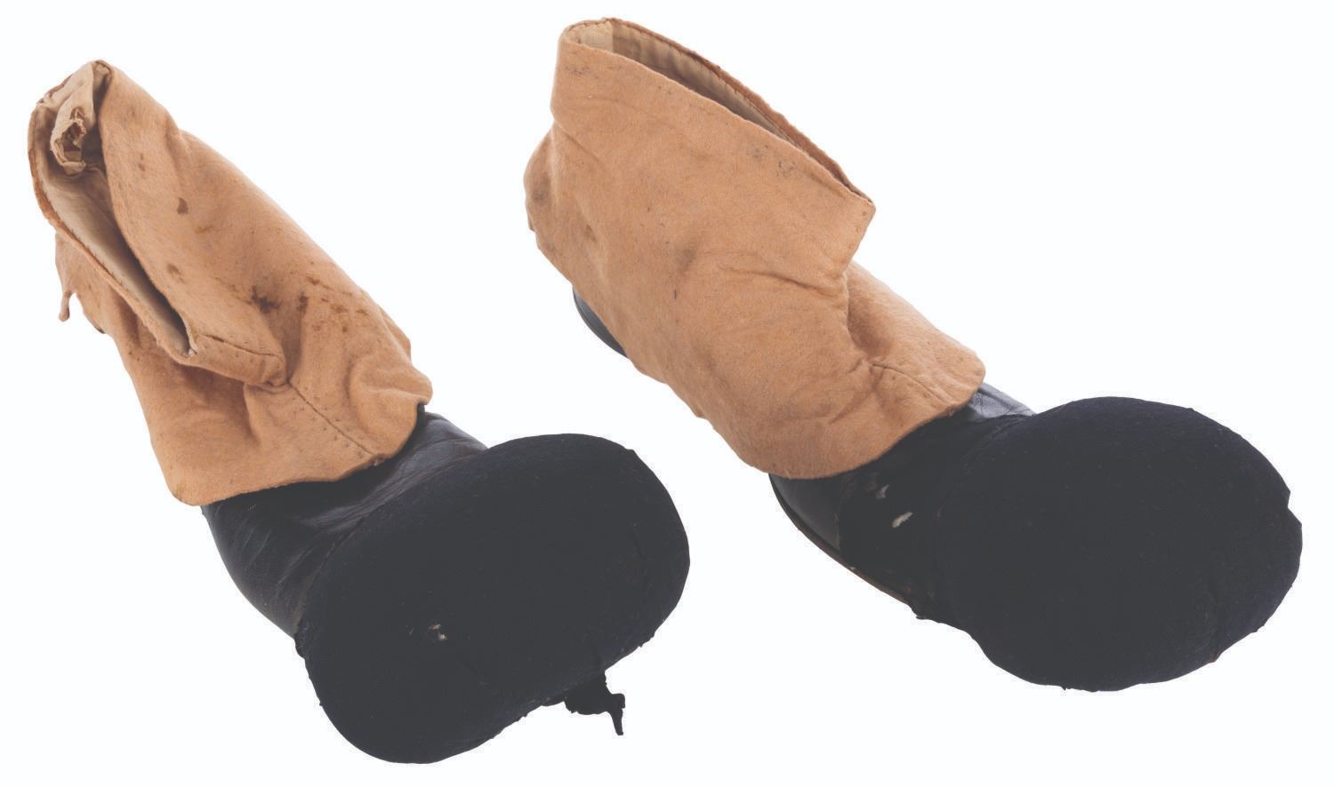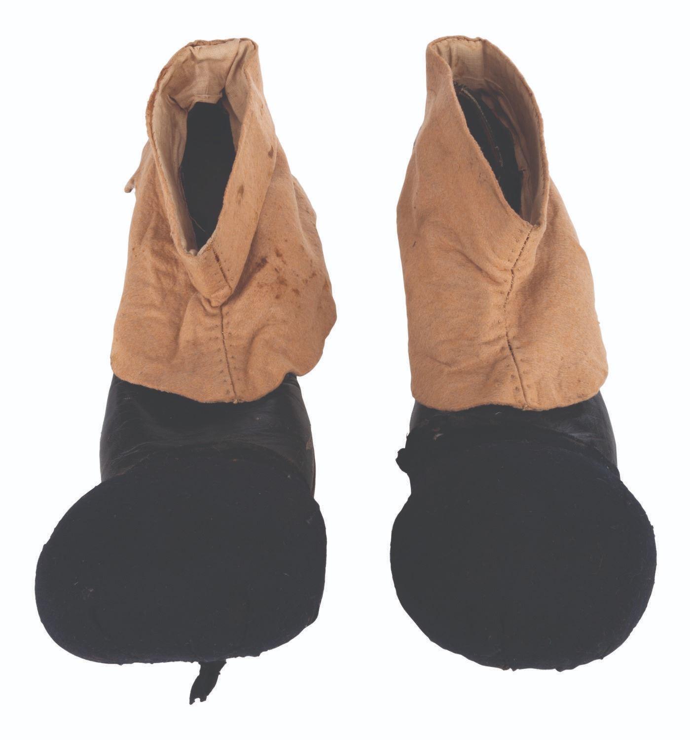 (Clampett, 1960s) A one of a kind walk around costume of Willy the Wolf. The head piece, constructed of cotton, nylon, velvet, felt, vinyl, terry cloth, wig hair, wire, and wood measures 16” x 10.5” x 9” tall and is in fair condition with paint cracking and adhesive residue on the nose, soiling and stains, and discoloration from age. The body which is constructed of linen, velvet, and terry cloth and measures 40” long and 16” from shoulder to shoulder is in poor condition with heavy deterioration to the hands, heavy soiling and staining to the cape including terrycloth residue from the hands from having adhered to and ripped from the fabric as well as intentional distress including rips and tears. The shoes are modified men’s shoes with felt spats which have detached and bulbus, cotton end caps and measure 13” x 4.25” wide are in poor condition with soiling, stains, and wear.