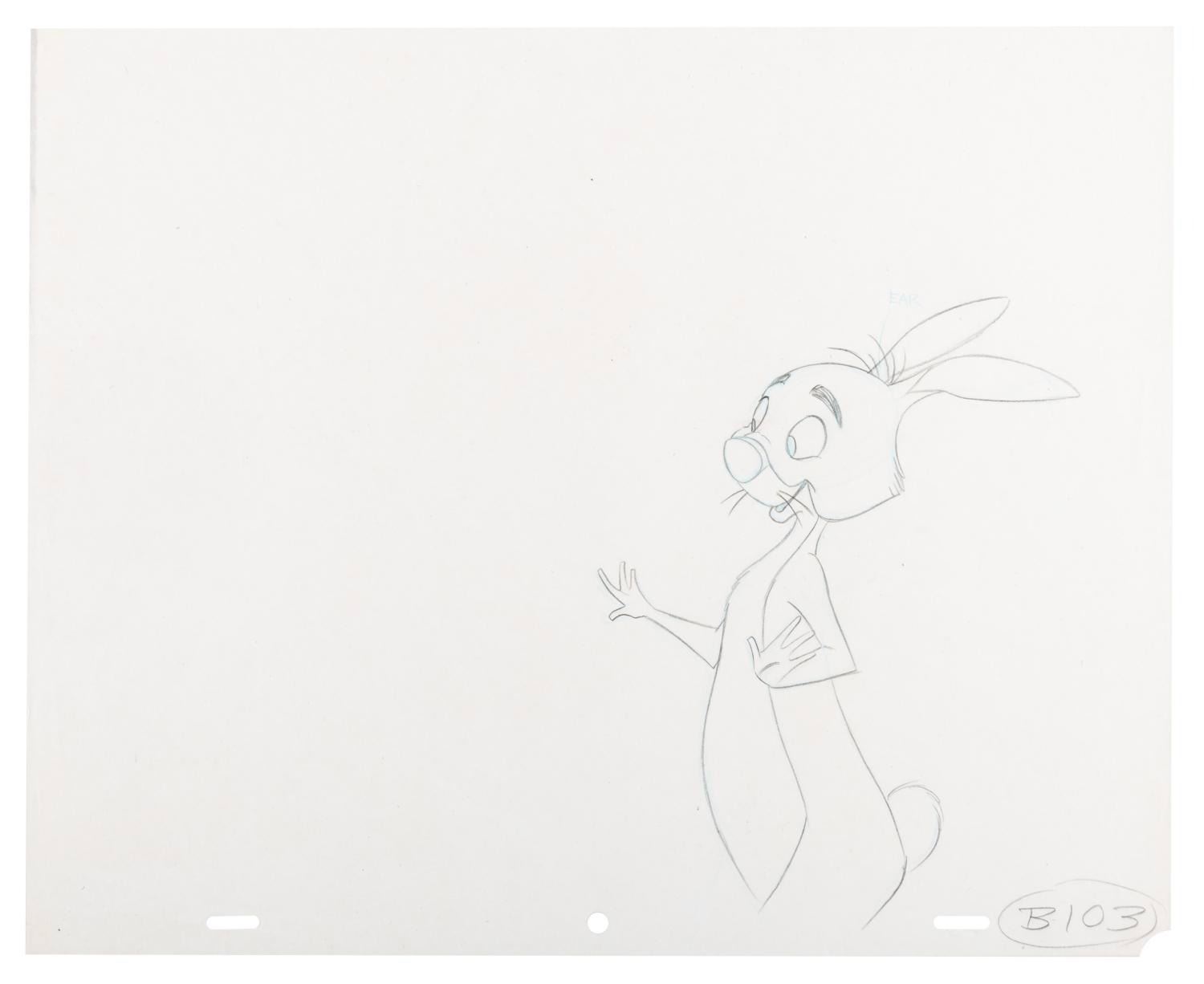 (Disney, 1970s-90s) A drawing of Rabbit from a Disney “Winnie the Pooh” production, accomplished in pencil. With a character image size of 5.25” x 7” on 10.25” x 12.5” animation paper, the art displays in very good condition with light creases and the bottom right corner torn off.