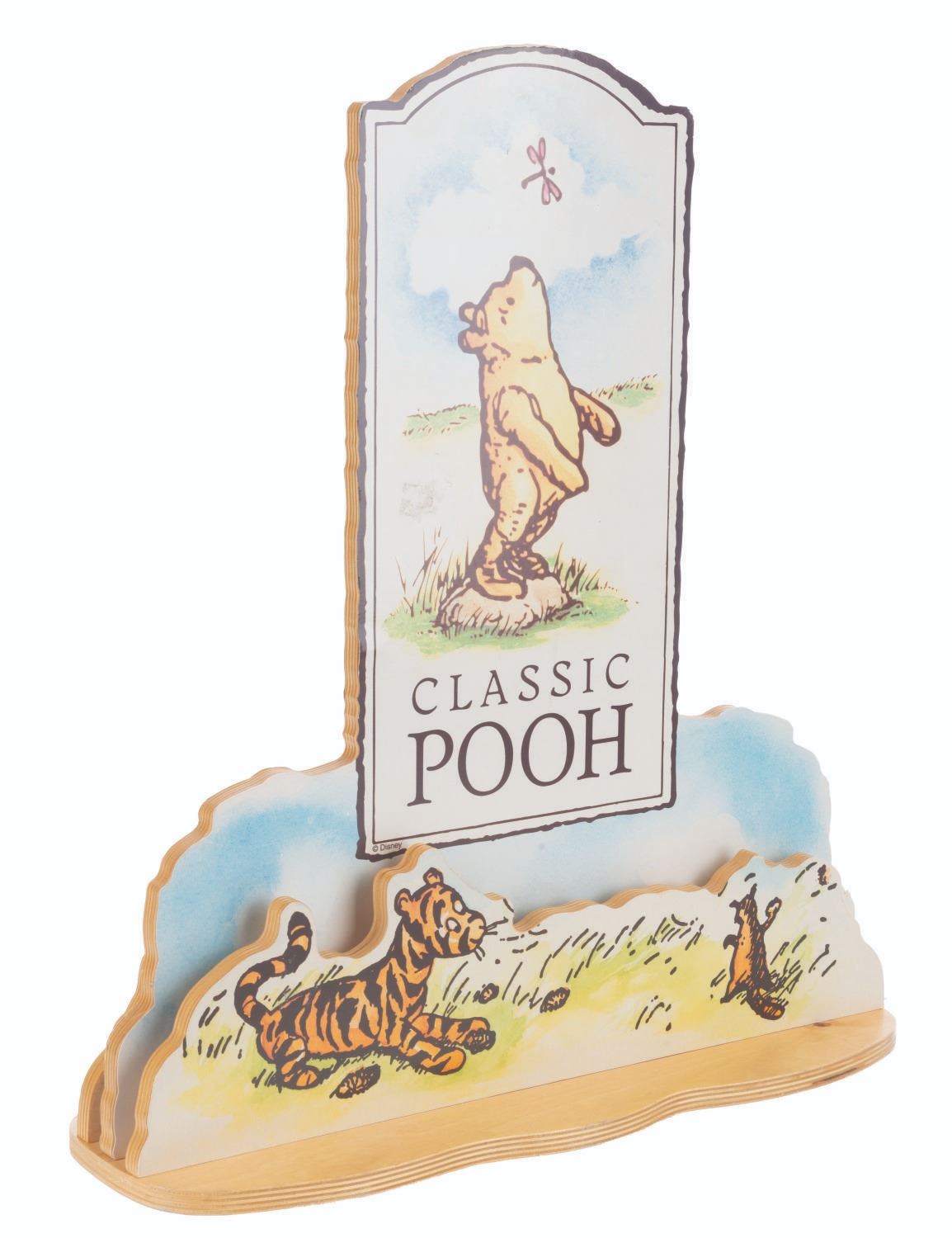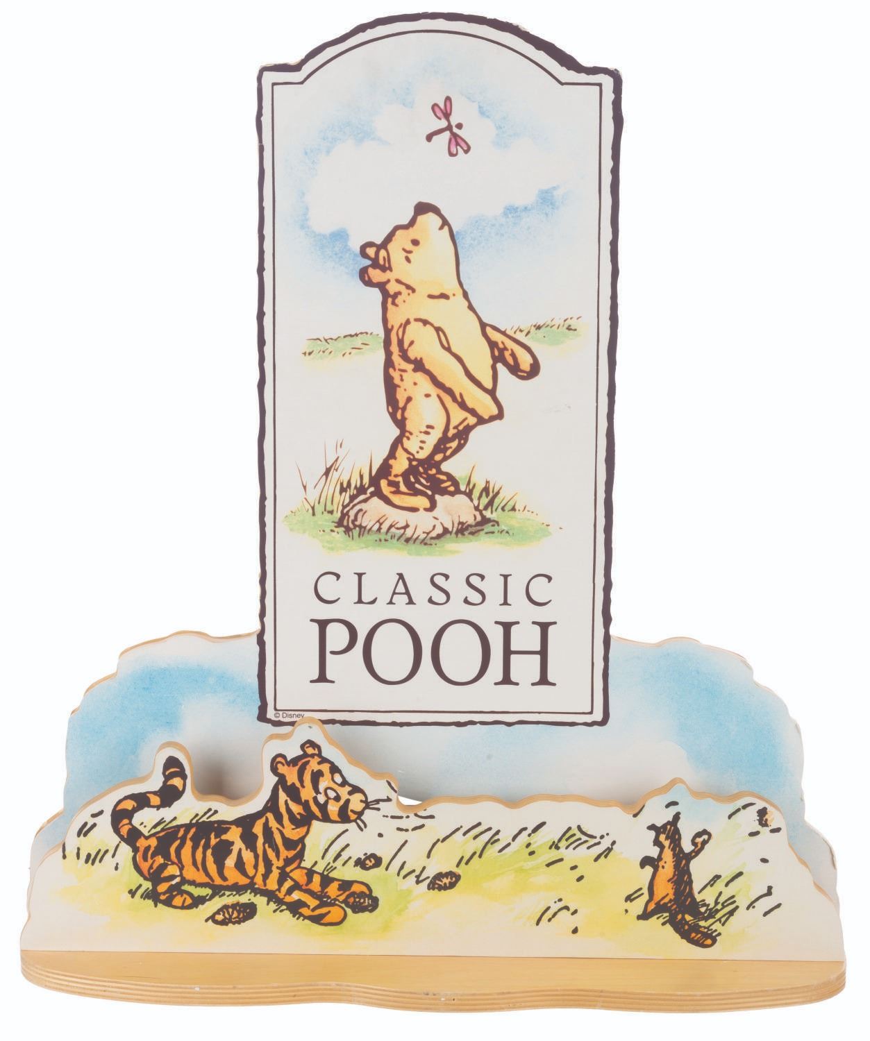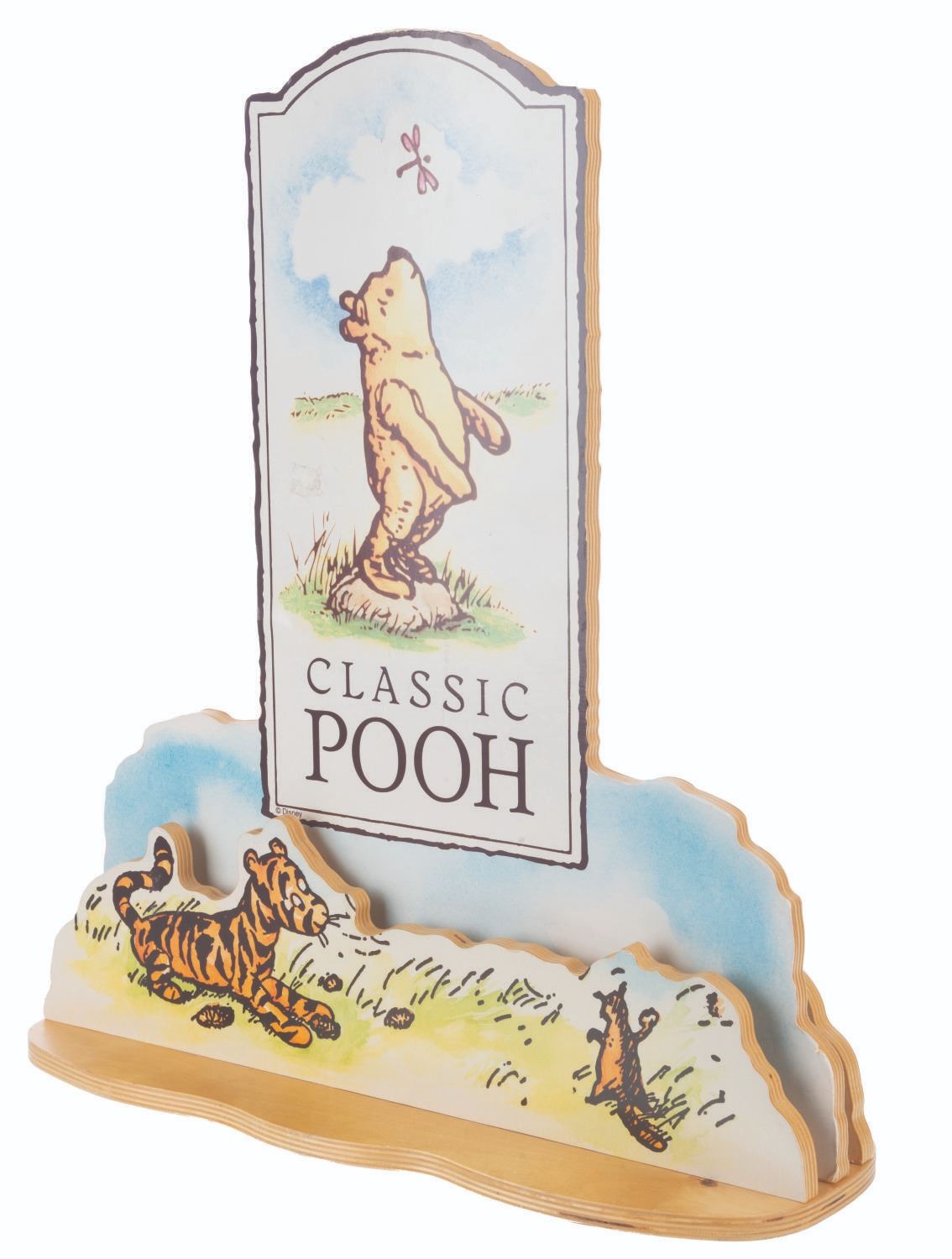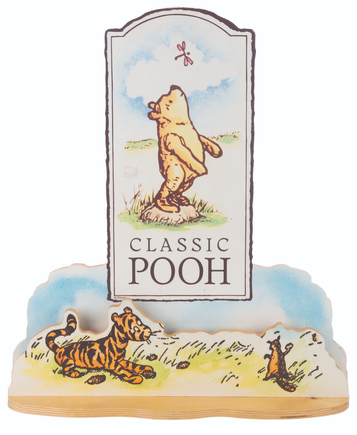 (Disney, 1990s-2000s) A Disney Store wooden countertop display for Classic Pooh merchandise based on the original illustrations by E. H. Shepard. Measuring 17.75” x 7” x 20.5” tall, the piece is in very good condition with light wear from display, mainly to the edges.