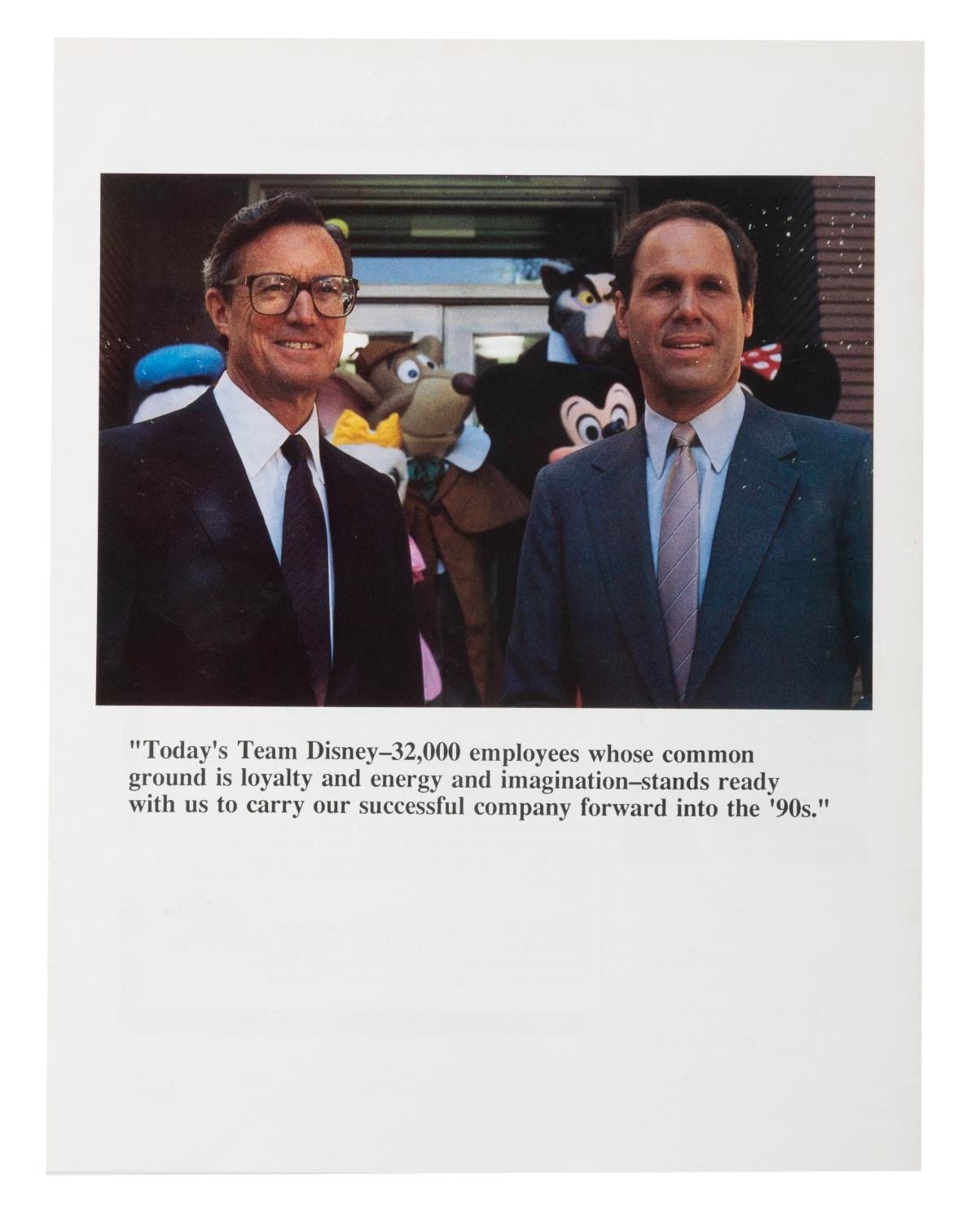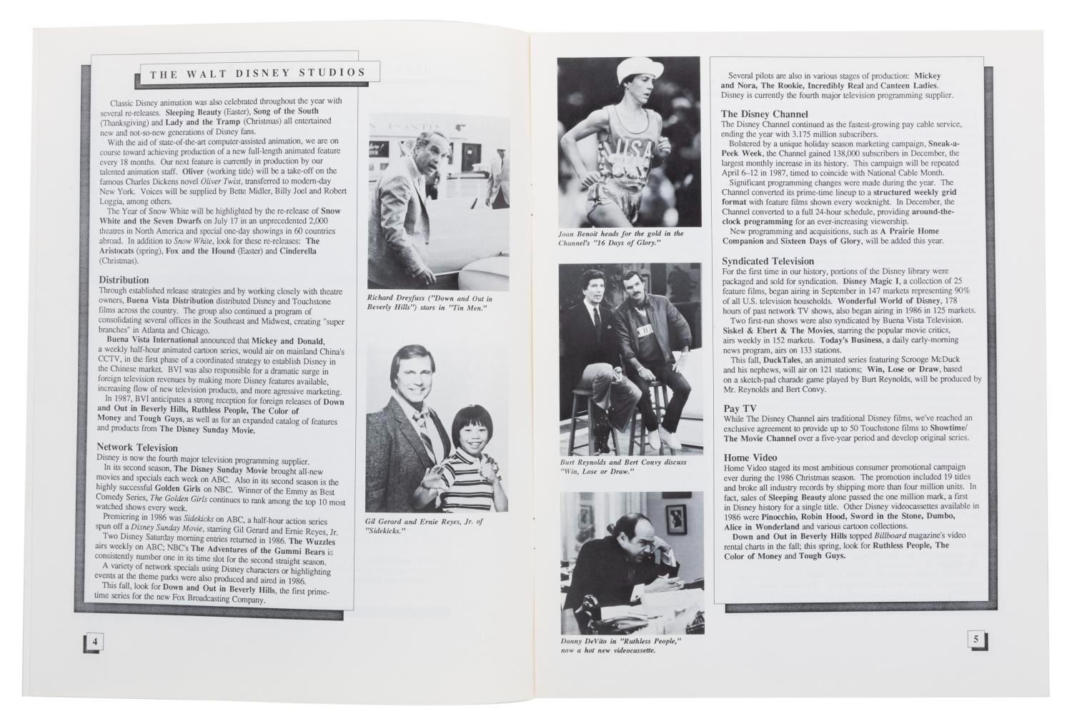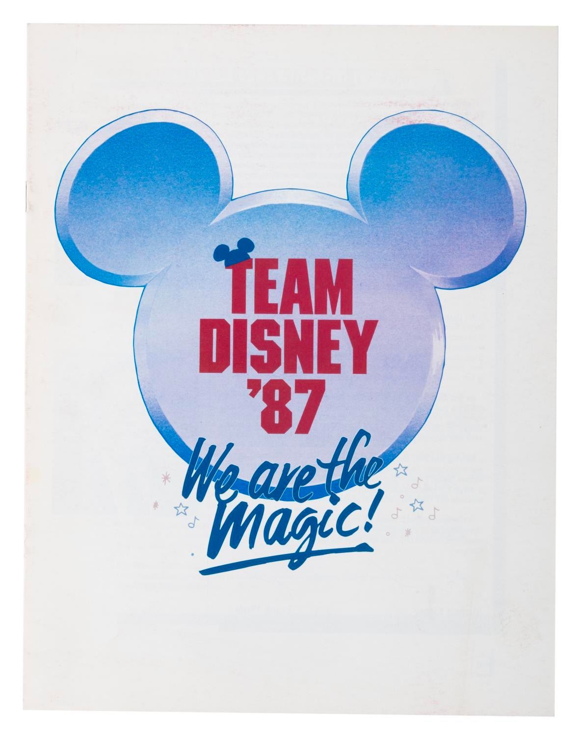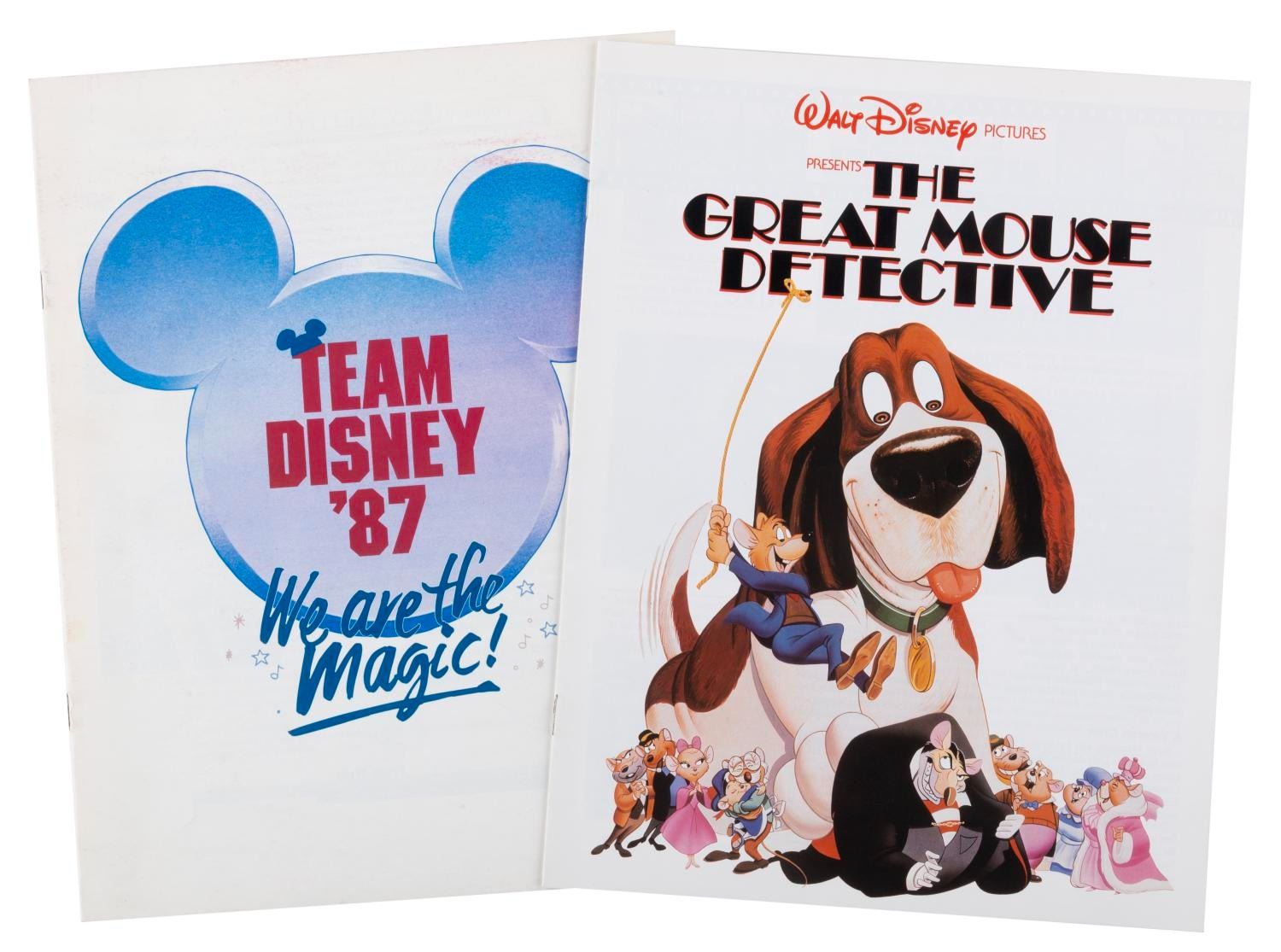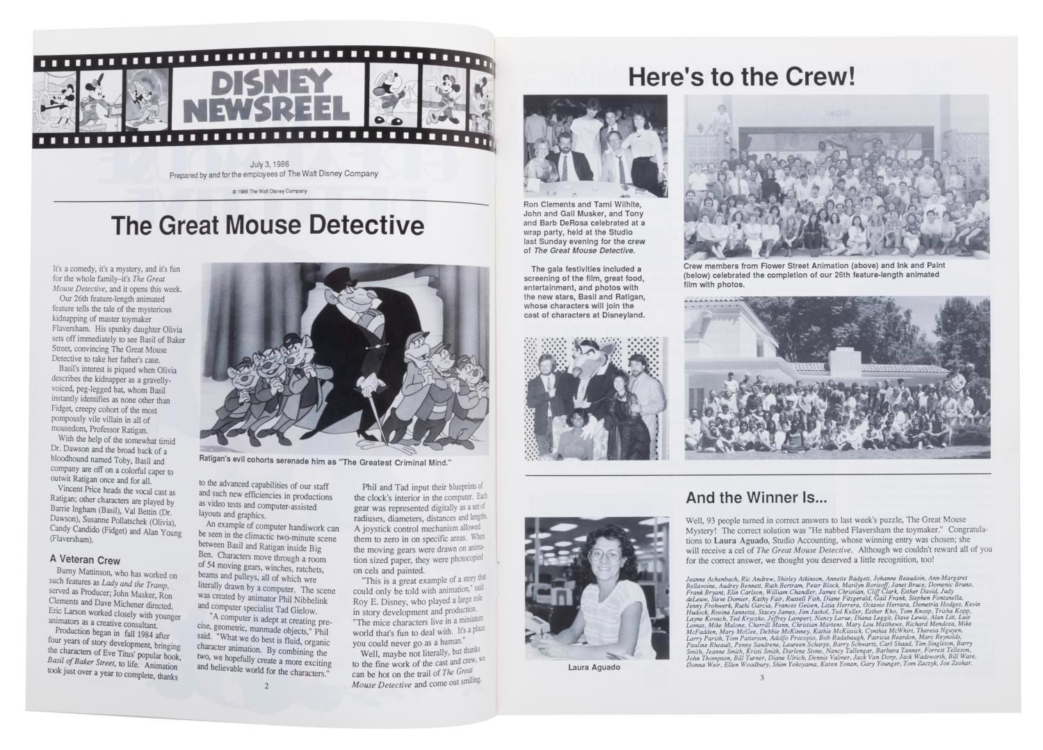 (Disney, 1986-87) A pair of Disney Studio Cast Member magazines. Included are a July 3, 1986 issue of the Disney Newsreel Studio lot newsletter with a cover story on"The Great Mouse Detective," and a"Team Disney ‘87" employee forum overview of the Company. The Newsreel is in very good condition, with the form booklet in good condition with areas of wear and discoloration to the cover.