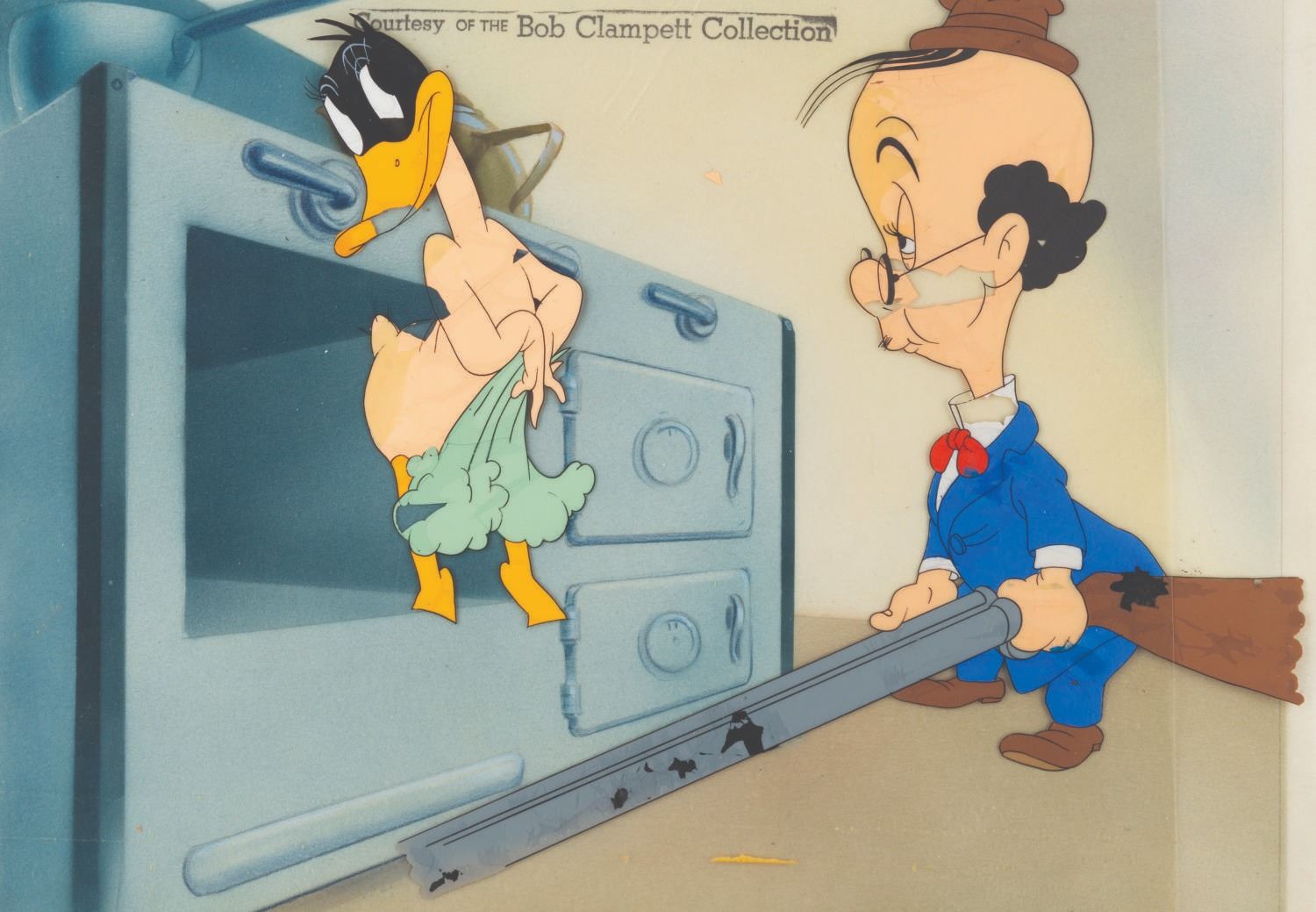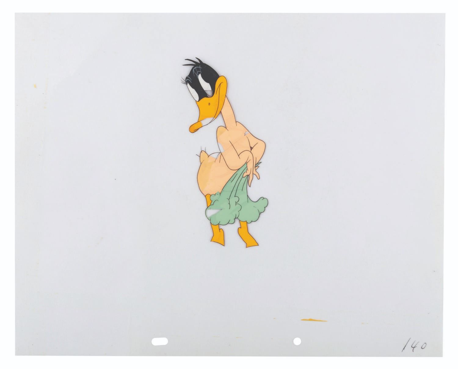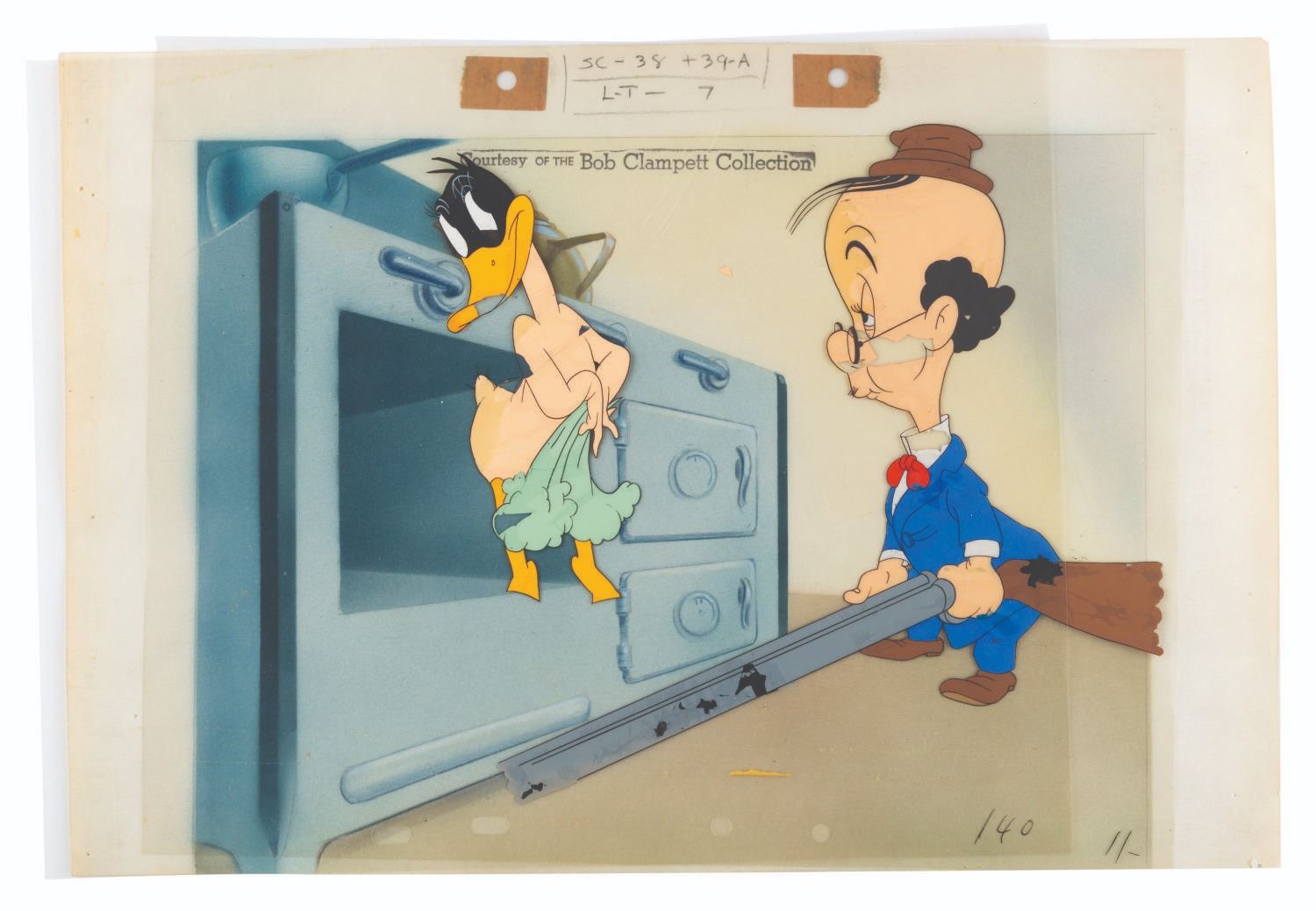 (Schlesinger, 1943) A pair of production cels of Daffy Duck and Mr. Meek with an original background from the Looney Tunes cartoon “The Wise Quacking Duck,” directed by Bob Clampett. With character image sizes of 2.5” x 5.5” and 8” x 8”, the 10” x 12.25” cels display in fair condition with large spots of paint loss to both characters. The original background accomplished in gouache has an image size of 8.75” x 11.5” on 10” x 14.5” art paper and is in very good production-used condition, and stamped “Courtesy of Bob Clampett Collection.”