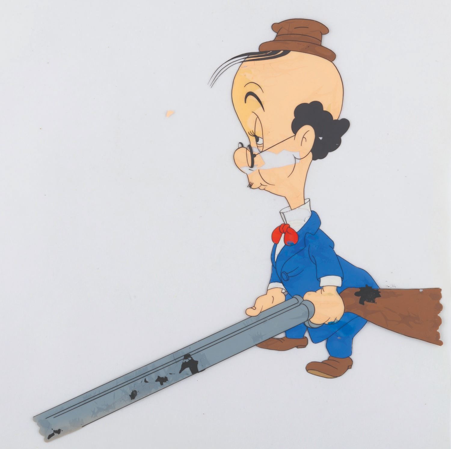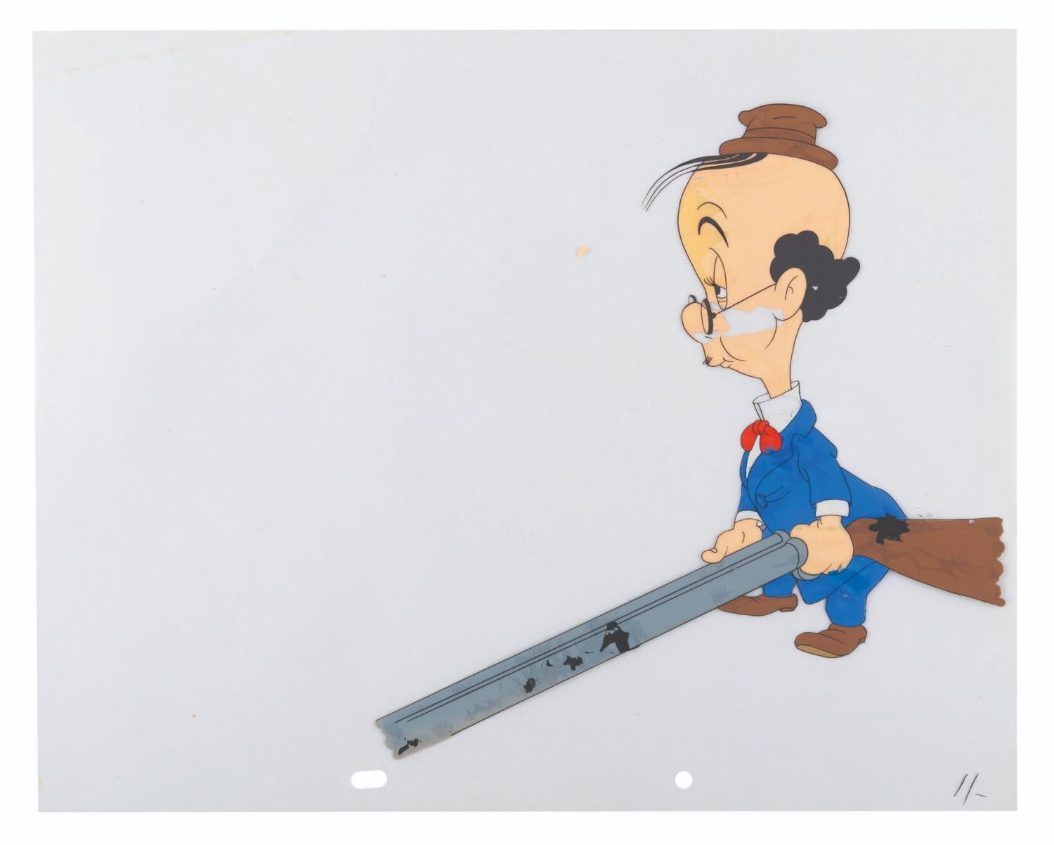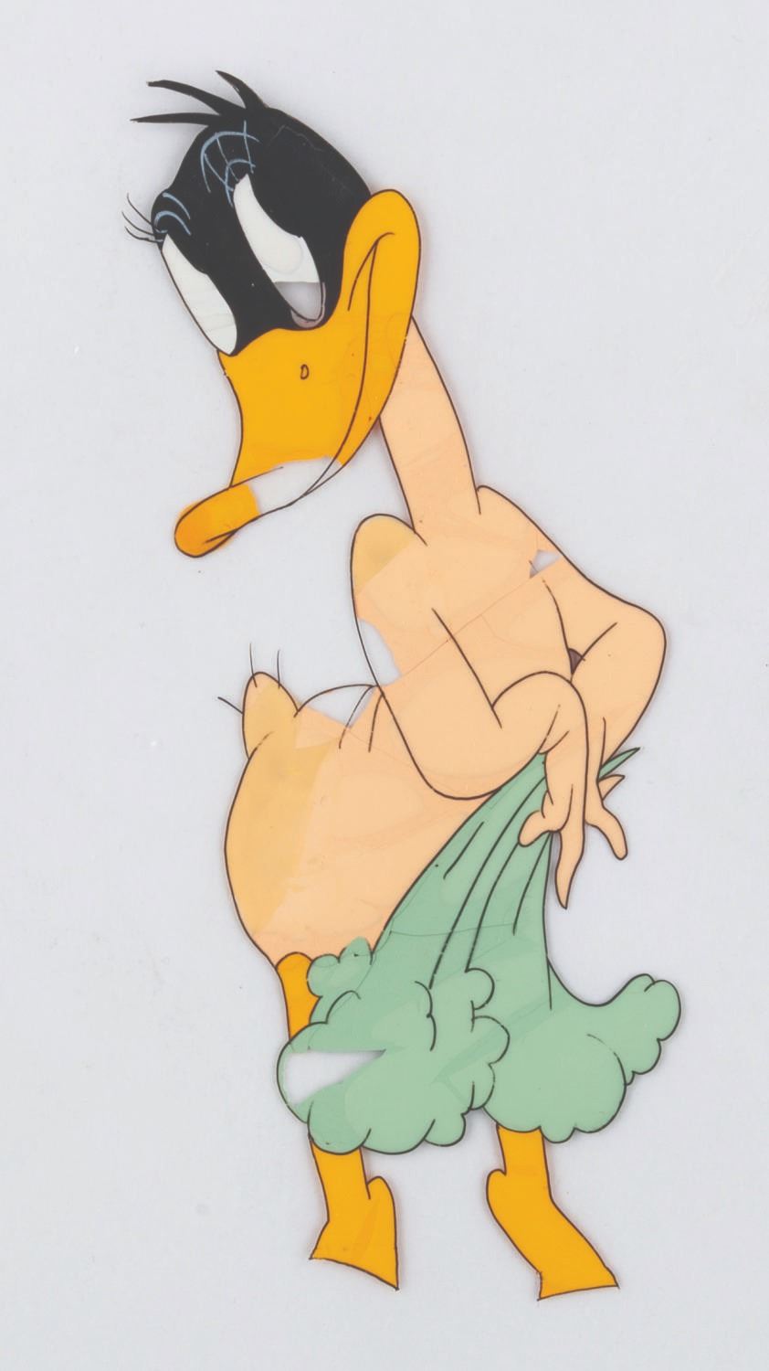 (Schlesinger, 1943) A pair of production cels of Daffy Duck and Mr. Meek with an original background from the Looney Tunes cartoon “The Wise Quacking Duck,” directed by Bob Clampett. With character image sizes of 2.5” x 5.5” and 8” x 8”, the 10” x 12.25” cels display in fair condition with large spots of paint loss to both characters. The original background accomplished in gouache has an image size of 8.75” x 11.5” on 10” x 14.5” art paper and is in very good production-used condition, and stamped “Courtesy of Bob Clampett Collection.”