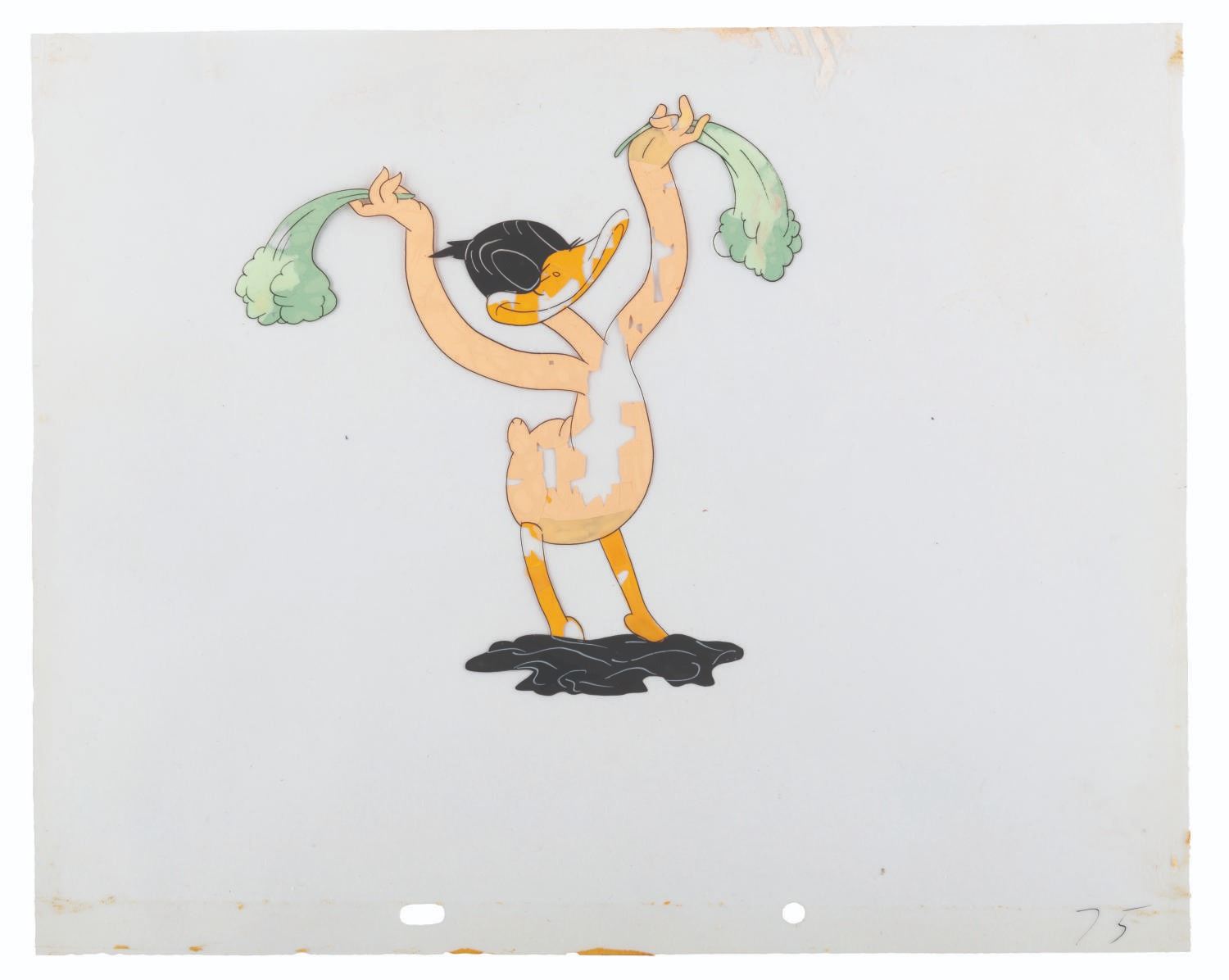 (Schlesinger, 1943) An original production cel from the Looney Tunes cartoon “The Wise Quacking Duck,” directed by Bob Clampett. With a character image size of 6” x 6.25”, the 10” x 12.25” cel is in fair condition with large areas of paint loss throughout.