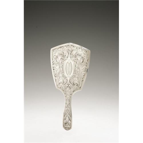 <B>An American Silver Hand Mirror</B></I><BR><B>Wm. B Kerr & Co., Newark, NJ, Late Nineteenth Century</B></I><BR><BR>Monogram to the reverse <I>HM,</B></I> hallmark to the side with <I>STERLING 4100</B></I><BR>10in. long x 4.8in. wide