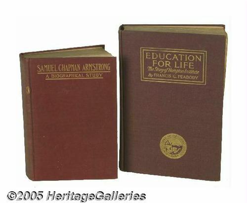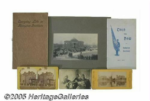 <B>A Wonderful Group Lot from the Hampton Institute! </B></I> A 7.5" x 4.5" photograph from the dedication of a new library at the Hampton, on a 12" x 10" board. Also, a 31-page pamphlet entitled <I>Then and Now at Hampton Institute, 1868 - 1902,</B></I> published by the Hampton Institute Press, 1902. The booklet contains numerous photographs, slight foxing on cover, else fine. Also, a 32-page pamphlet entitled <I>Everyday Life at Hampton Institute</B></I> reproducing twenty-nine, captioned, printed photographs by the Hampton Camera Club in 1907. Together with a real-photo postcard and two stereoviews, both depicting buildings at the Hampton Institute, one has a crowd posed in the foreground. Together with a carte de visite with two men looking at a book, a woman also looks on, titled <I>Neighborhood Work Hampton Institute, Va.</B></I> Also in the lot is a copy of <I>Samuel Chapman Armstrong -- A Biographical Study</B></I> by Edith Armstrong Talbot, 301 pages, (Doubleday, Page & Company, New York: 1904). The book, a biography of the founder of the Hampton Institute by his daughter, includes numerous illustrations. Also, a copy of a scarce work: <I>Education for Life, The Story of Hampton Institute</B></I> by Francis G. Peabody (Doubleday, Page & Company, New York: 1918). This illustrated volume was produced in connection with the 50th anniversary of the foundation of the Institute. Together, eight items in total. A fine collection related to this most important seat of learning. Lot:250