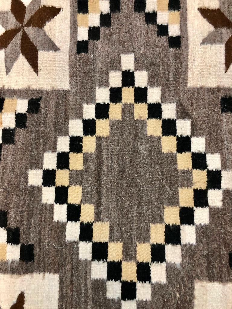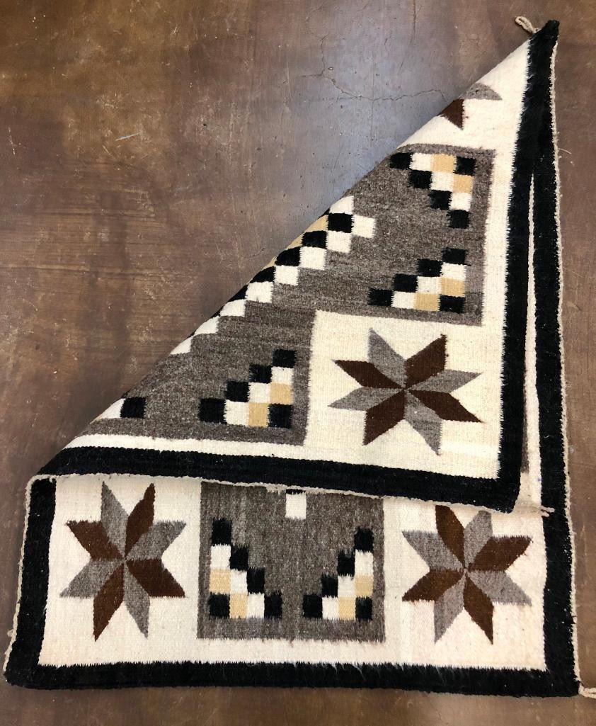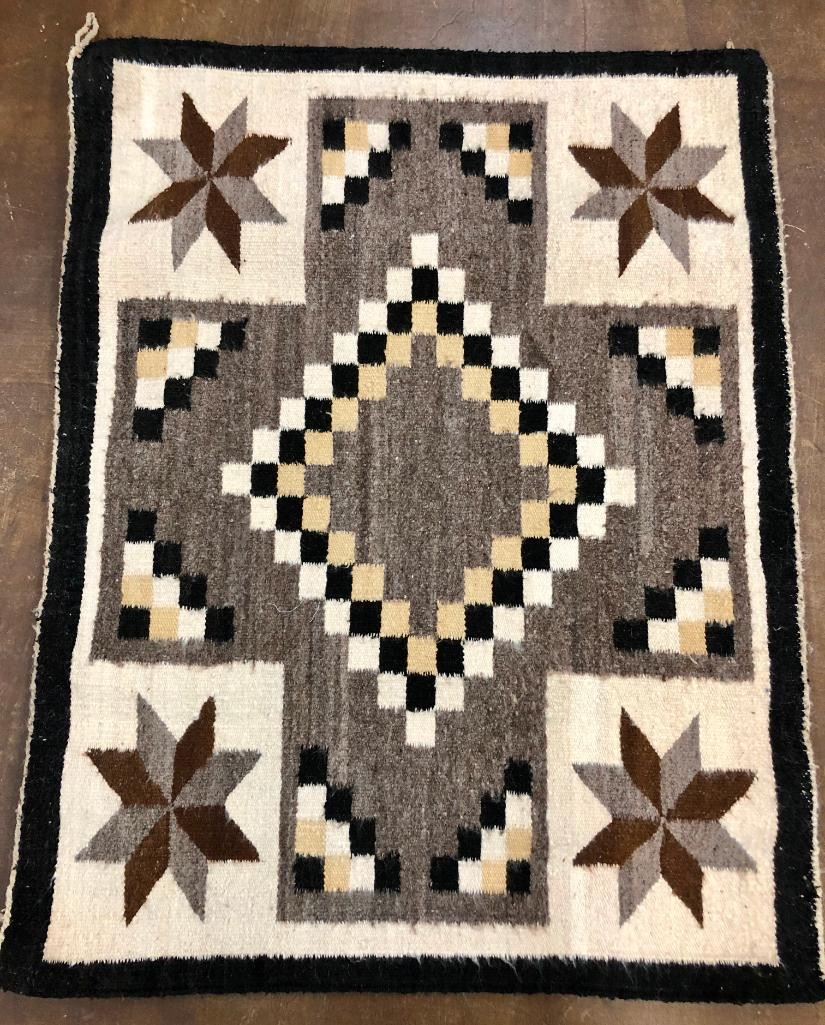 For sale in this lot is a wonderful Navajo textile woven in a unique design featuring blacks, grays, whites and browns with the Valero star in each corner. This textile displays nicely. Maker: Unknown Navajo weaver. Approx. Age: Fairly modern. Size: 27-1/2 inches wide X 35-1/2 inches long. Condition: Good for its age, minimal wear expected. Please look closely at the pictures - they are an important part of our description. Shipping: There will be a $5 handling / packaging fee for shipping this lot. The actual cost of postage will be added on top of that. BUY IT NOW: If you would like to buy this item now without waiting for the auction to end (this option is only available up to 48 hours before the auction starts to close), the “Buy it Now” price is the high estimate of this lot. If you would like to end the auction early and pay the high estimate (plus applicable fees), please contact us by phone or email and reference this lot number.
