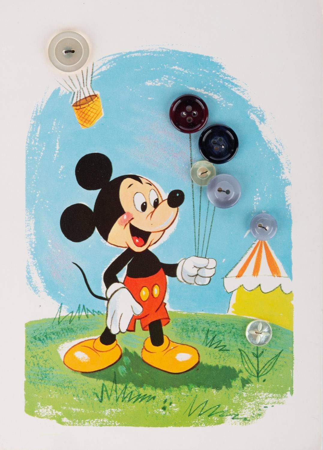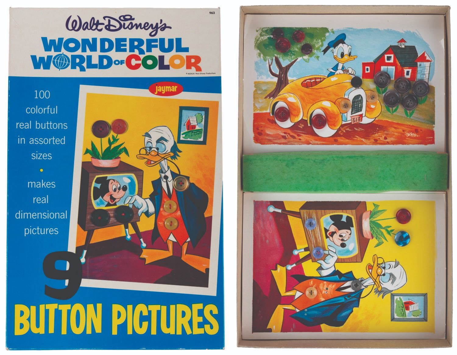 (Jaymar, 1961) A "Walt Disney's Wonderful World of Color 9 Button Pictures" buttoncraft toy, including nine pictures, five used and four unused, and 80 loose buttons. Measuring 10" x 16" and 1.5" thick, the box and interior items are in very good condition with handling wear and paper loss around the box edges.