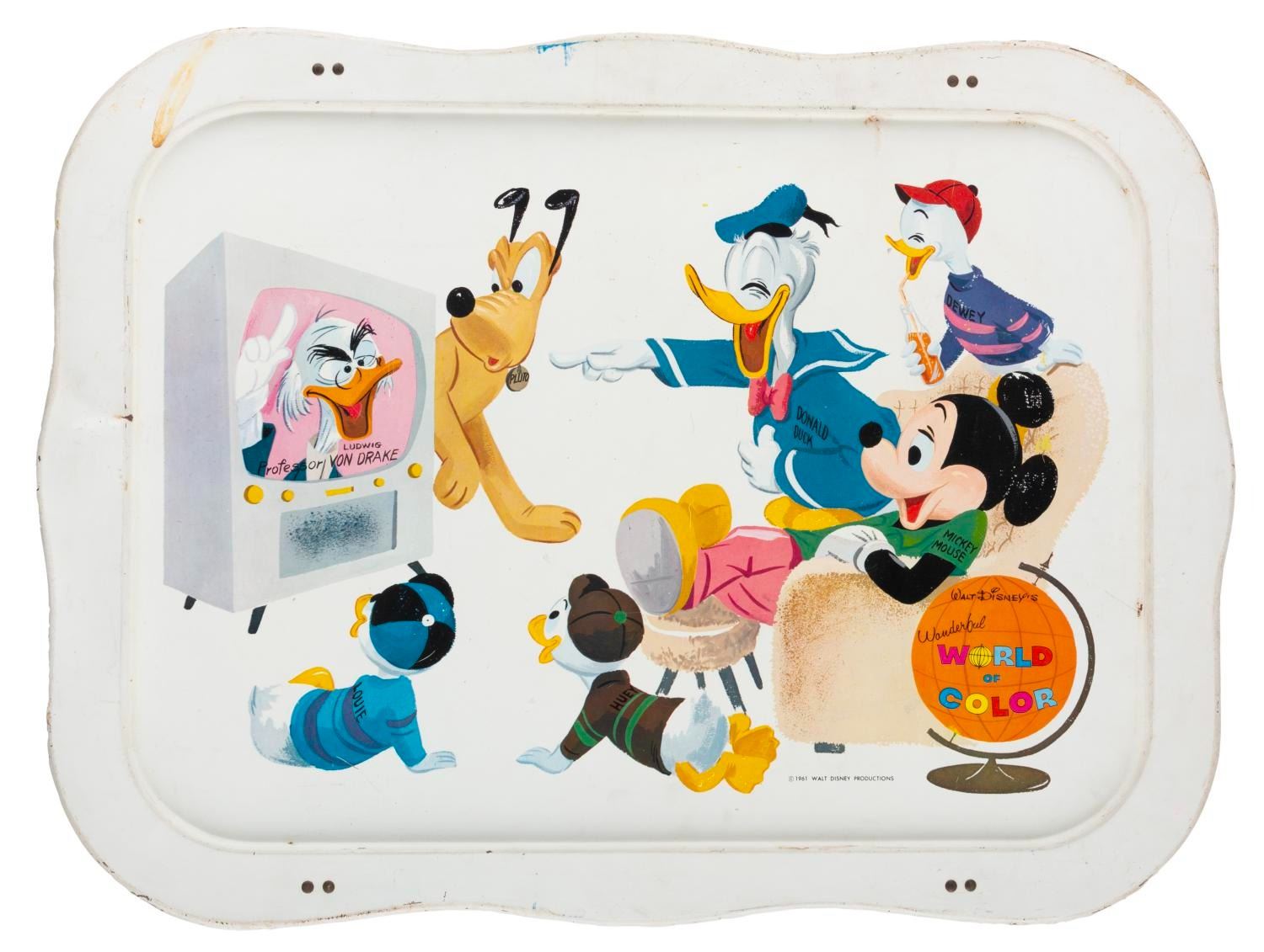 (Disney, 1961) A large tin-litho TV tray of "Walt Disney’s Wonderful World of Color," featuring Mickey, Pluto, Donald and his nephews, and Ludwig Von Drake. Measuring 12.5" x 17.5", the tray displays in good condition with small spots of wear and oxidation, a stain in the upper left, and a dent in the edge of the left side. The back has four plastic brackets to attach to a stand, one of which is broken.