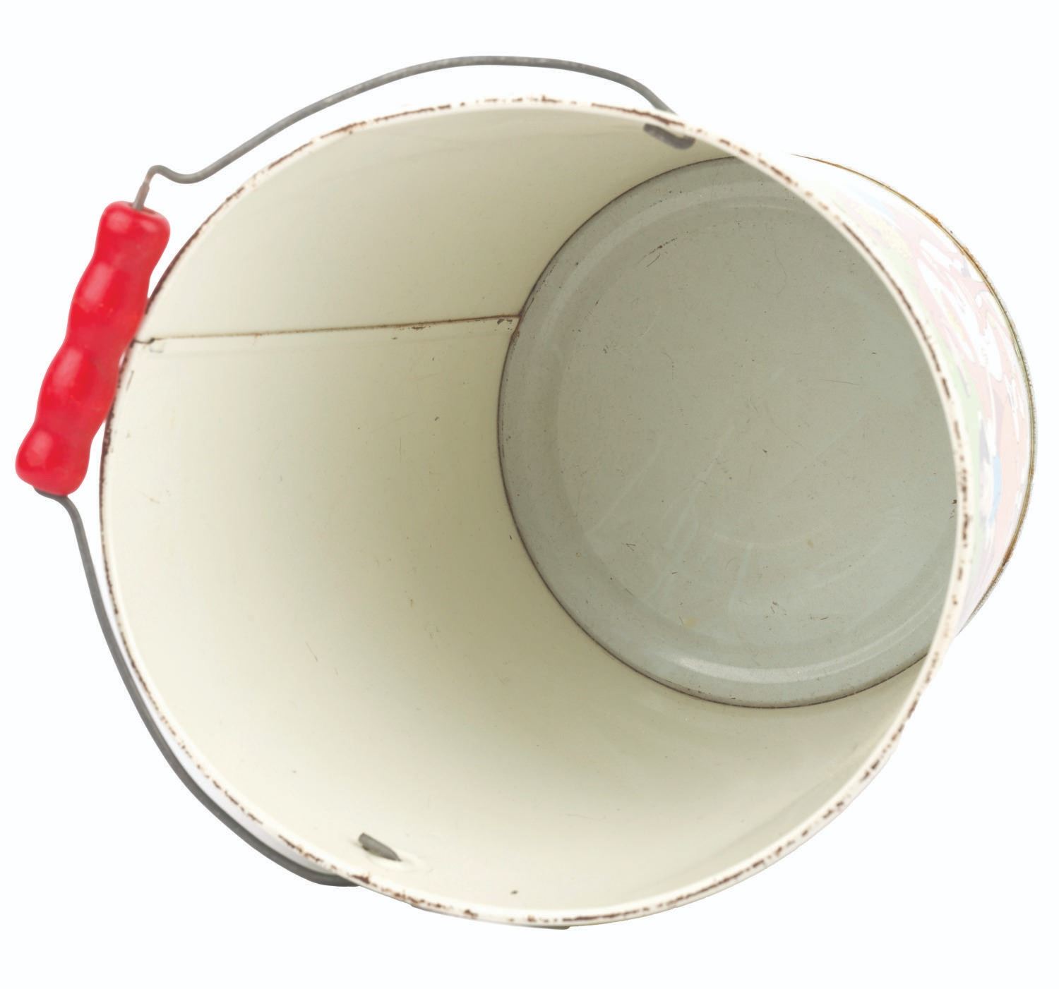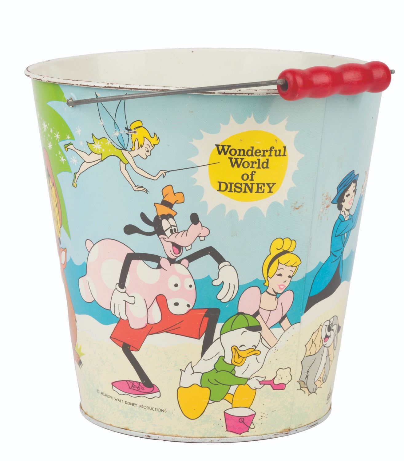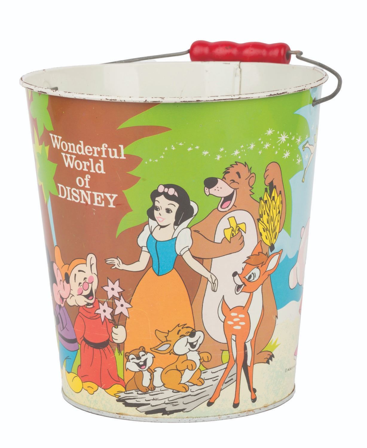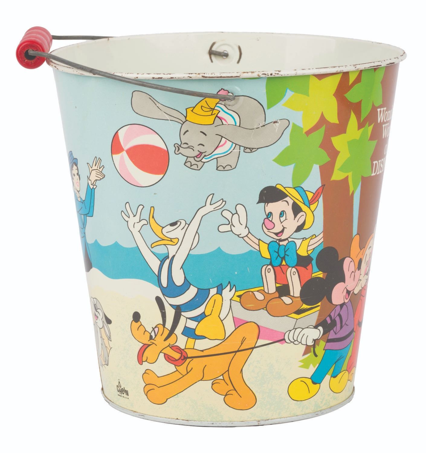(Chein, 1966) A tin-lithographic toy pail celebrating the "Wonderful World of Disney" with characters including Mickey Mouse, Mary Poppins, and Baloo. Measuring 8" tall x 8.75" in diameter, this pail is in good condition with denting, scuffs, and wear.
