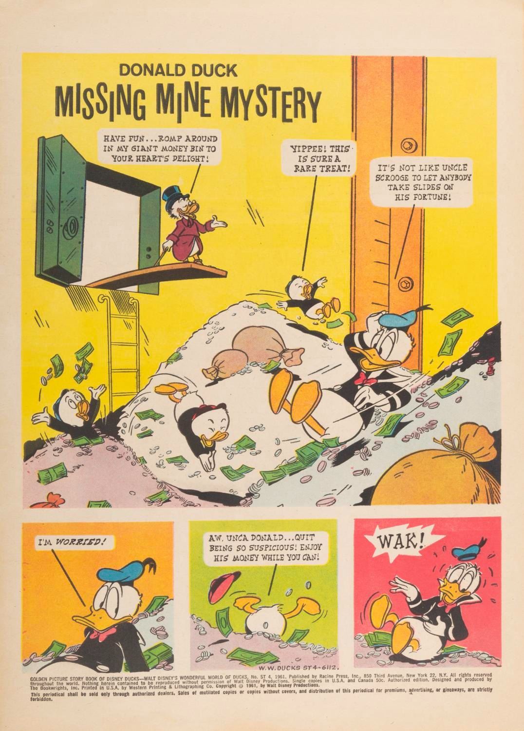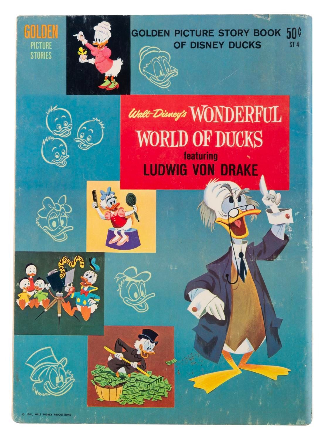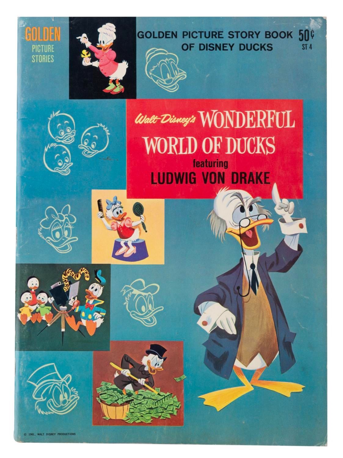 (Racine Press, 1961) A Walt Disney's Wonderful World of Ducks featuring Ludwig Von Drake story book, featuring comic book-style stories inside. Measuring 10.25" x 14", the book is in good condition with creases, edge wear, and light discoloration from age.
