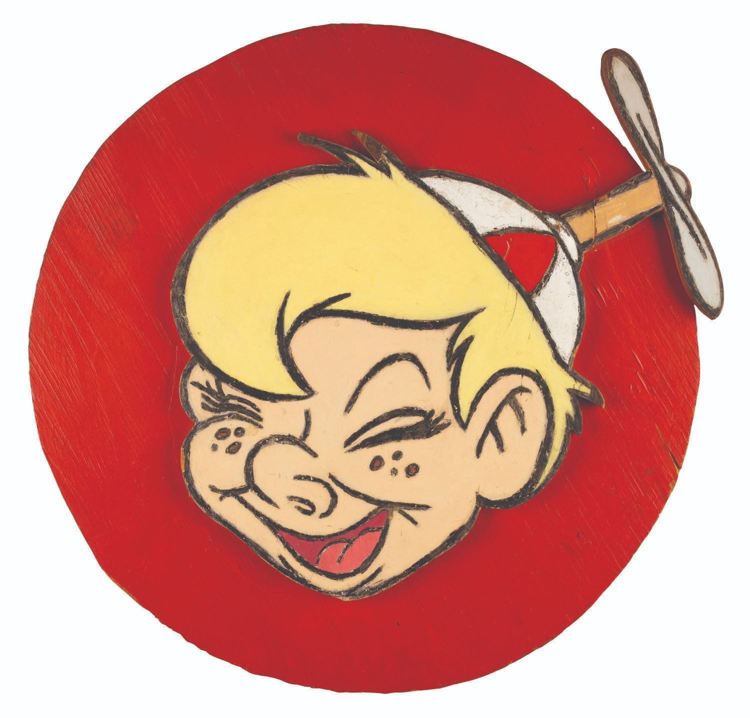 (Clampett, 1960) A custom wooden sign of Beany that hung on the front of Bob Clampett’s poolside bar at his home. This was one of many cut-outs of characters that he used to decorate his backyard. Measuring 16” in diameter and 0.25” thick, the wooden sign is in good condition light chips, paint cracks, and color fading from age.