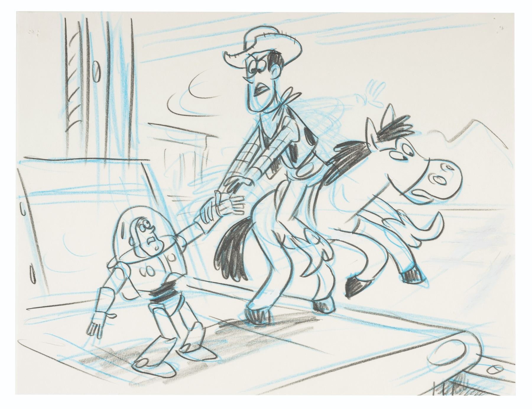 (Pixar, 1999) An original production used storyboard panel of Woody and Buzz Lightyear from “Toy Story 2” by Jorgen Klubien. Accomplished in graphite and colored pencil, the panel measures 8.5” x 11” and is in very good condition with small pinholes from production.