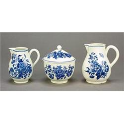 A Worcester blue and white baluster sparrow-beak jug, printed in blue with floral sprays and insects, 11cm high, crescent mark; Another Worcester blue and white sparrow-beak jug, printed with the 'Fence' pattern, 10cm high, blue crescent mark; and a Worcester sugar bowl and a cover, printed with floral sprays and insects, blue crescent mark, circa 1775-80 (see illustration) £150-250
