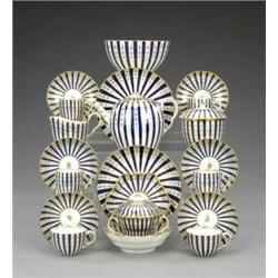 A Worcester part tea and coffee service, the vertical stripes of dark blue alternating with gilt pendant husks, comprising circular teapot, cover and stand, sugar bowl and cover, cream jug, bowl, ten tea cups, five coffee cups, ten saucers, two saucer dishes, late 18th century See: G. A. Godden, Caughley And Worcester Porcelains, 1775-1800, pl.310