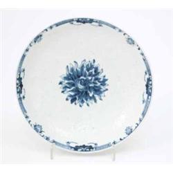 A Worcester saucer dish, painted with central flower in underglaze blue and bordered by moulded design of flower scrolls, open crescent mark, circa 1768, 7in. £250-300