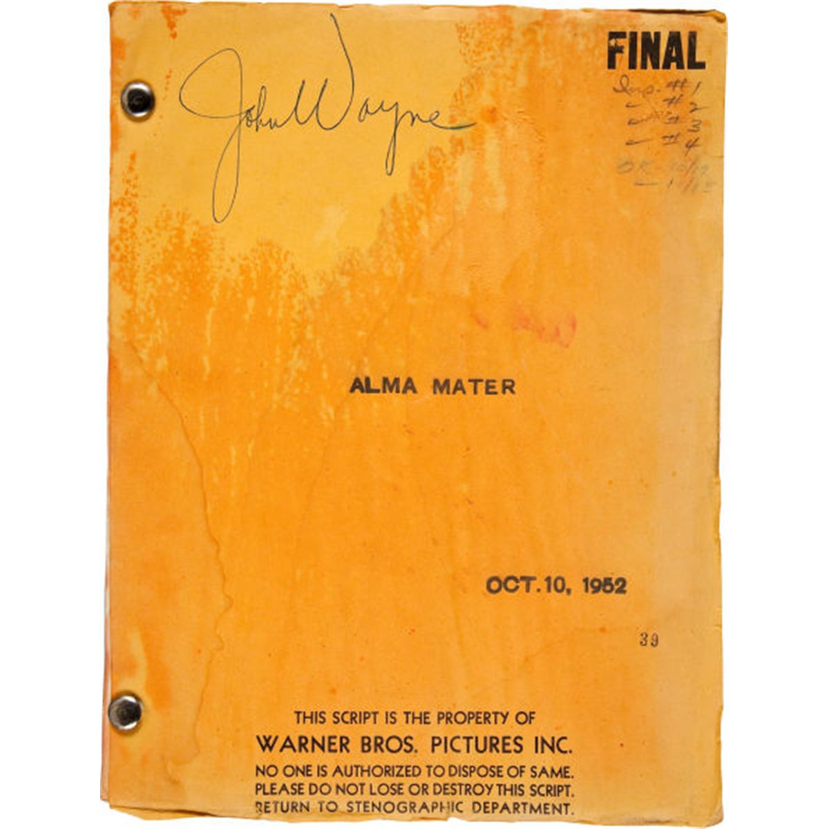 A Working Script from "Trouble Along the Way." Warner Bros., 1953. Goldenrod covers, screen play by Melville Shavelson and Jack Rose, ownership signature penned in upper left corner of cover reads "John Wayne," noting working title of "Alma Mater," dated "Oct. 10, 1952," marked "Final," 129 pages, with numerous colored script change pages throughout, a number of pages folded in half by Wayne as was his habit with scripts he used on set, no annotations. (Please note there is water damage to the covers but inside pages are not affected.)11" x 9"