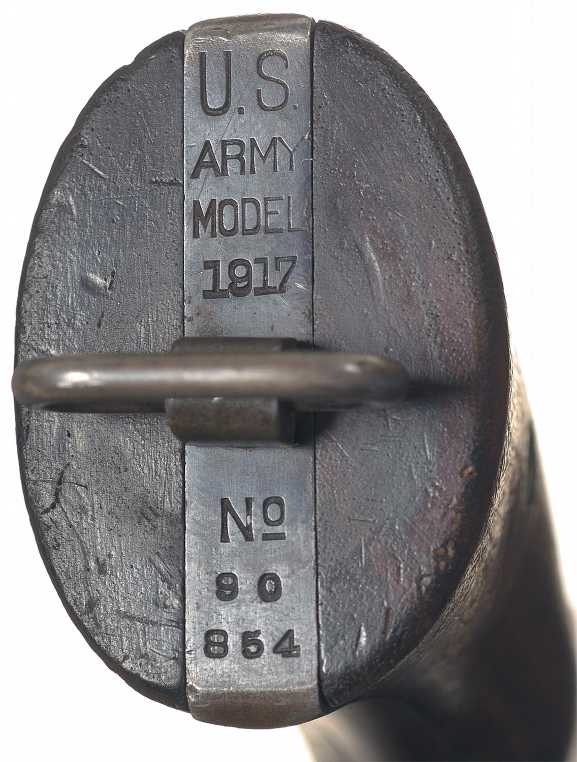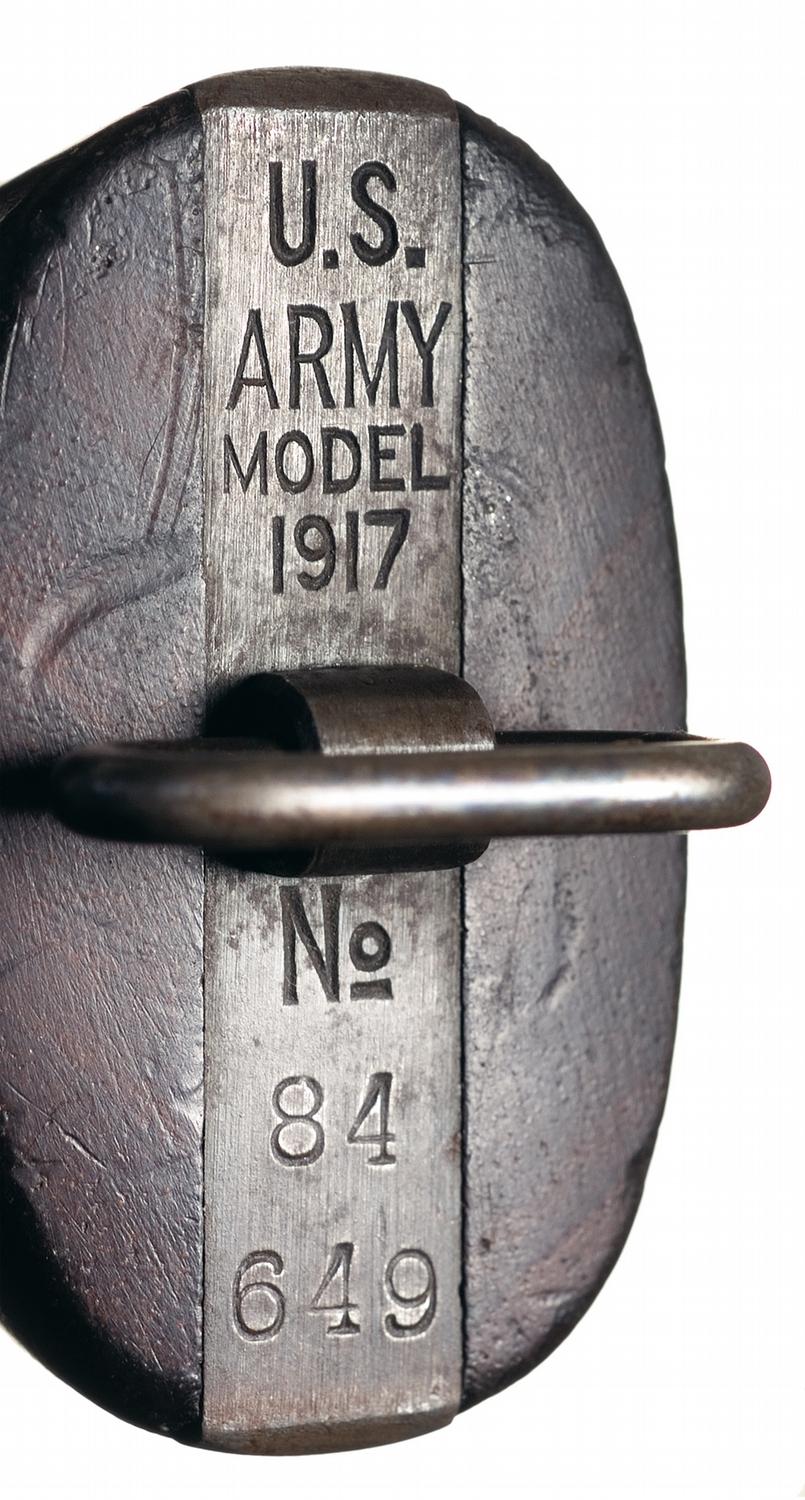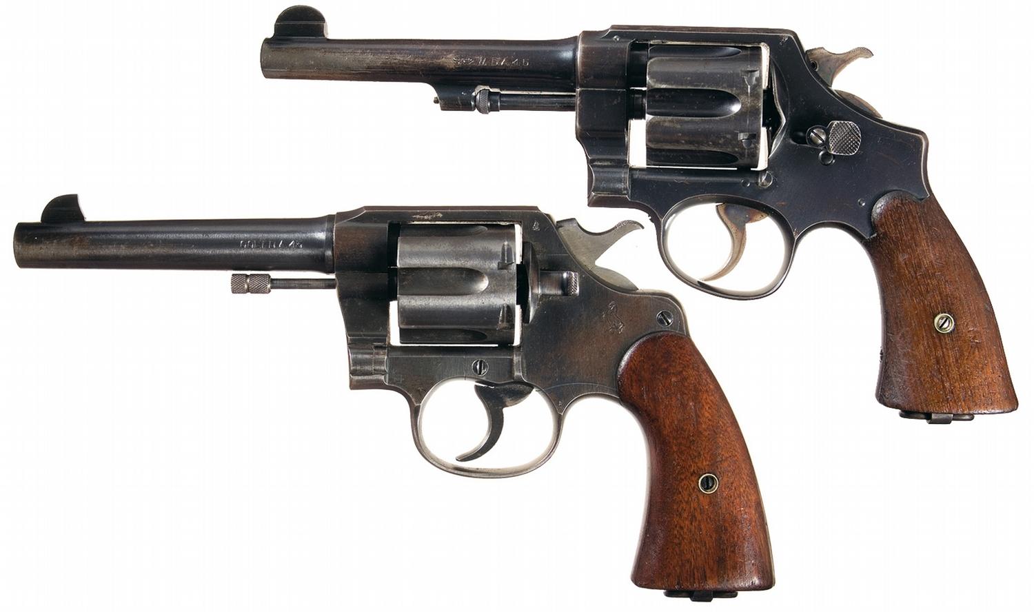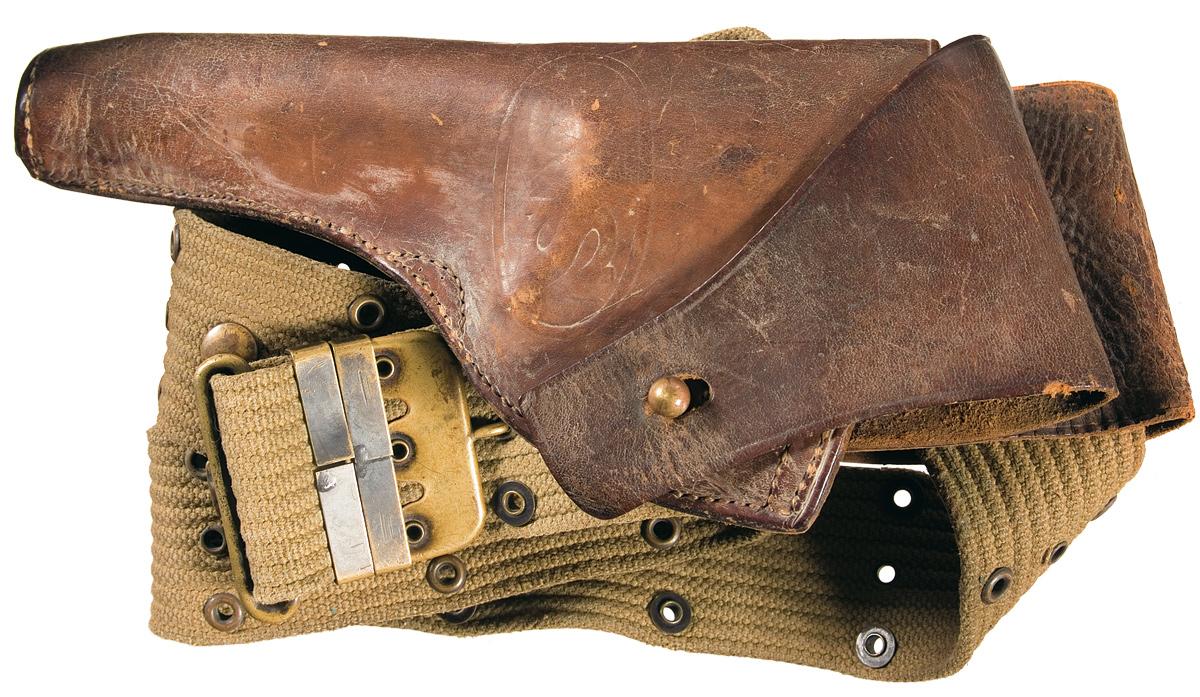 A) Barrel has the two line address/1901-1909 patent date marking with "S&W D.A. 45" on the left side, and "UNITED STATES PROPERTY" on the underside. The upper left rear of the frame is stamped with the flaming ordnance bomb and the butt has the four line U.S. Army model marking. Fitted with smooth grips and lanyard ring on the butt. With a "US" embossed holster ("C&K /1017 / AG" on belt loop) and web belt (marked "RM CO / 1942").