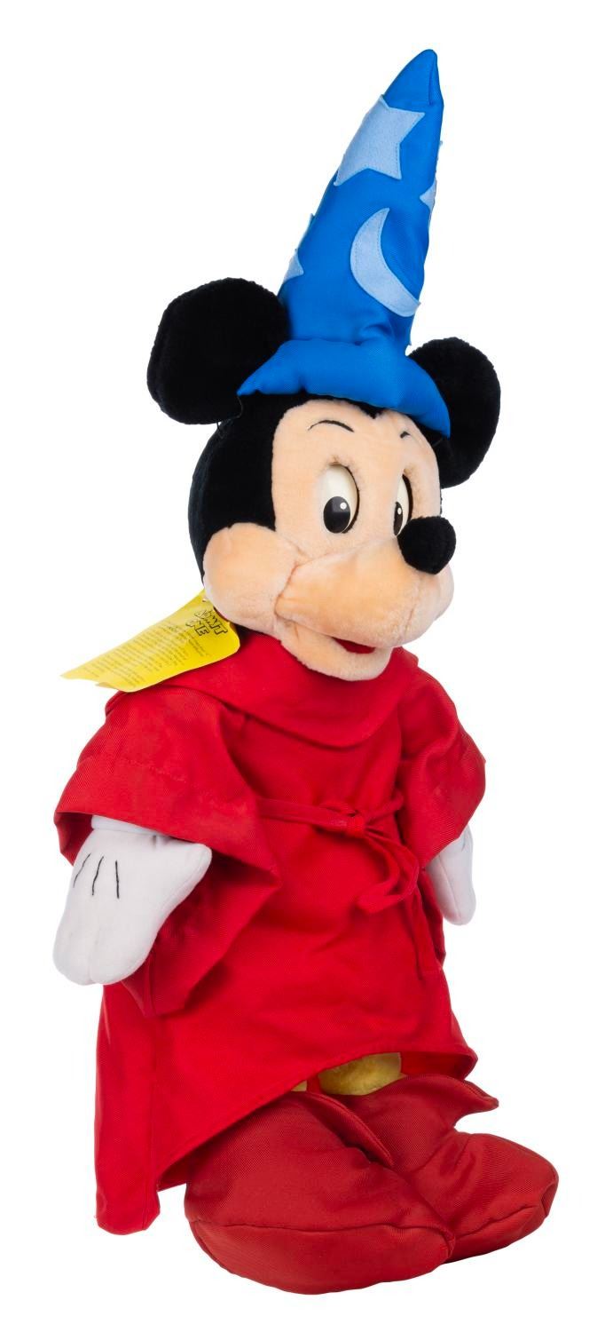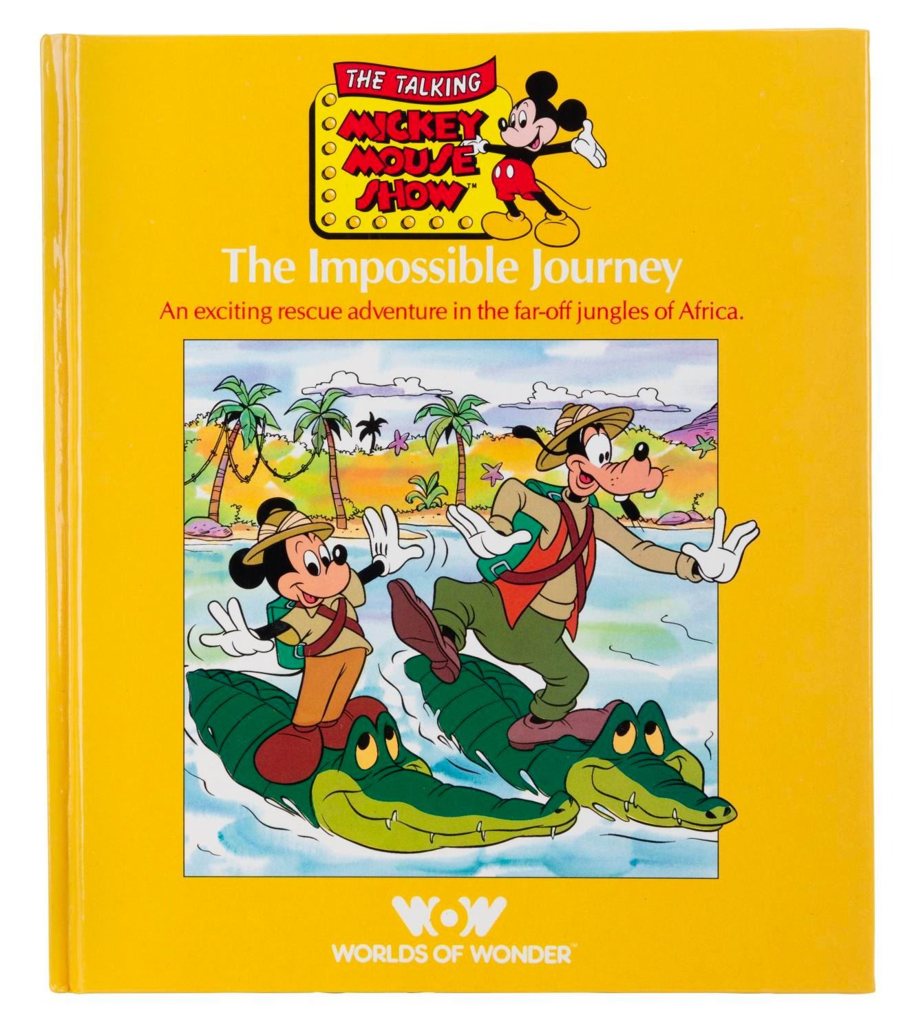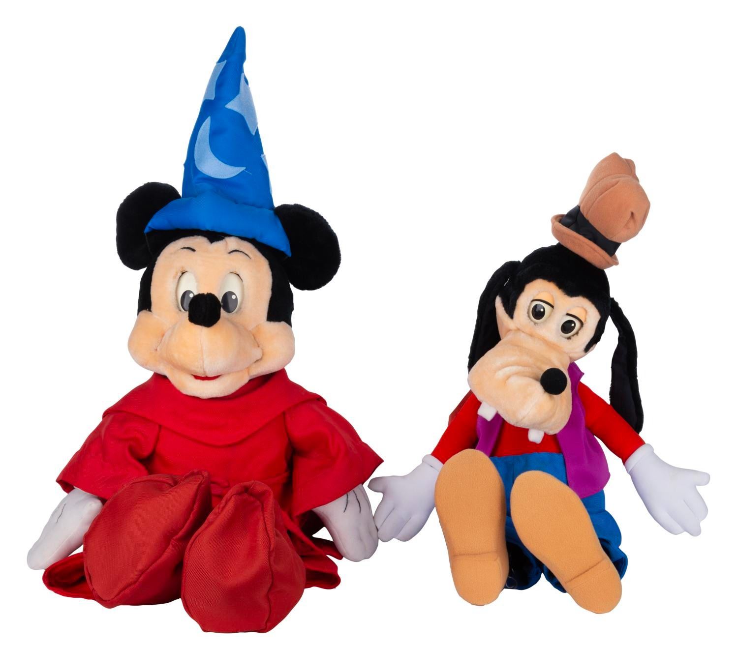 (World of Wonder, 1986) A Talking Mickey Mouse and Goofy by World of Wonder. Created by Ken Forsse – the creator of Teddy Ruxpin - this set includes a Talking Mickey, Talking Goofy, "Mickey’s Costume Closet" Sorcerer’s Apprentice Outfit, and one "The Impossible Journey" Book and Cassette. The toys operate with four C batteries each (not included). The dolls measure 18" and 14" tall, the book 7" x 8", and the tape 4" x 2.5". The pieces display in very good condition, exhibiting some oxidation in Mickey’s battery compartment, and minor wear. Tested for function, the audio features work, but the facial animation does not.