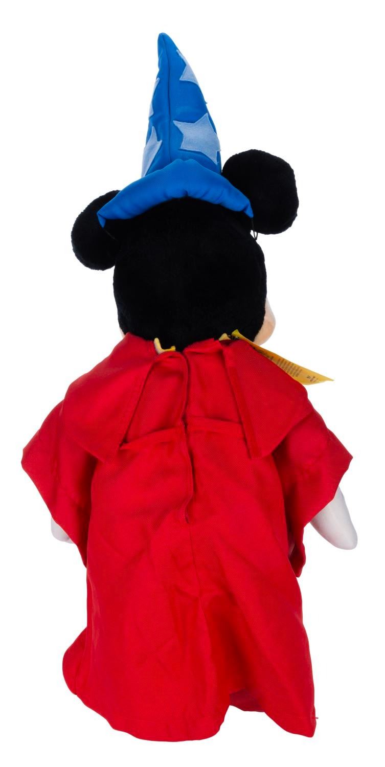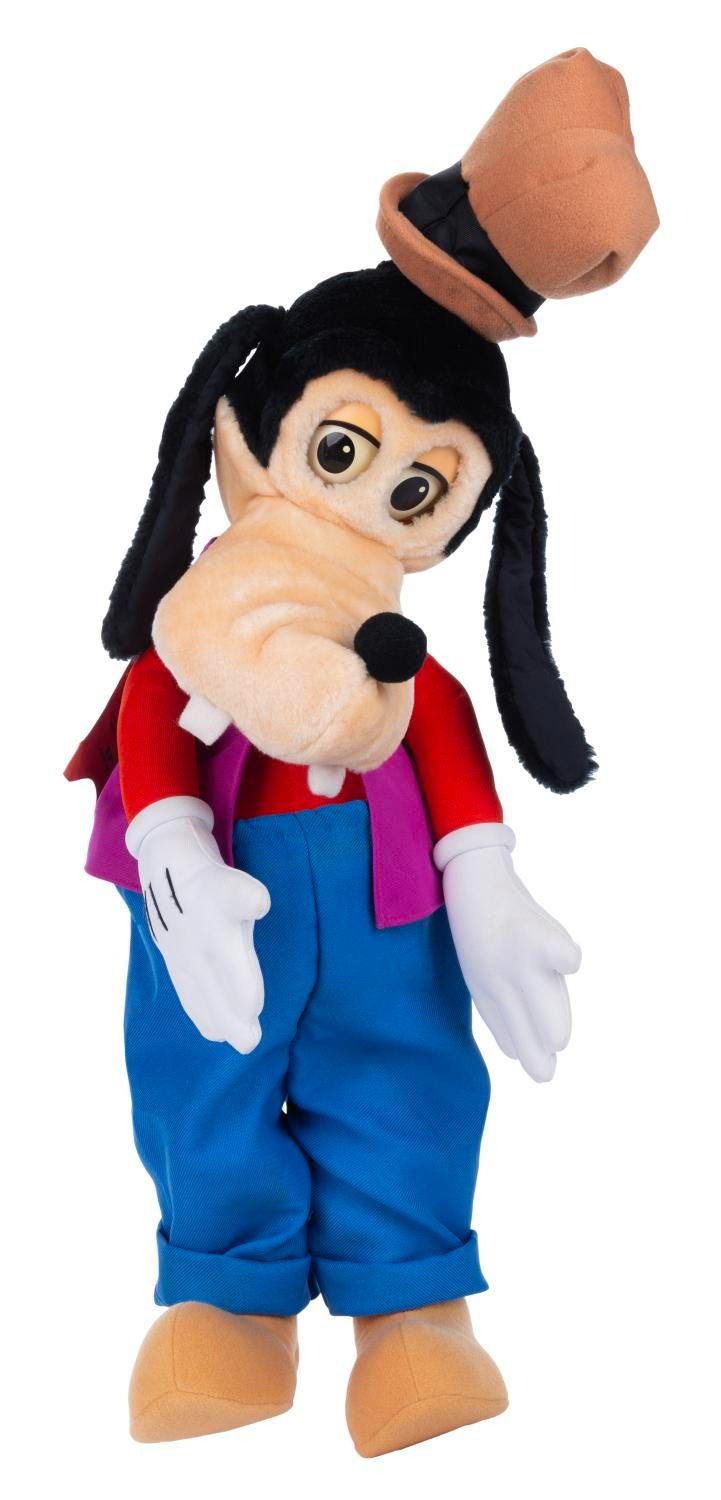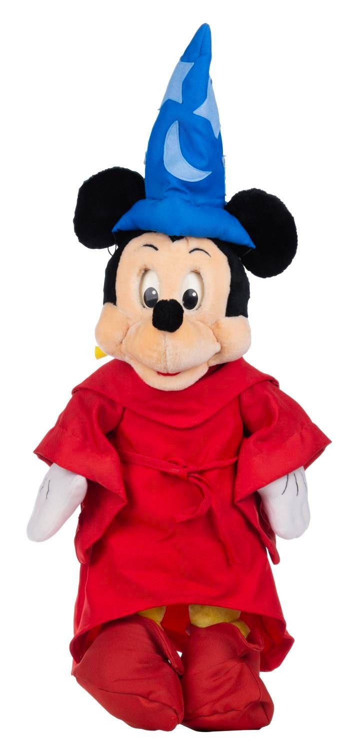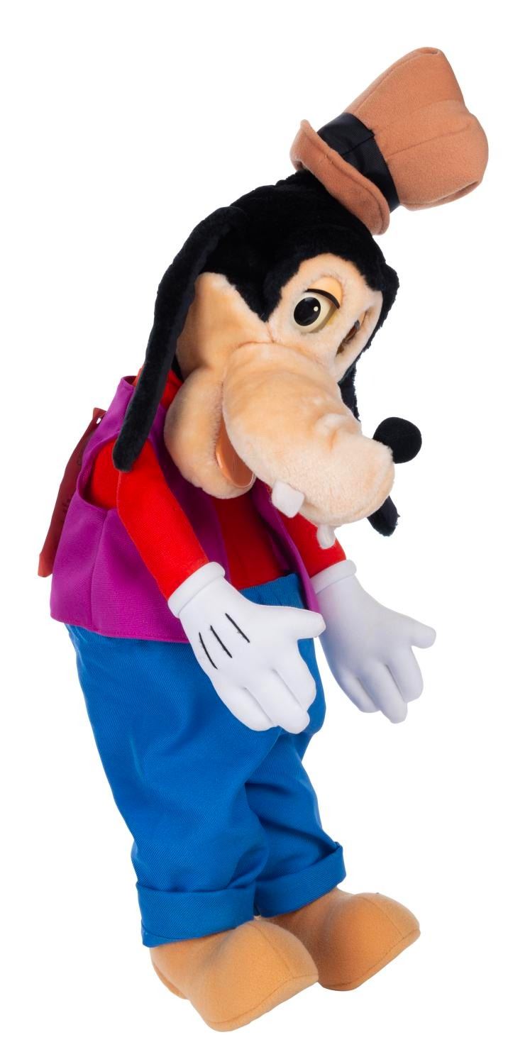 (World of Wonder, 1986) A Talking Mickey Mouse and Goofy by World of Wonder. Created by Ken Forsse – the creator of Teddy Ruxpin - this set includes a Talking Mickey, Talking Goofy, "Mickey’s Costume Closet" Sorcerer’s Apprentice Outfit, and one "The Impossible Journey" Book and Cassette. The toys operate with four C batteries each (not included). The dolls measure 18" and 14" tall, the book 7" x 8", and the tape 4" x 2.5". The pieces display in very good condition, exhibiting some oxidation in Mickey’s battery compartment, and minor wear. Tested for function, the audio features work, but the facial animation does not.