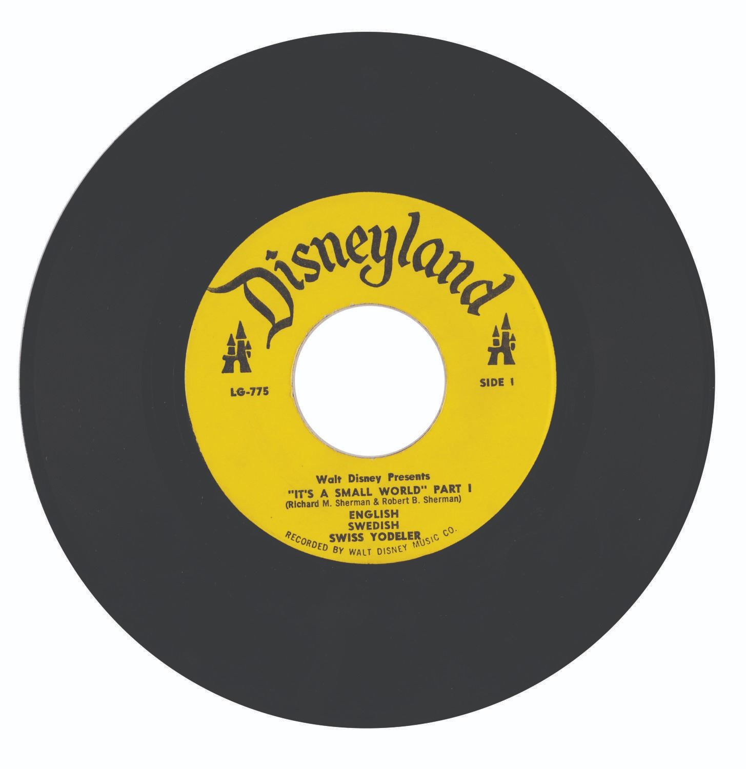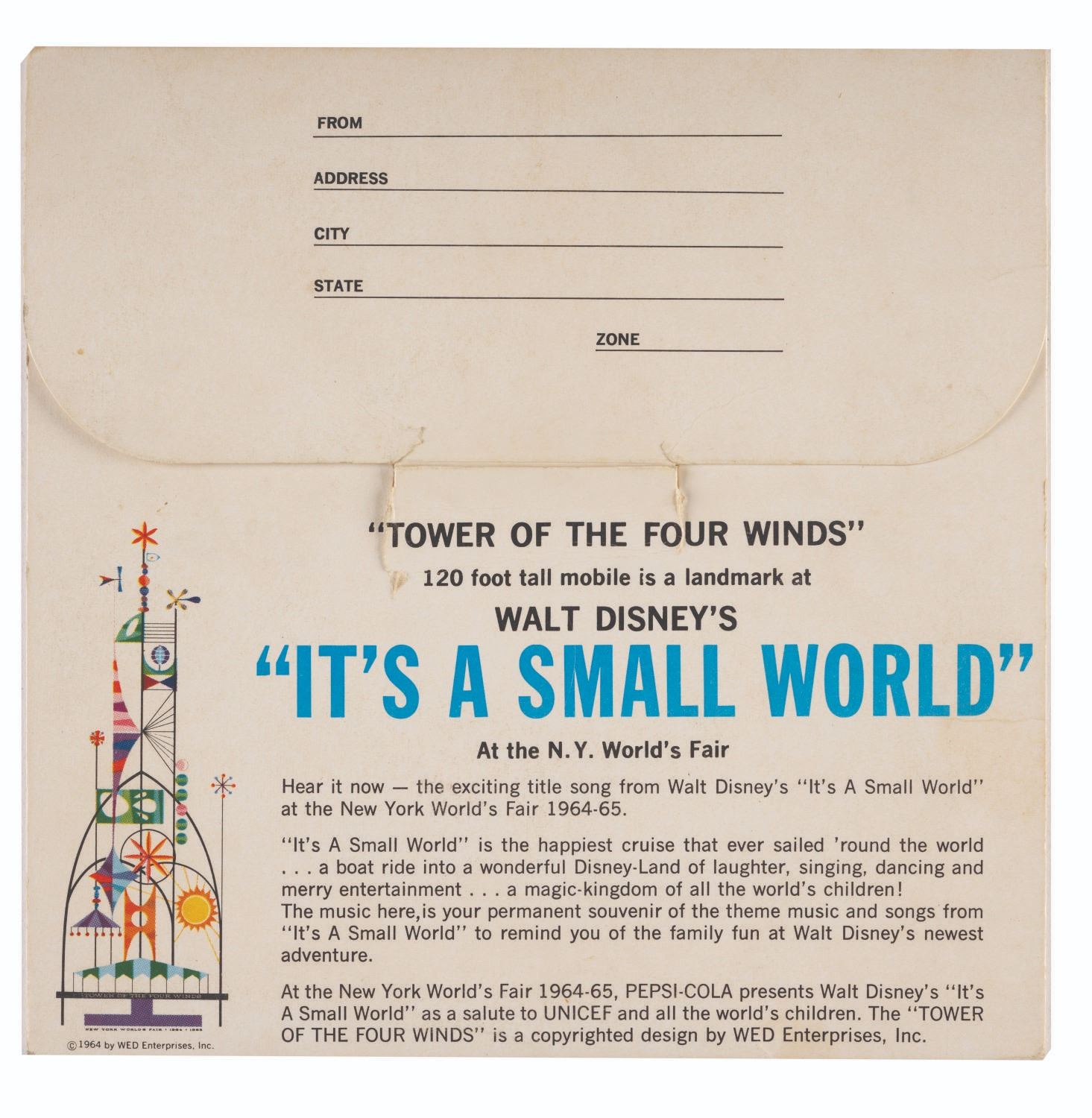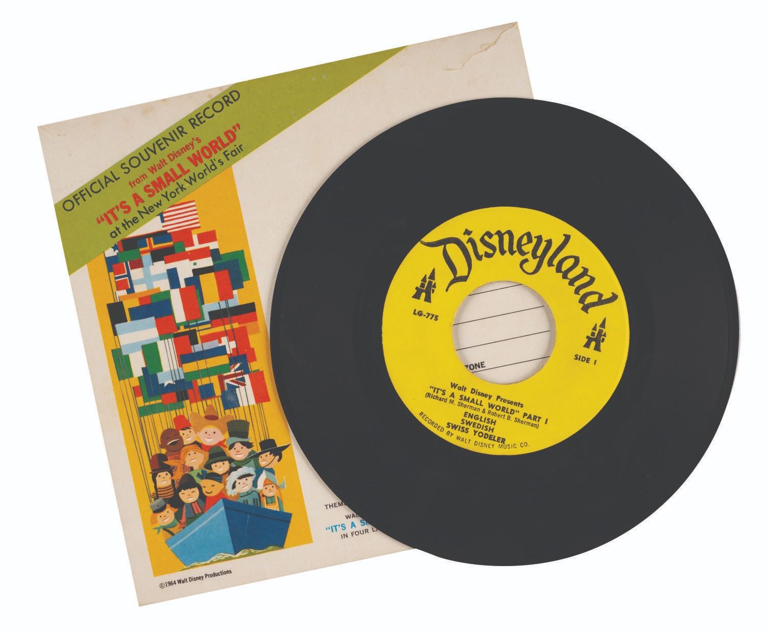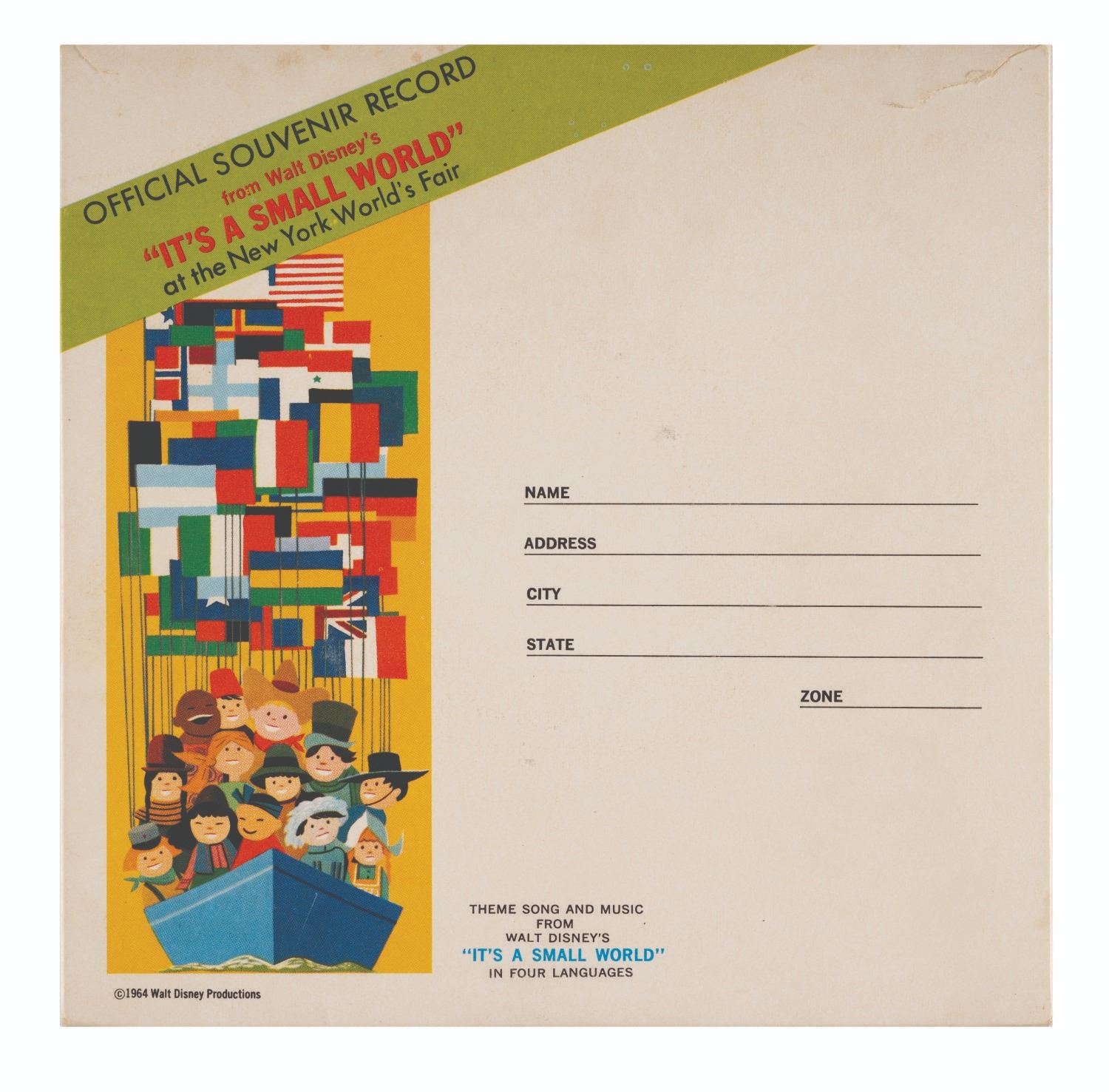 (World's Fair, 1964) An original souvenir record from "It's a Small World" at the 1964-65 New York World's Fair. This double-sided 45 RPM record features the iconic theme by the Sherman Brothers. Measuring 7.75"x7.75", this vinyl record is in very good condition with its 7.25"x7.25" cover. The record exhibits some scratches and scuffs, and the cover has creases and wear.