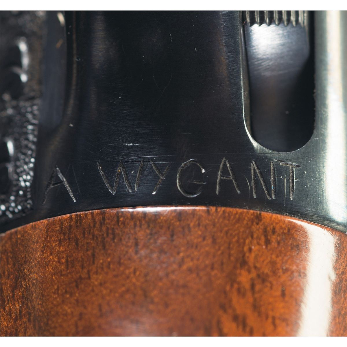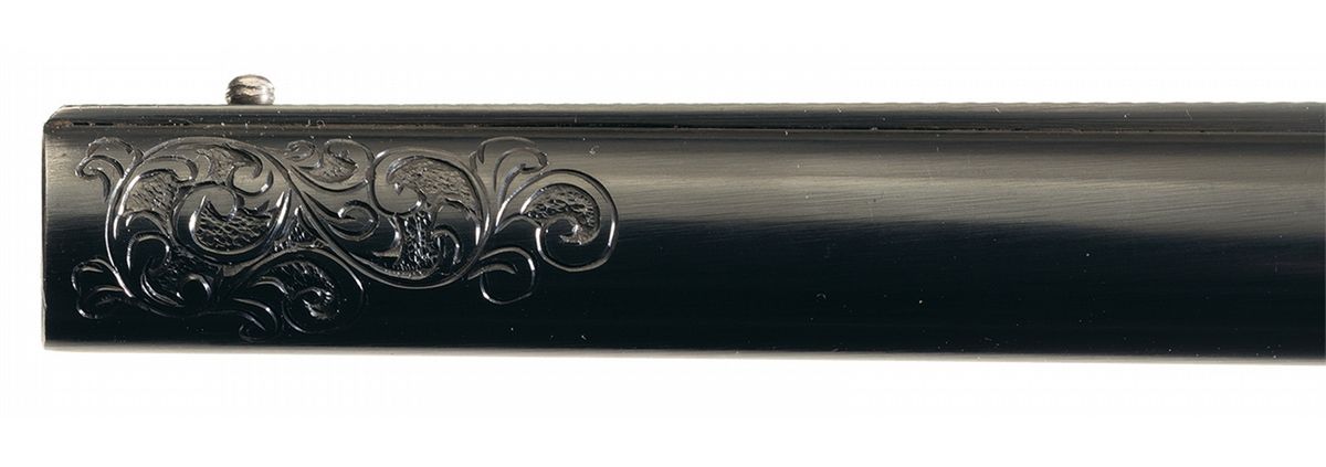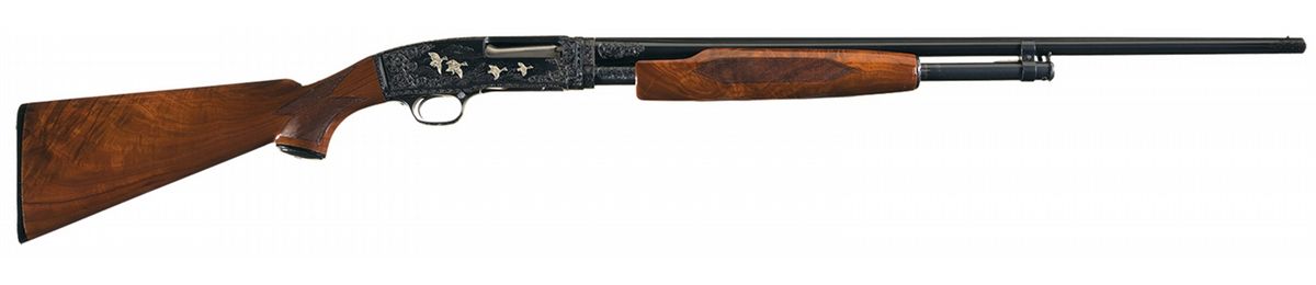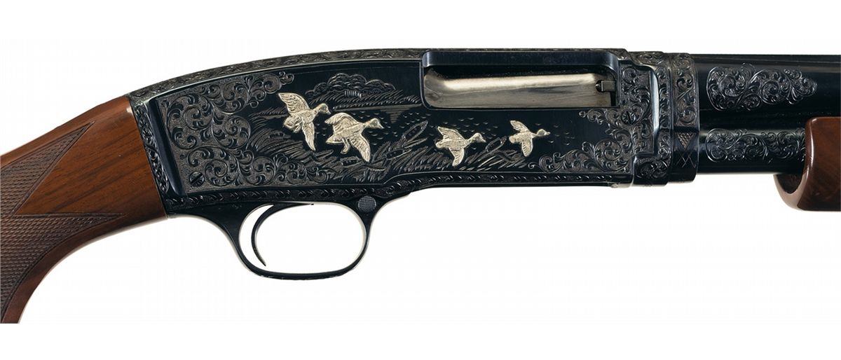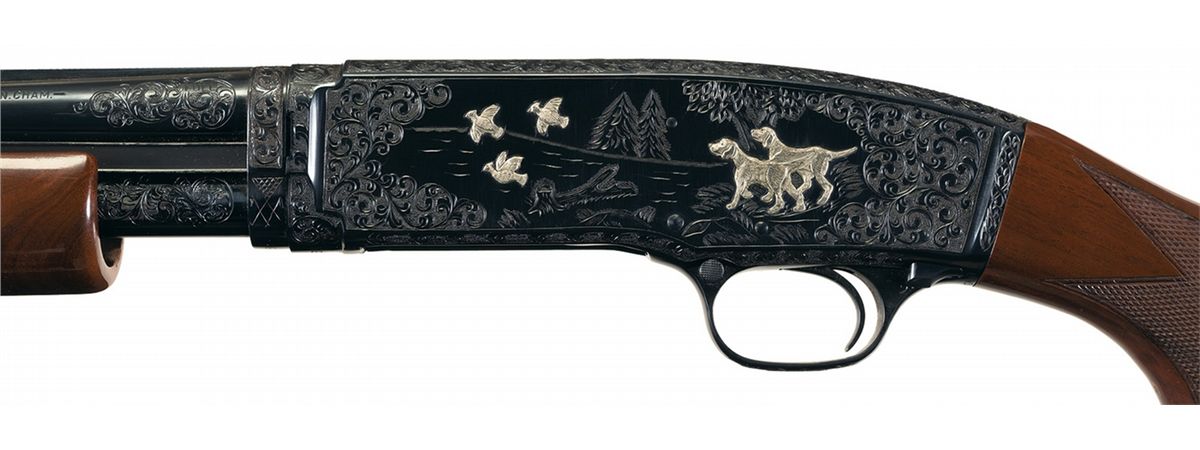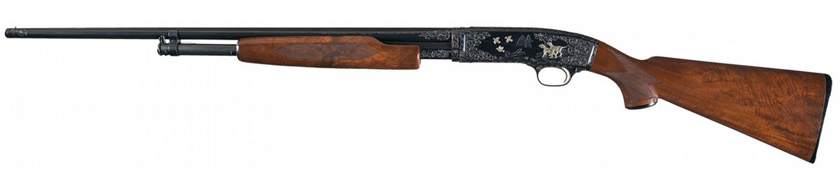 This was the first slide action shotgun Winchester ever developed exclusively for the .410 bore. This shotgun was originally manufactured in 1937 and subsequently custom embellished. The left side of the receiver is engraved with a scene of two relief engraved silver inlaid hunting dogs and three relief engraved silver inlaid quail and the right side has a marsh scene with four relief engraved silver inlaid ducks. Both scenes are flanked by floral scroll engraving with a punch dot background. The sides of the barrel and the magazine at the breech end have a 2 inch wedge of the same floral scroll and punch dot engraving. The muzzle end of the barrel has a 1 1/4 inch wedge of the same design on each side. The trigger guard has a leaf design and directly behind the trigger guard is signed "A WYGANT". The left rear of the barrel is marked with the address/proof steel, Winchester trade mark, model, gauge and chamber marking, and the matching serial number is marked on the bottom of the receiver and takedown ring. Single brass bead sight on the matte solid rib, 3 inch chamber and choked extra full. Mounted with a checkered walnut forearm and pistol grip stock with a black plastic grip cap and serrated "FAJEN" marked buttplate. Length of pull is 14 1/4 inches.