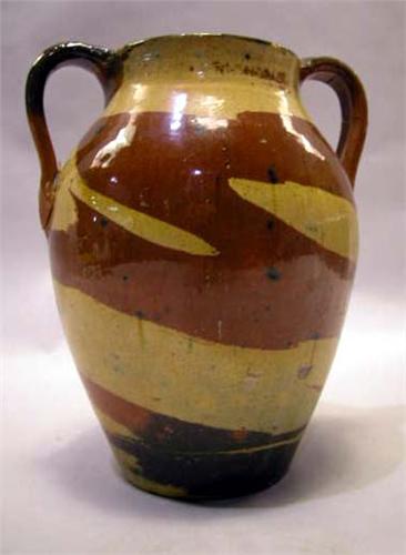 A YELLOW AND BROWN GLAZED DOUBLE HANDELED REDWARE POTTERY VASE; Losses