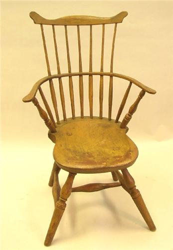 A YELLOW AND RED PAINTED FAN-BACK WINDSOR ARMCHAIR; Probably Hartford County, Connecticut, the shaped crest above a seven-spindle back above a plank seat and turned base, some restoration