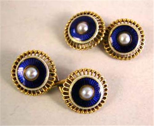 A YELLOW GOLD AND BLUE ENAMEL CIRCULAR DOUBLE HEADED CUFFLINK SET; Each centered by a seed pearl, retailed by Udall & Ballou in original leather fitted box