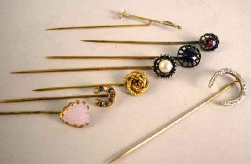A YELLOW GOLD HORSESHOE STICK PIN; With 25 small diamonds, apx. weight.70 ct., together with a group of seven stick pins