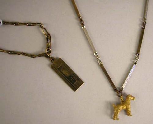 A YELLOW GOLD RECTANGULAR MONOGRAMMED PLATE ON GOLD LINK CHAIN; Together with a yellow gold billet link watch chain