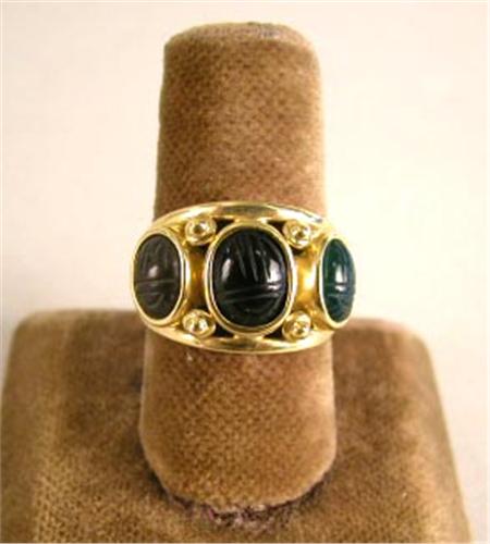 A YELLOW GOLD WITH THREE HARDSTONE SCARAB RING;