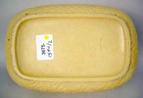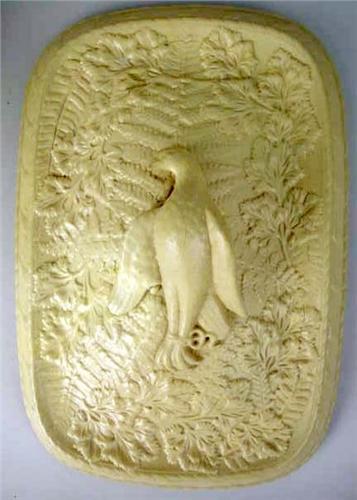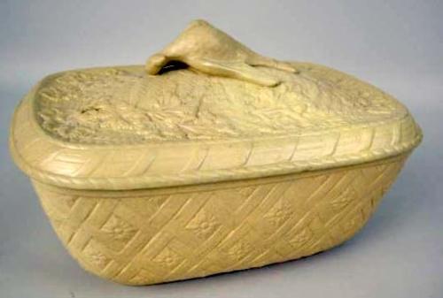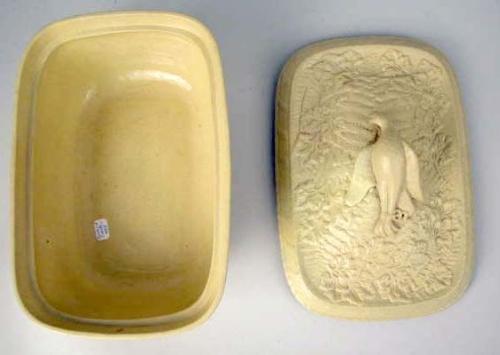 Woven and floral motif, cover foliate motif with bird form handle. Interior restoration, lid cracks. 10"l.