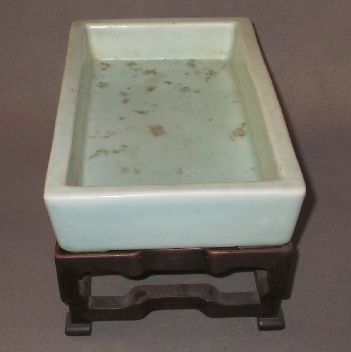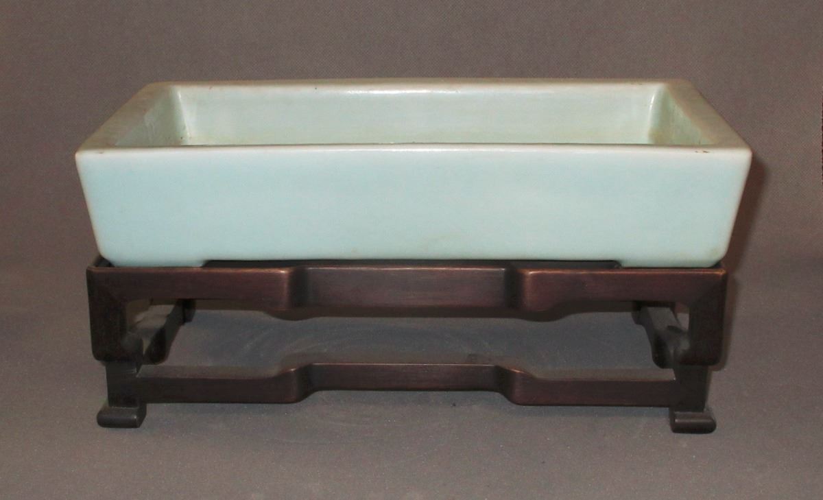 A Chinese Yongzheng style kiln porcelain flower pot, in low and square form, four-character seal imprinted on the base, including a wooden stand. Length 11.25” Width 6.5” Height 2”