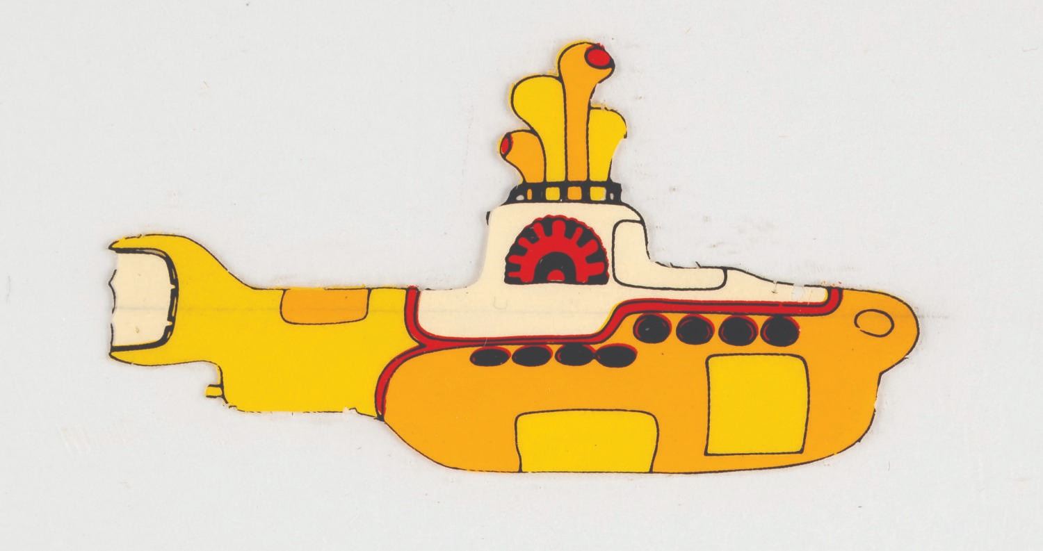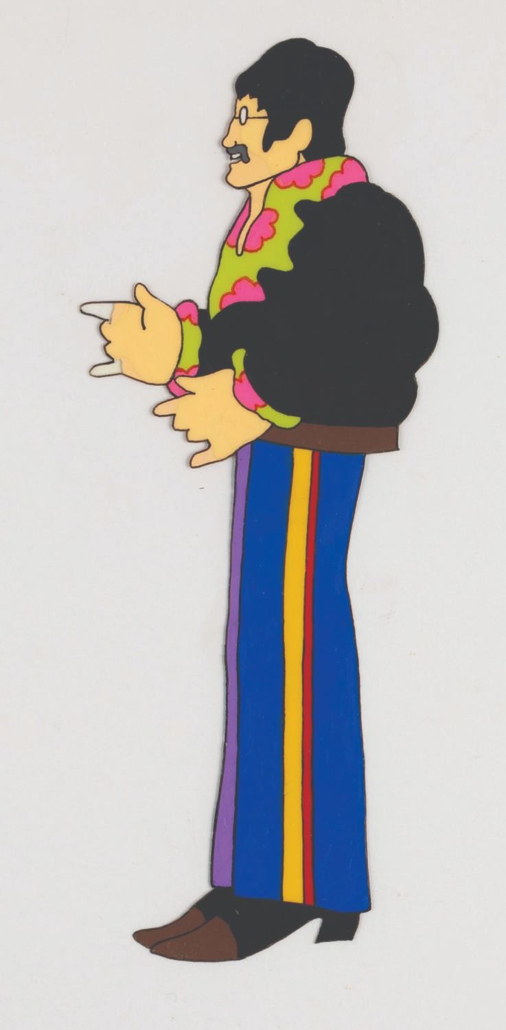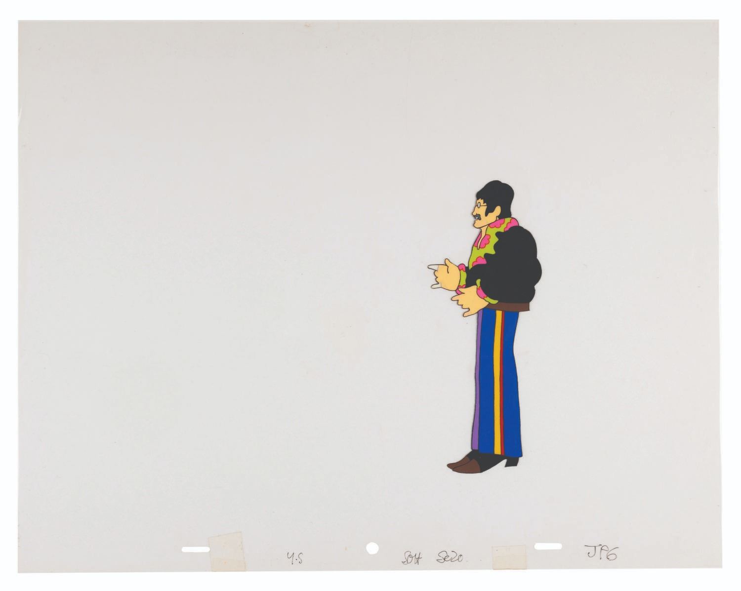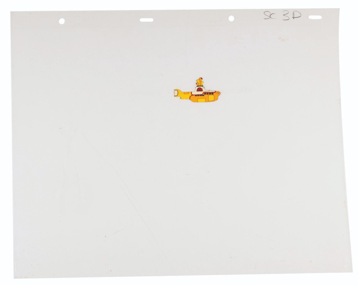 (United Artists, 1968) An original multi-layer hand-painted production cel of John Lennon, a Horse Monster, the Yellow Submarine, and the woman from "Yellow Submarine.” With an image size of 6.75” x 7” on 12.5” x 16” cels and paired with a color copy background, the piece displays in good condition with folds, creases, scratches, spots of paint loss, and tape from production use.