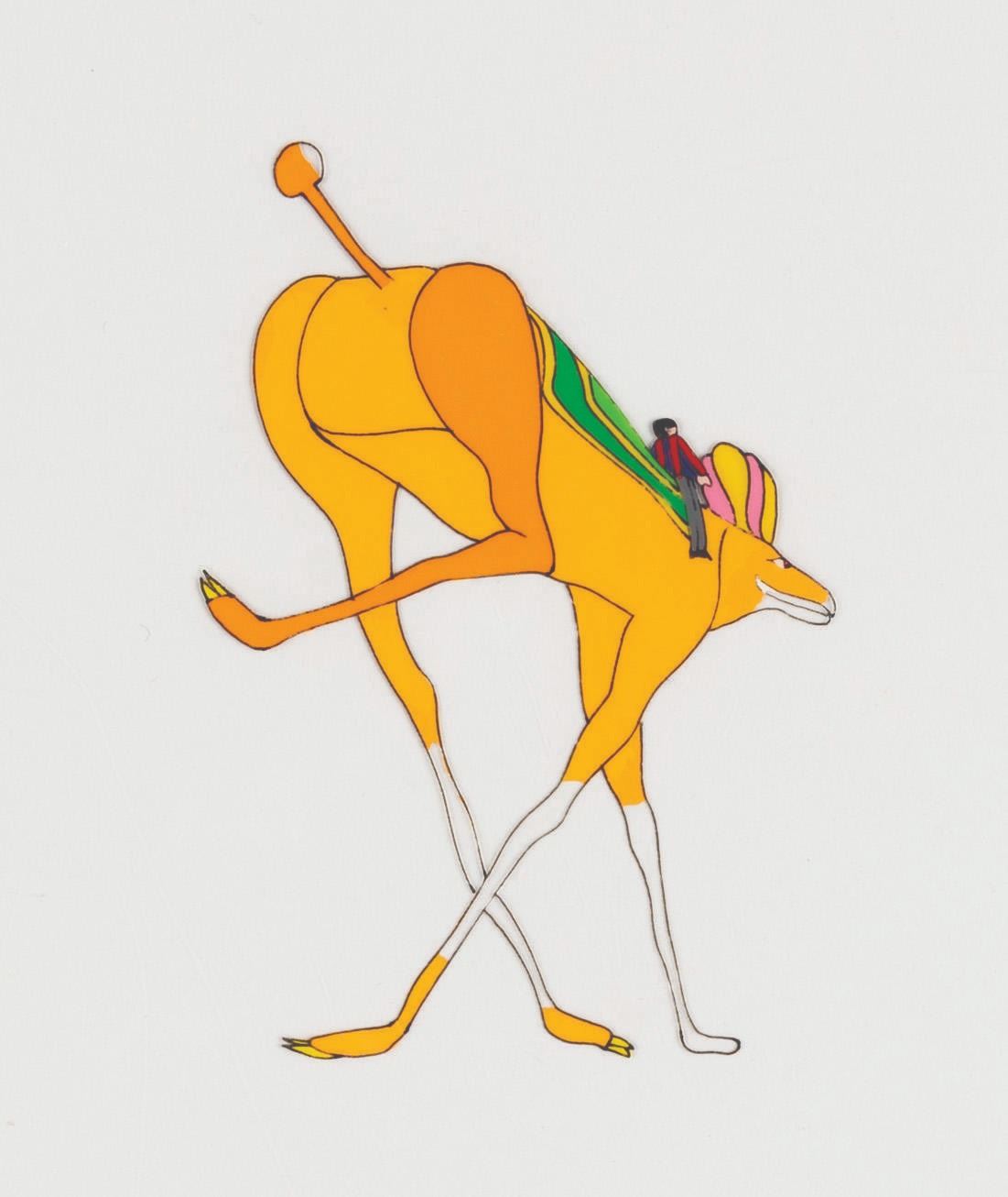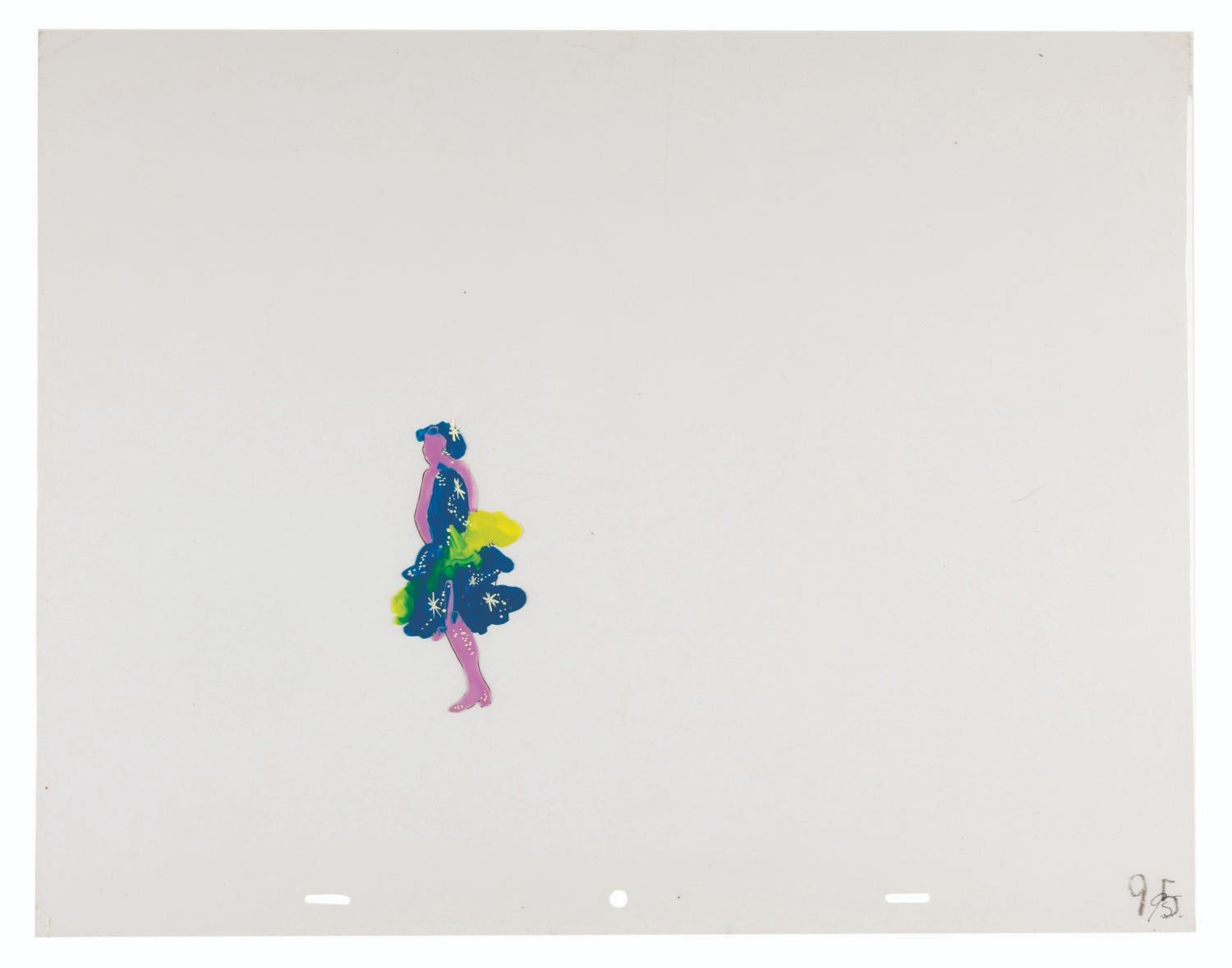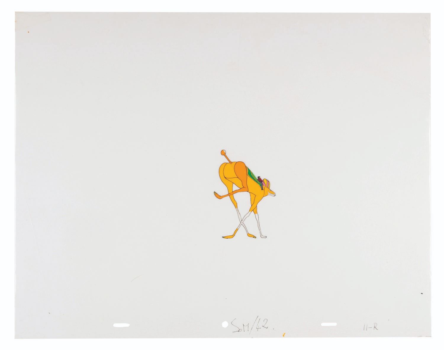 (United Artists, 1968) An original multi-layer hand-painted production cel of John Lennon, a Horse Monster, the Yellow Submarine, and the woman from "Yellow Submarine.” With an image size of 6.75” x 7” on 12.5” x 16” cels and paired with a color copy background, the piece displays in good condition with folds, creases, scratches, spots of paint loss, and tape from production use.