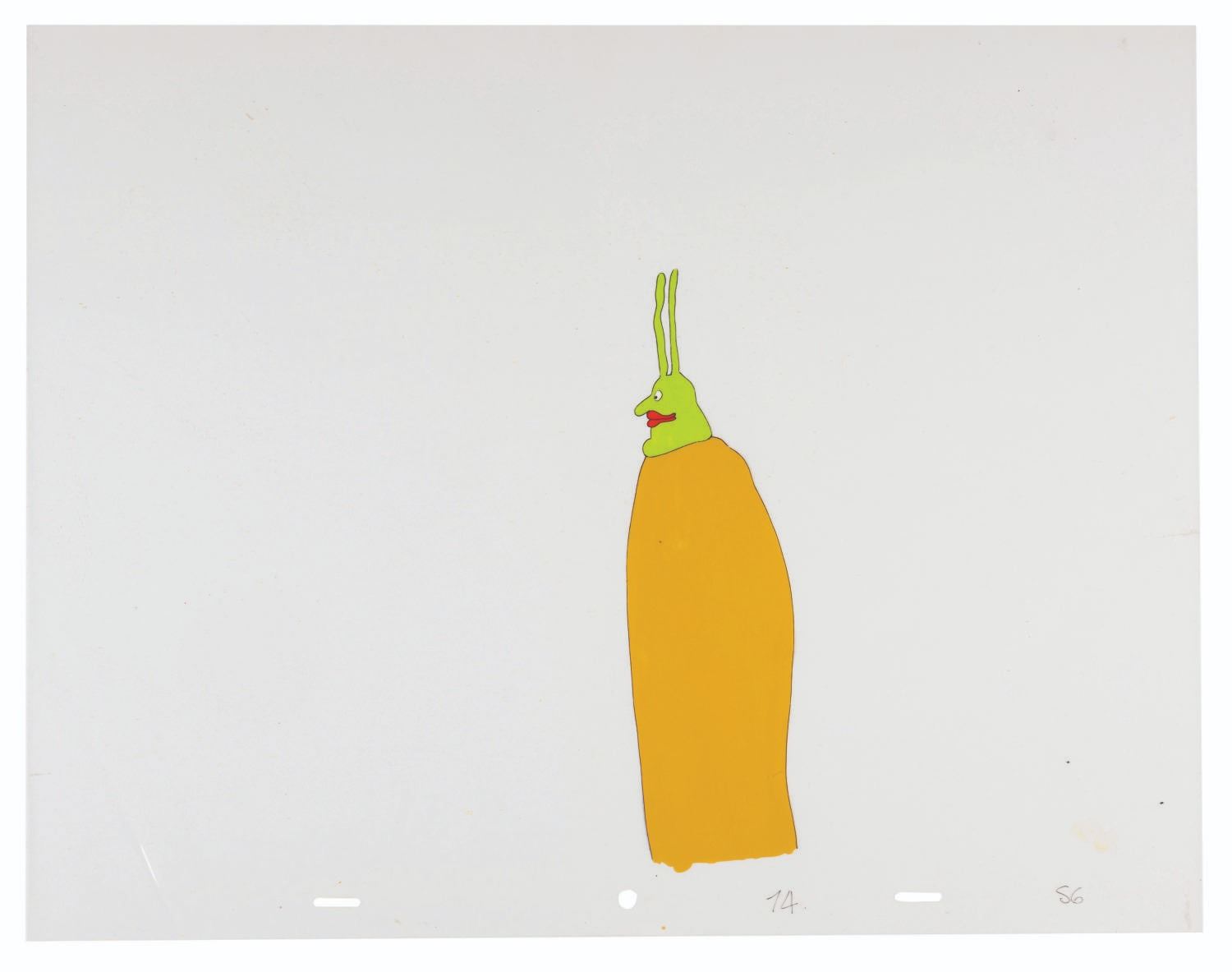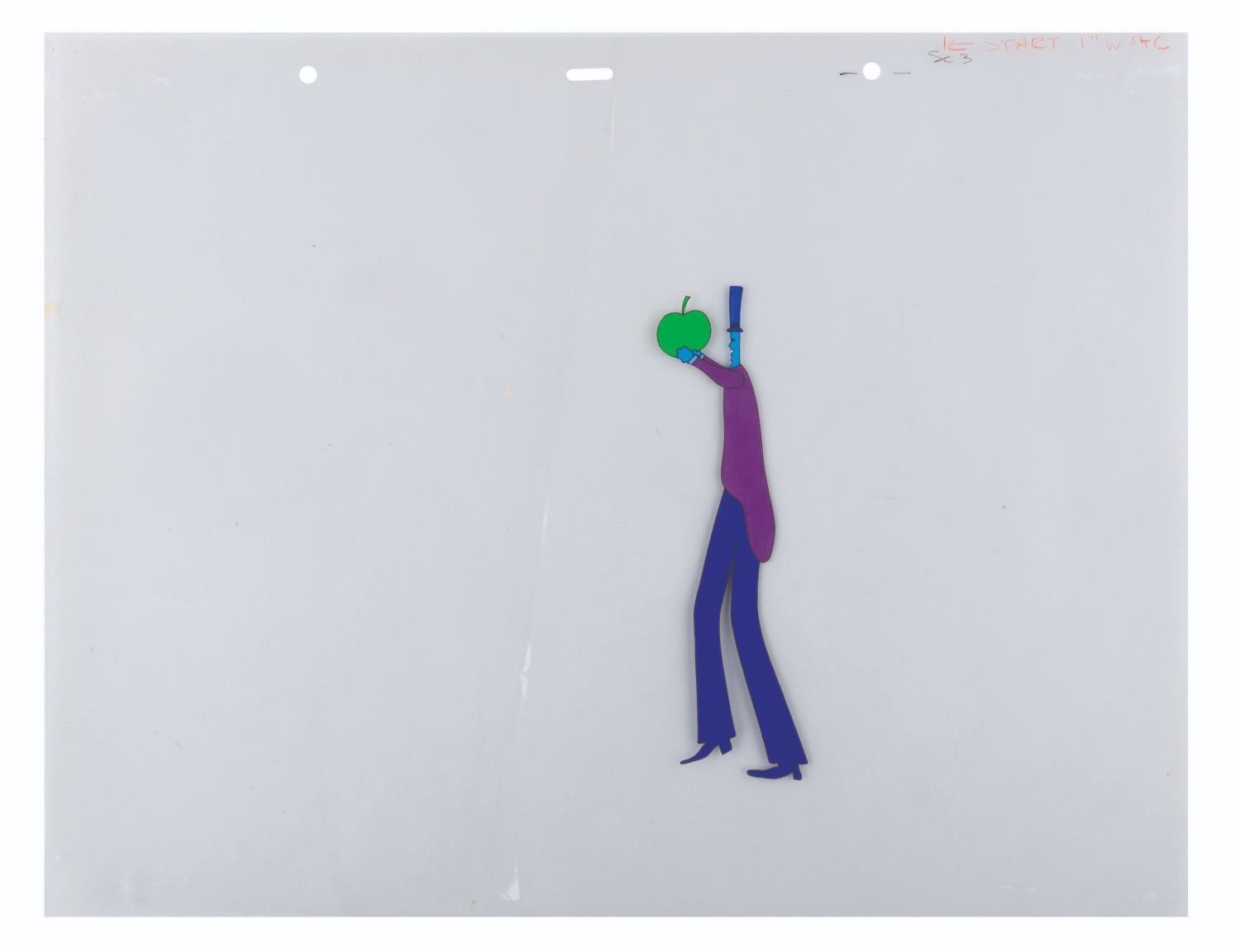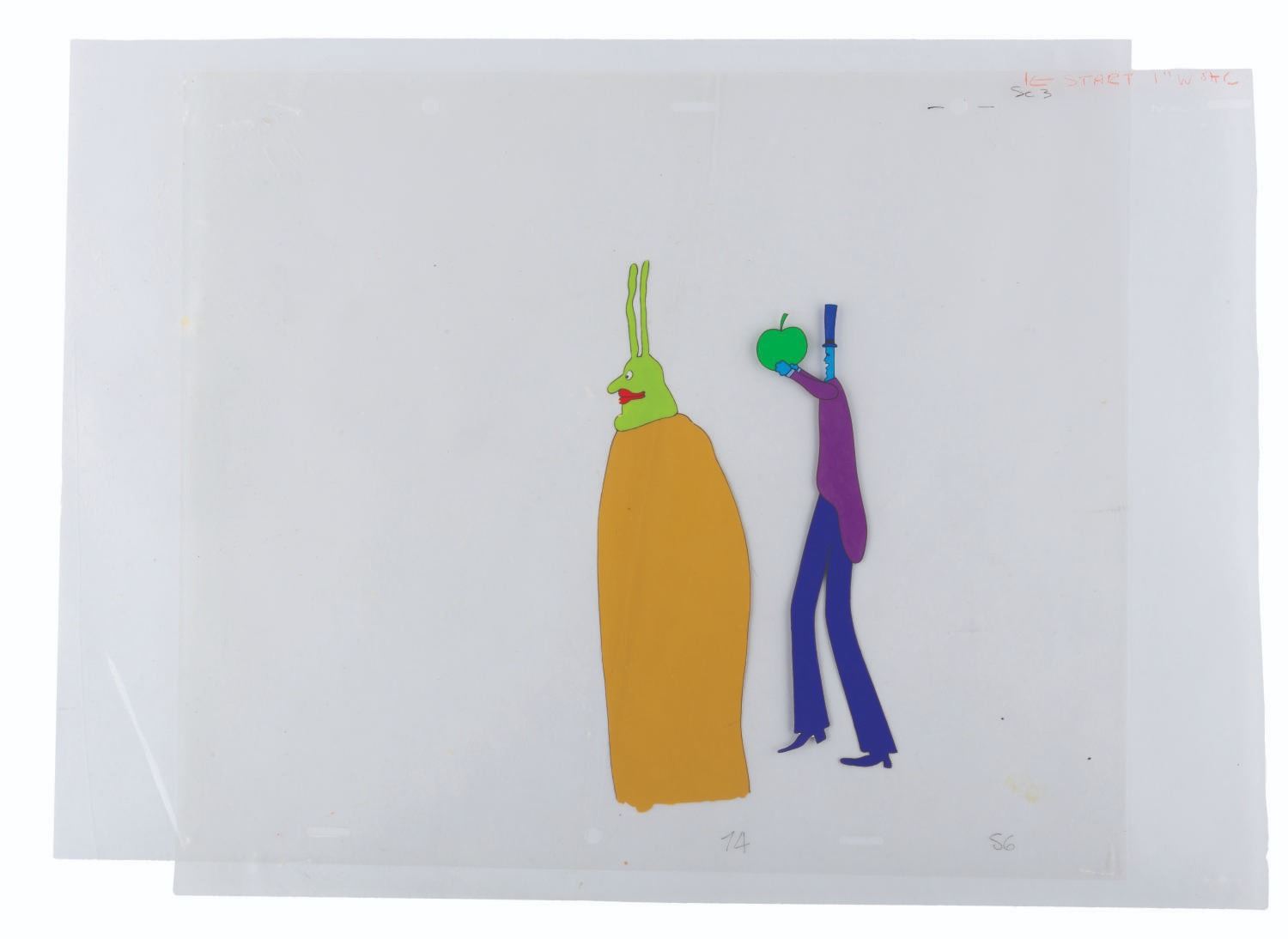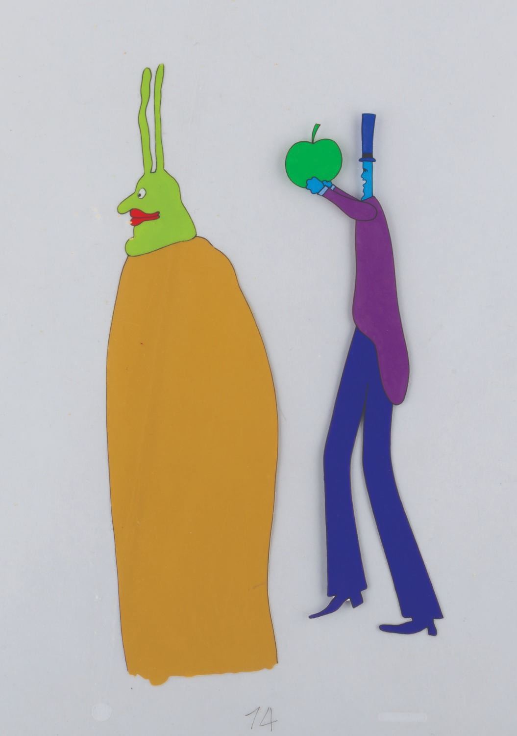(United Artists, 1968) An original multi-layer, hand-painted production cel of a Kinky Boot Beast and an Apple Bonker from The Beatles "Yellow Submarine.” Measuring 12.5” x 16” with character image sizes of 8.25” x 2.25” and 7” x 2”, the cel displays in very good condition with staple holes in the corners and light scuffs and paint residue from contact with other cels, which do not affect the image.