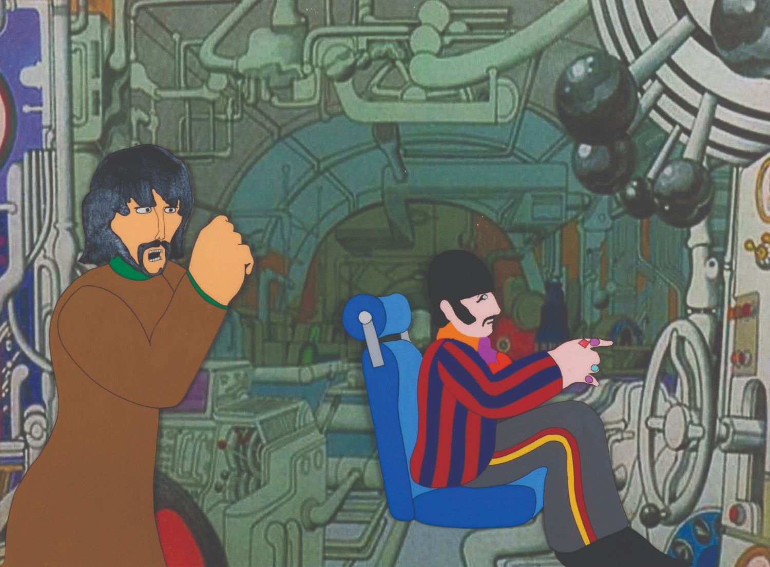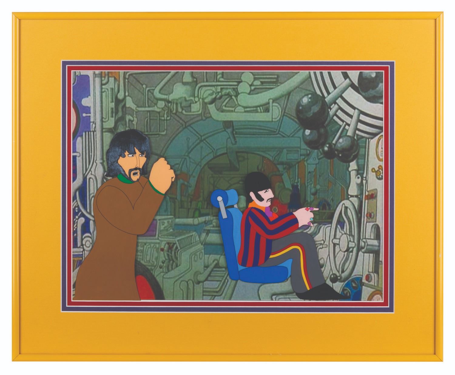 (United Artists, 1968) An original multi-layer production cel of Ringo Starr and George Harrison from “Yellow Submarine,” with a color copy background. Ringo and George have an image size of 8” x 13” on a 11” x 14.75” visible cel. The entire framed piece measures 16.75” x 20.5”. The hand-painted cel is in good condition with discoloration to George’s hair, total line loss to Ringo’s head, neck, and tie, and light scuffs to the frame.