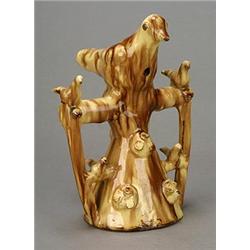 A Yorkshire red pottery glazed bird whistle, modelled as a bird perched on a tree stump, smaller birds to either side, glazed allover in mottled shades of ochre and brown, 23.5cm high, second half 19th century (minor damage and repair) (see illustration) £200-300