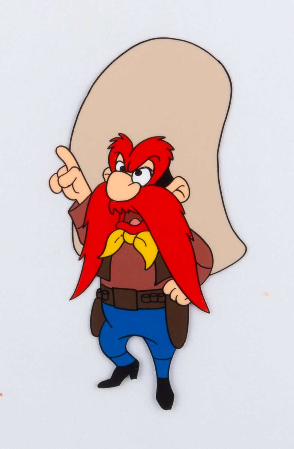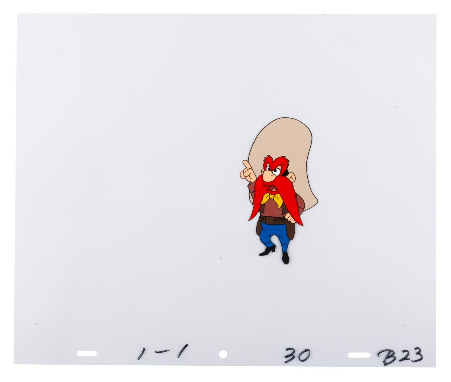 (Warner Bros., 1970s-80s) An original hand-painted production cel of Yosemite Sam from an unknown production. With a character image size of 4.5” x 2.5” on a 10.5” x 12.5”, the piece is in good condition with spots of paint from contact with another cel which does not affect the image.