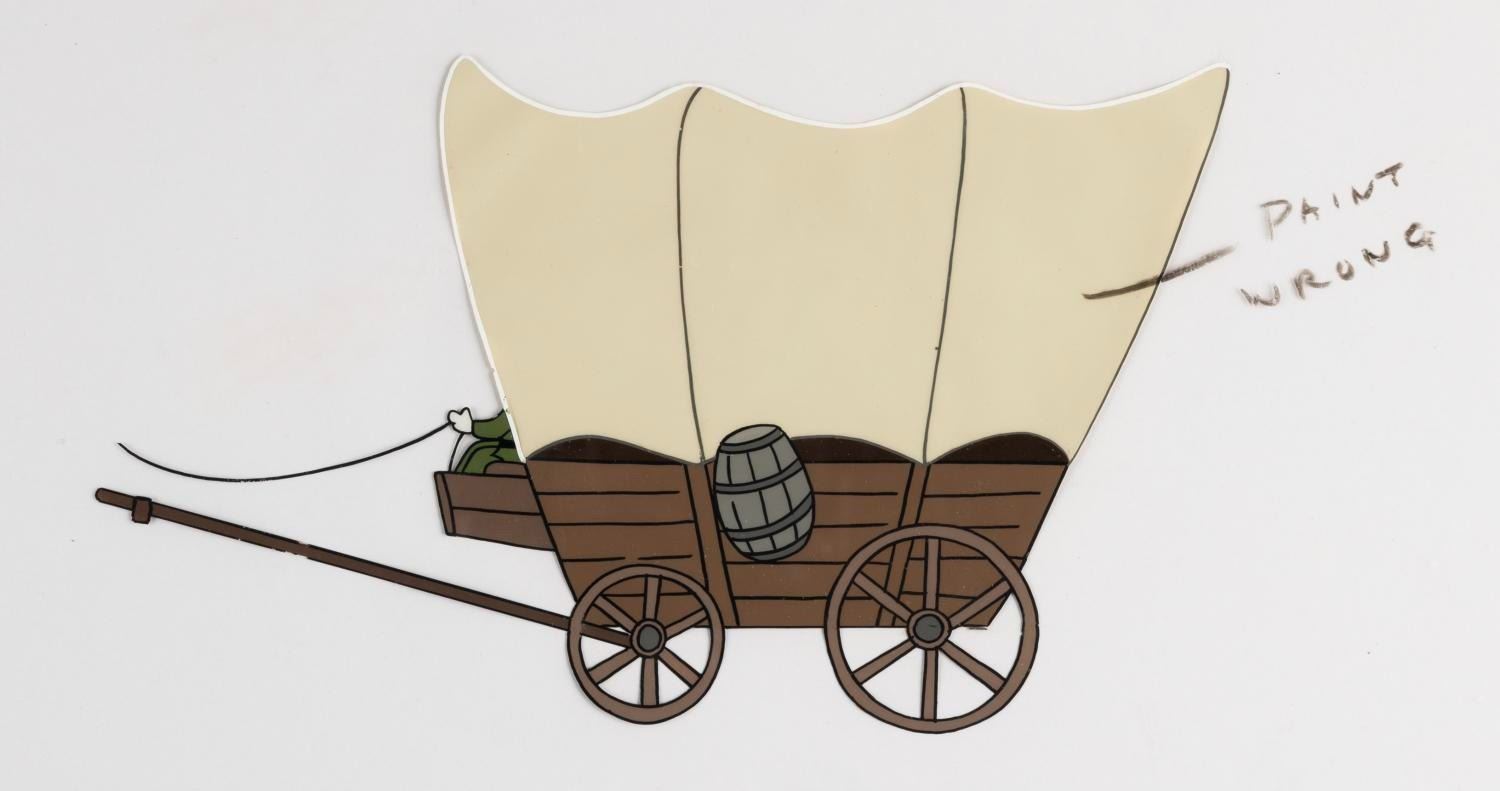 (Disney, 1957) An original production cel of Grandpa Rufus Duck’s covered wagon from the Disneyland TV series episode “Your Host, Donald Duck.” With a character image size of 4.5” x 7.5”, the cel has been trimmed to 9.75” x 11.75” and is in good condition with light waviness and line loss along the wagon bow, falling tongue, and left wheel.