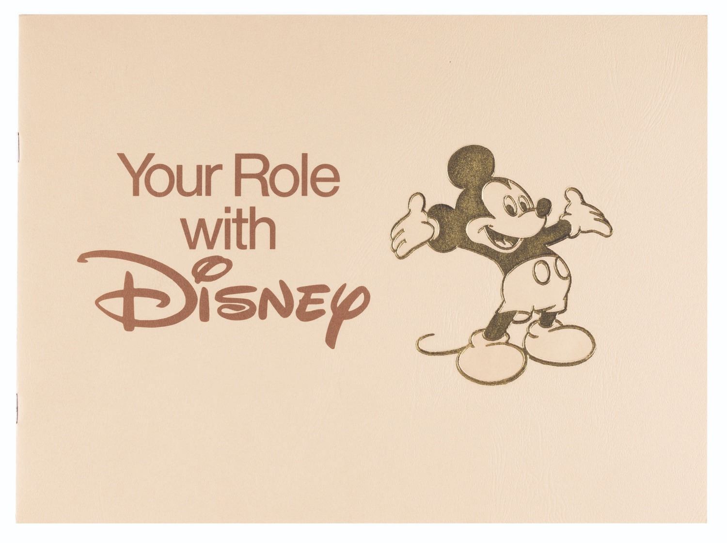 (Disney, 1977) A Your Role with Disney Cast Member guide, which covers general expectations of Disneyland employees as well as a brief history of the Walt Disney Company's first 50 years. This 24-page book measures 8.5" x 11.5" and is in very good condition with minor wear from handling.