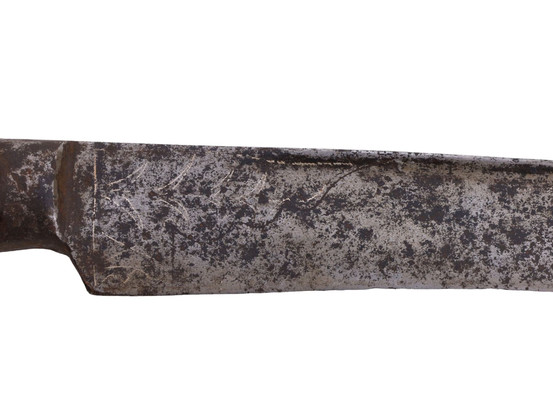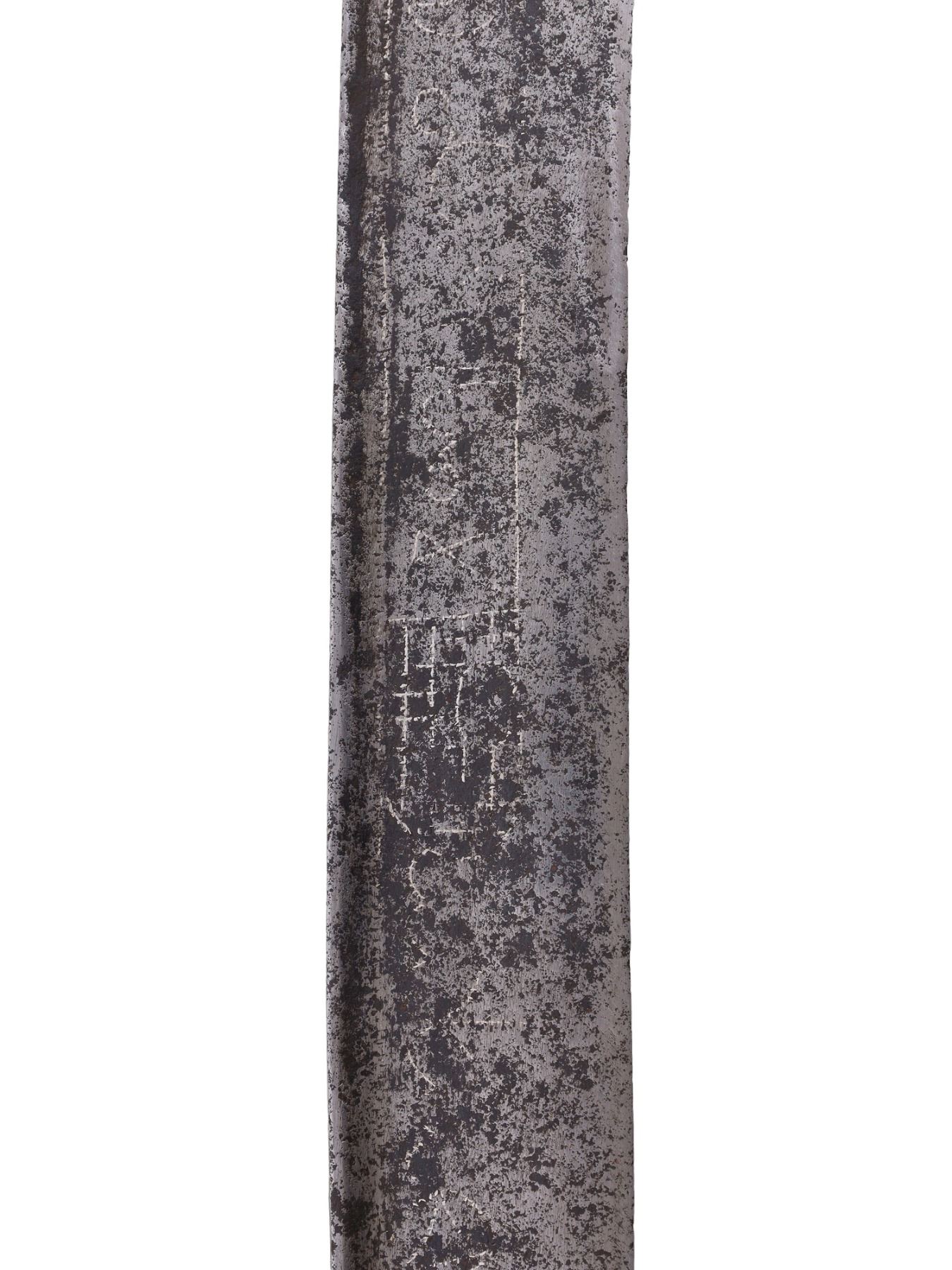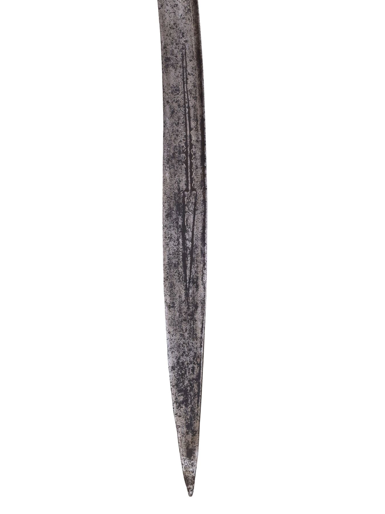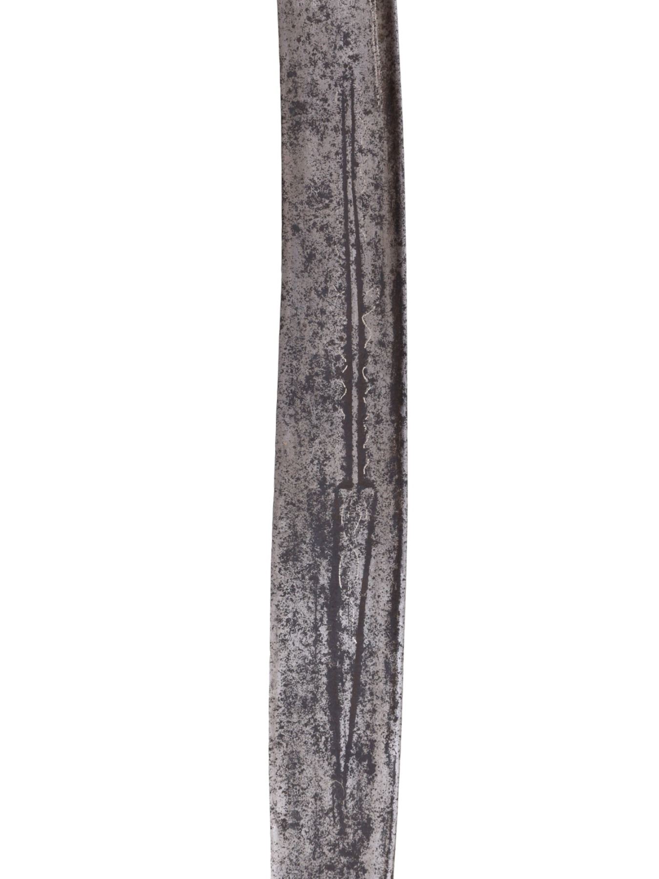 Blade has warped in places and is pitted throughout. The inlay is worn and faded in places but is mostly present. Grip scales are probably a 19th century replacement for an earlier more ornate hilt.