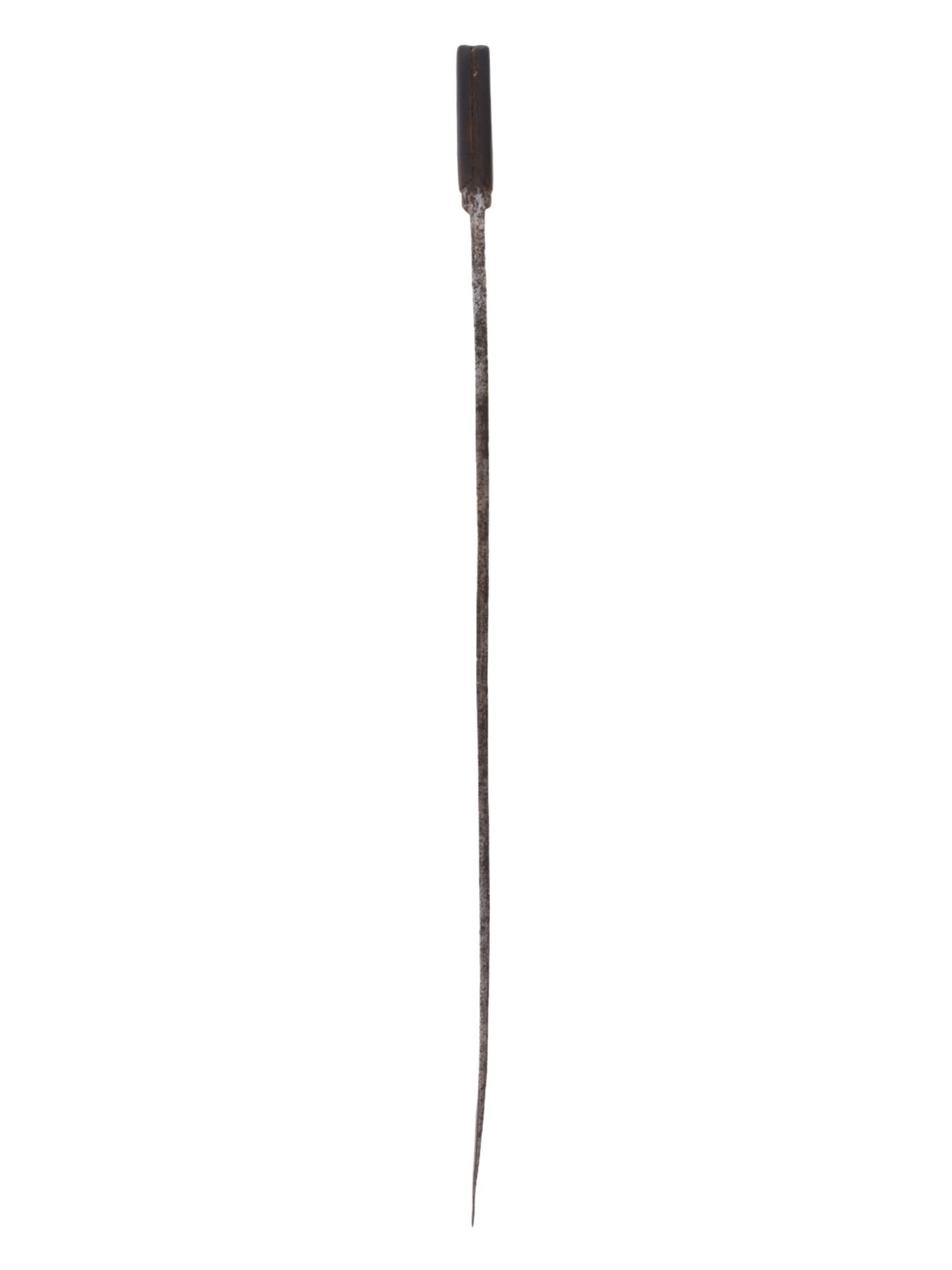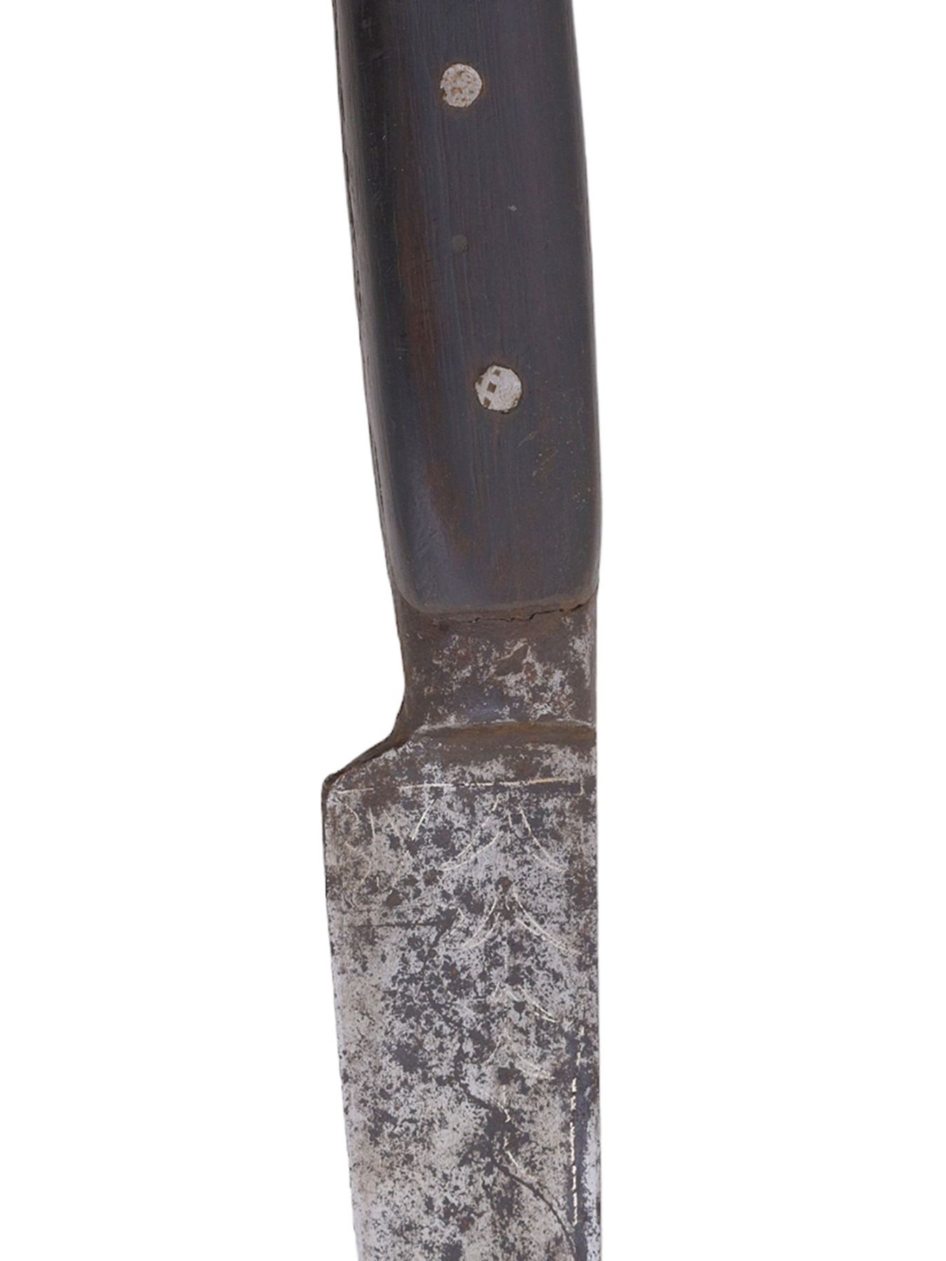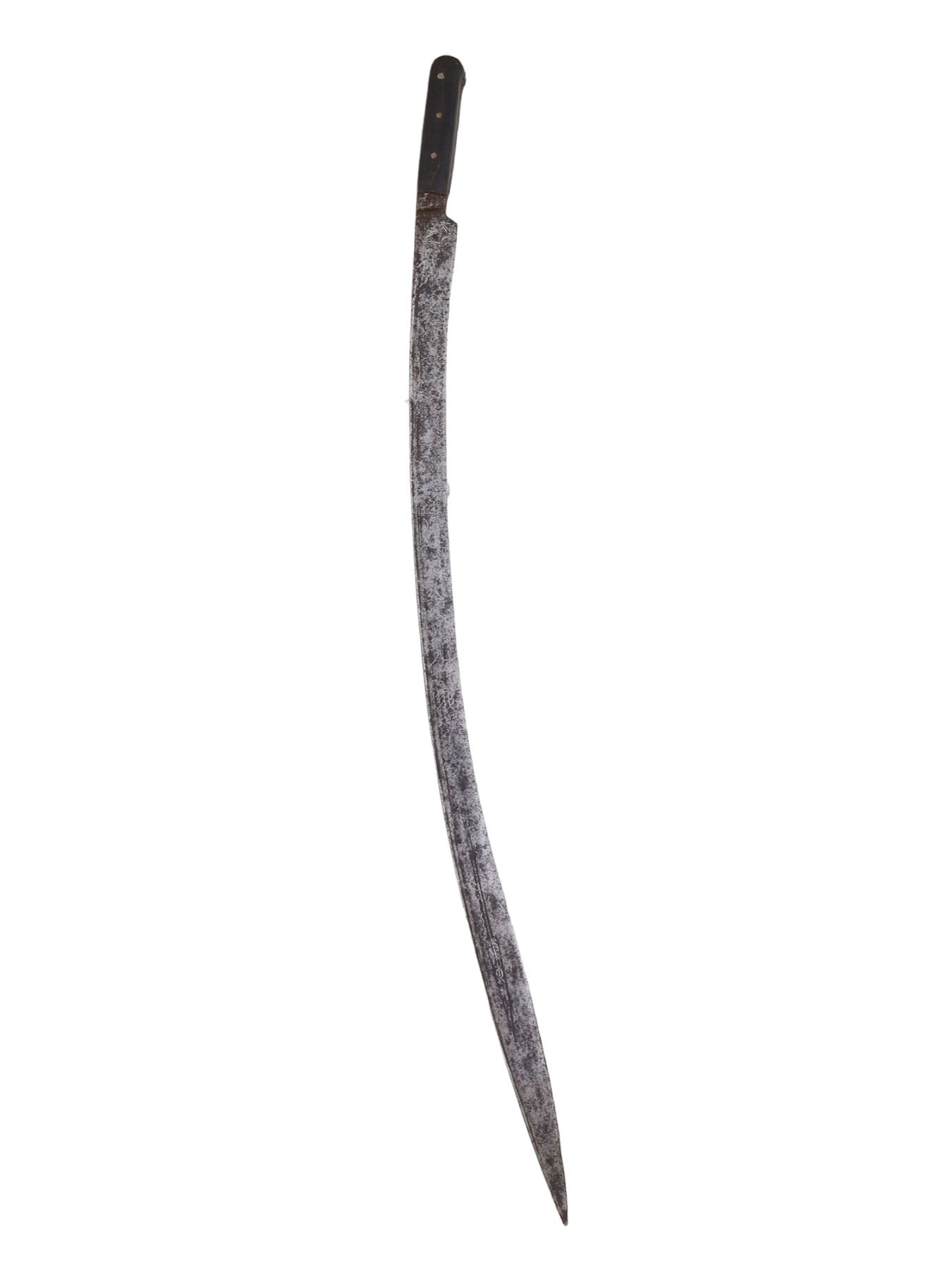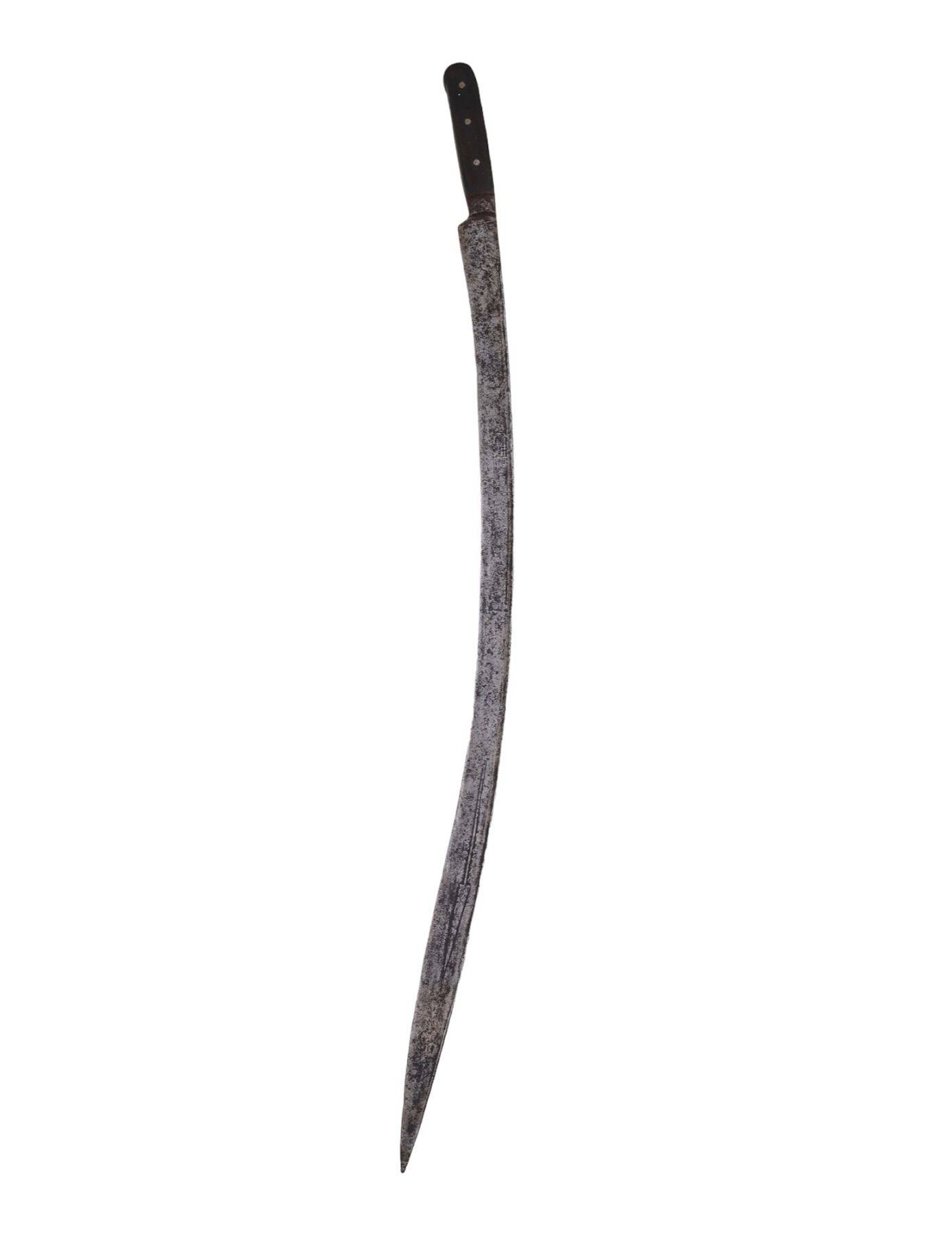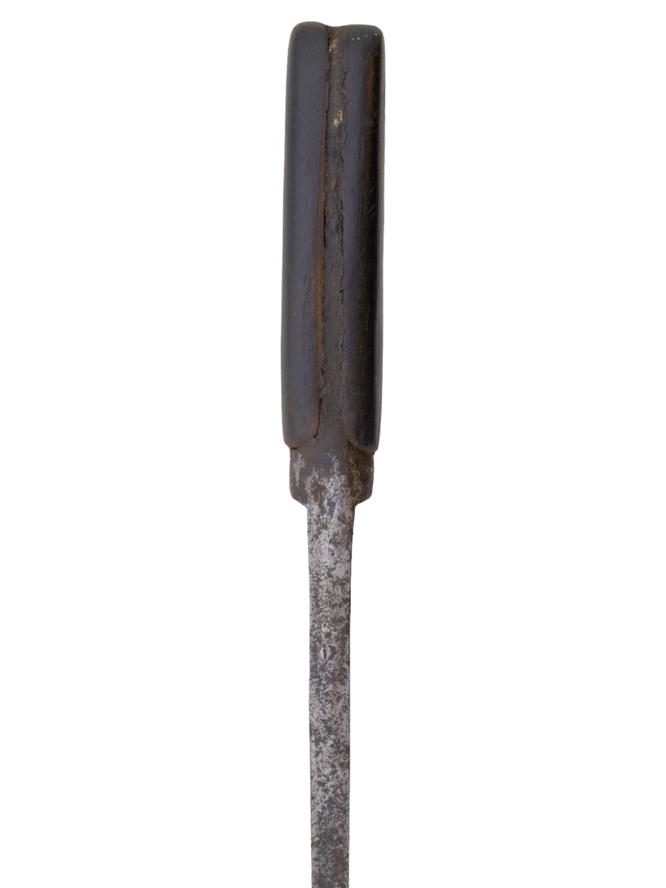 Blade has warped in places and is pitted throughout. The inlay is worn and faded in places but is mostly present. Grip scales are probably a 19th century replacement for an earlier more ornate hilt.
