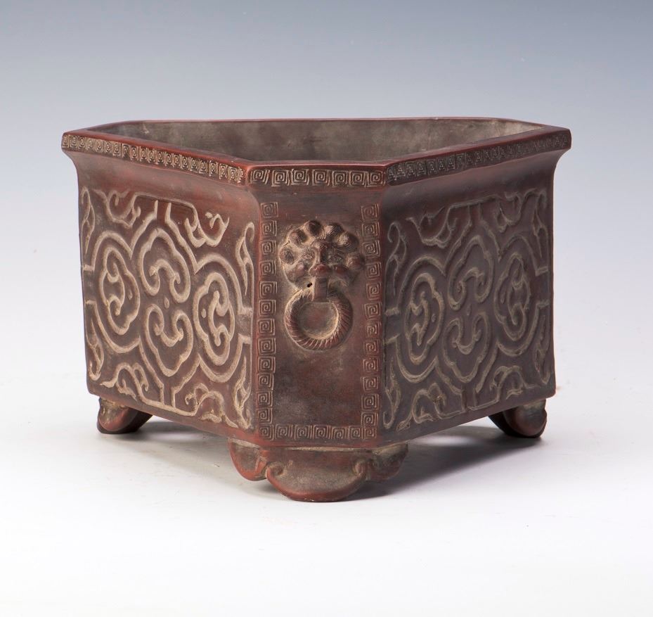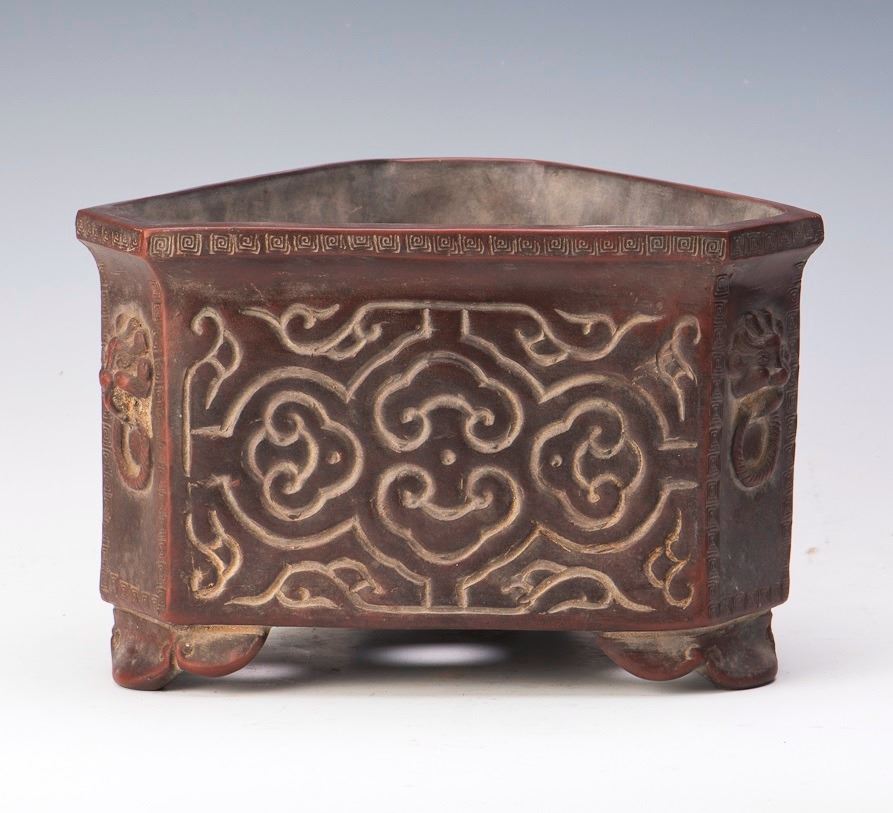 An elegant zisha flower pot of six sides with auspicious pattern and detailed relief on each side, signed and with seals of Chen Jinghe on the bottom. Diameter 9.5" Height 6"