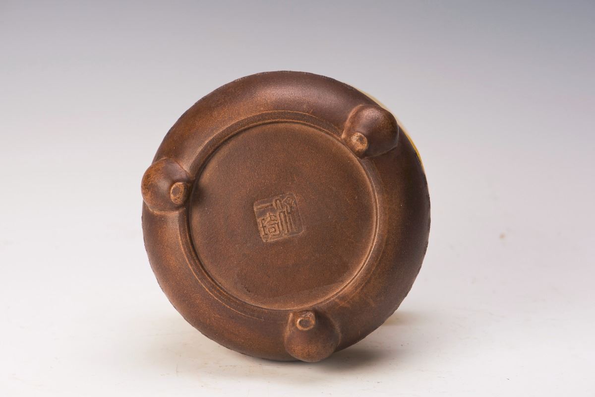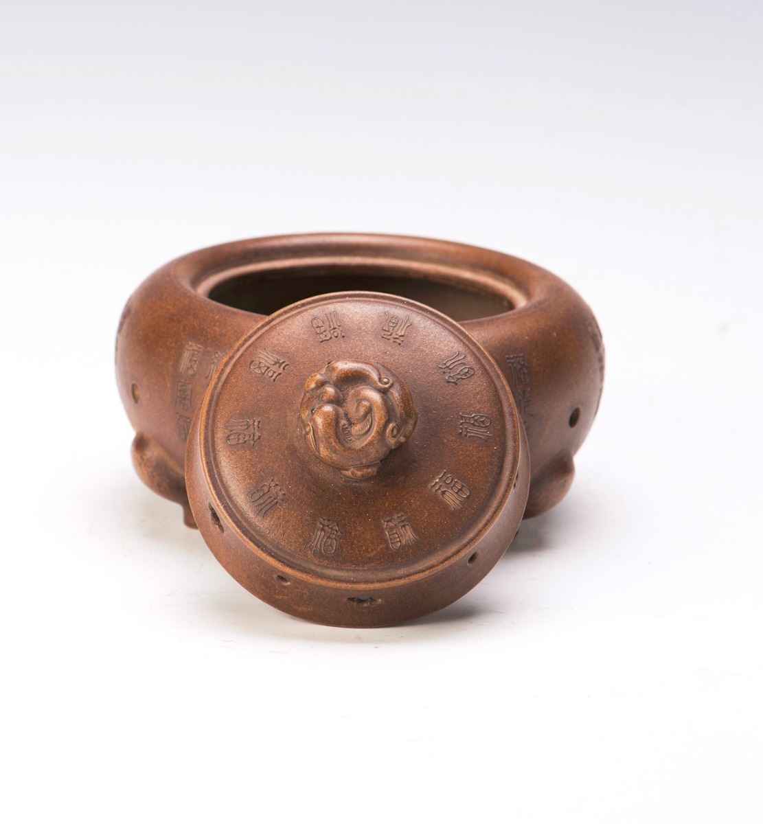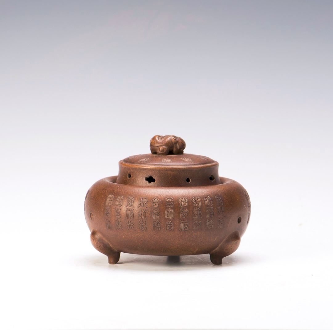 A Zisha three-footed censer in globular form, featuring a four-character mark on the base. Diameter 6" Height 4.5"