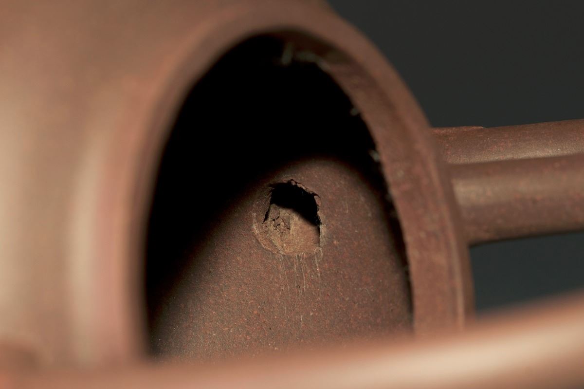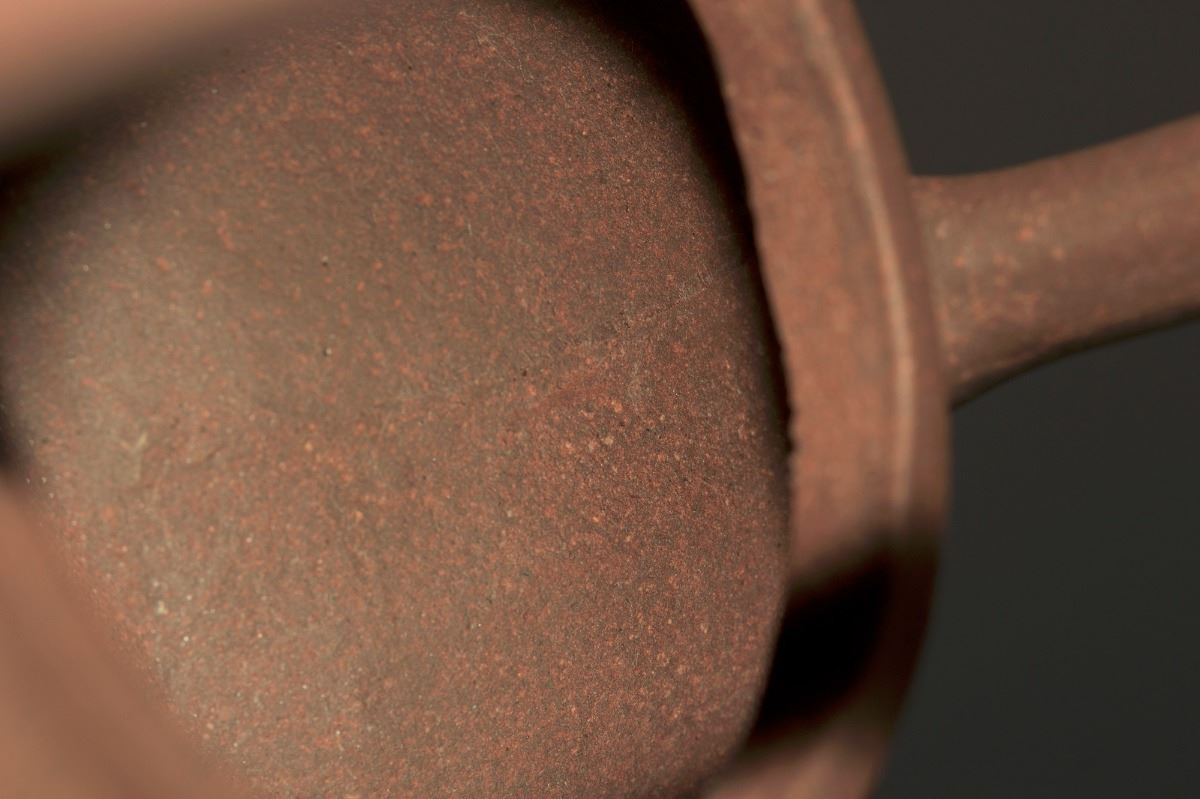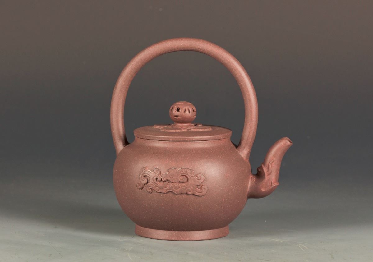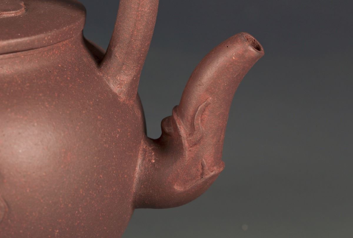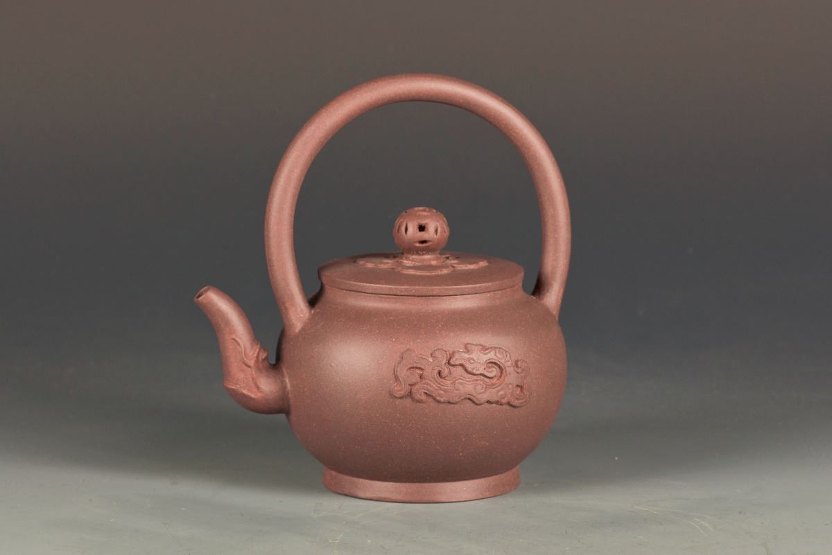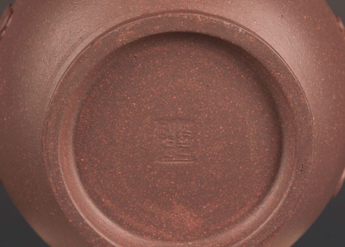 Chinese Round shape Ti Liang style Zisha clay Teapot with body, handle, spout, finial, lid all well-proportioned. With a mark on the bottom. Length 6" Width 4.5" Height 6.75"