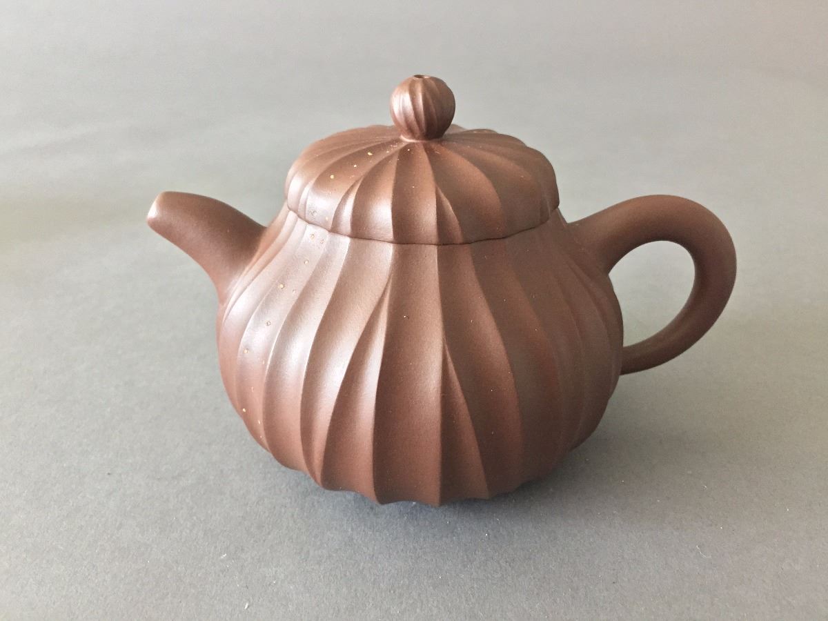 A Zisha teapot featuring ridged carvings on the body.