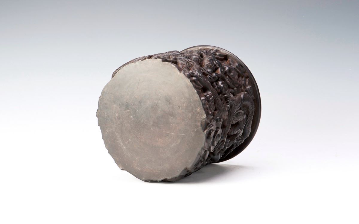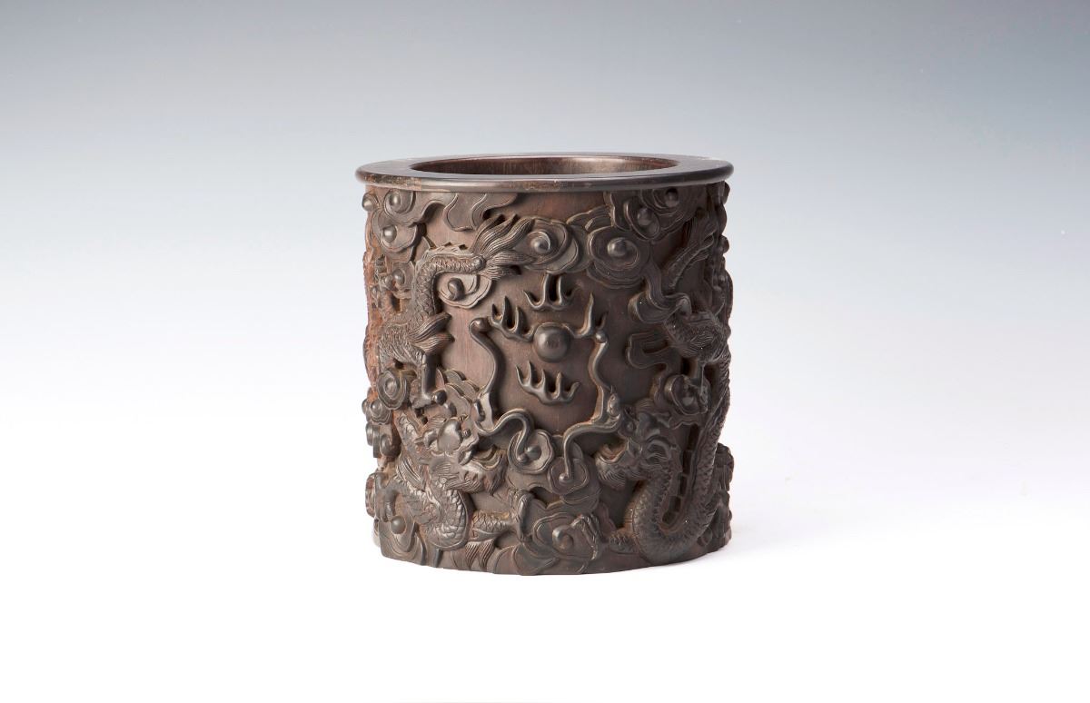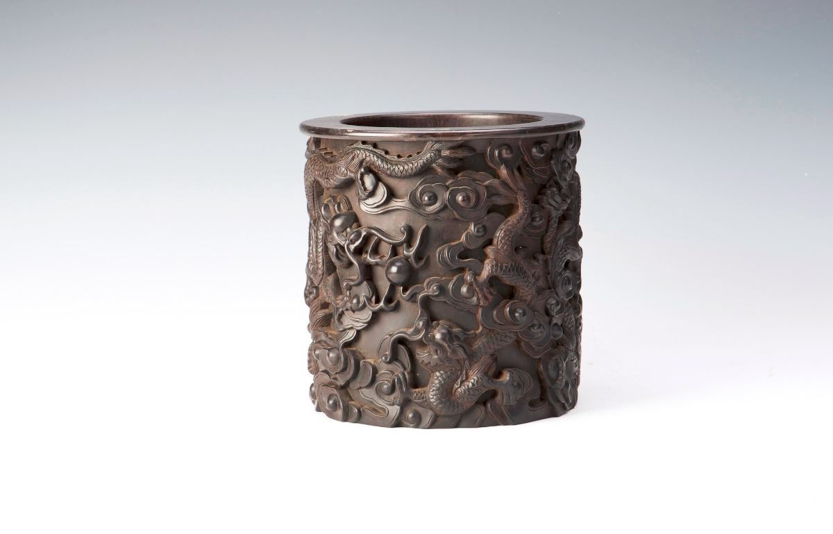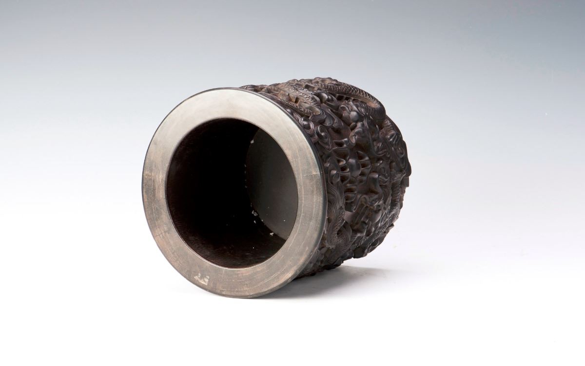 An exquisite Zitan brush pot with high relief of dragon chasing a flaming pearl amidst stylized clouds and flames. Height 8.5" Diameter 8.5"