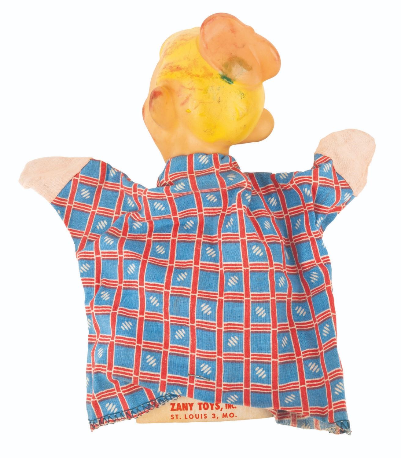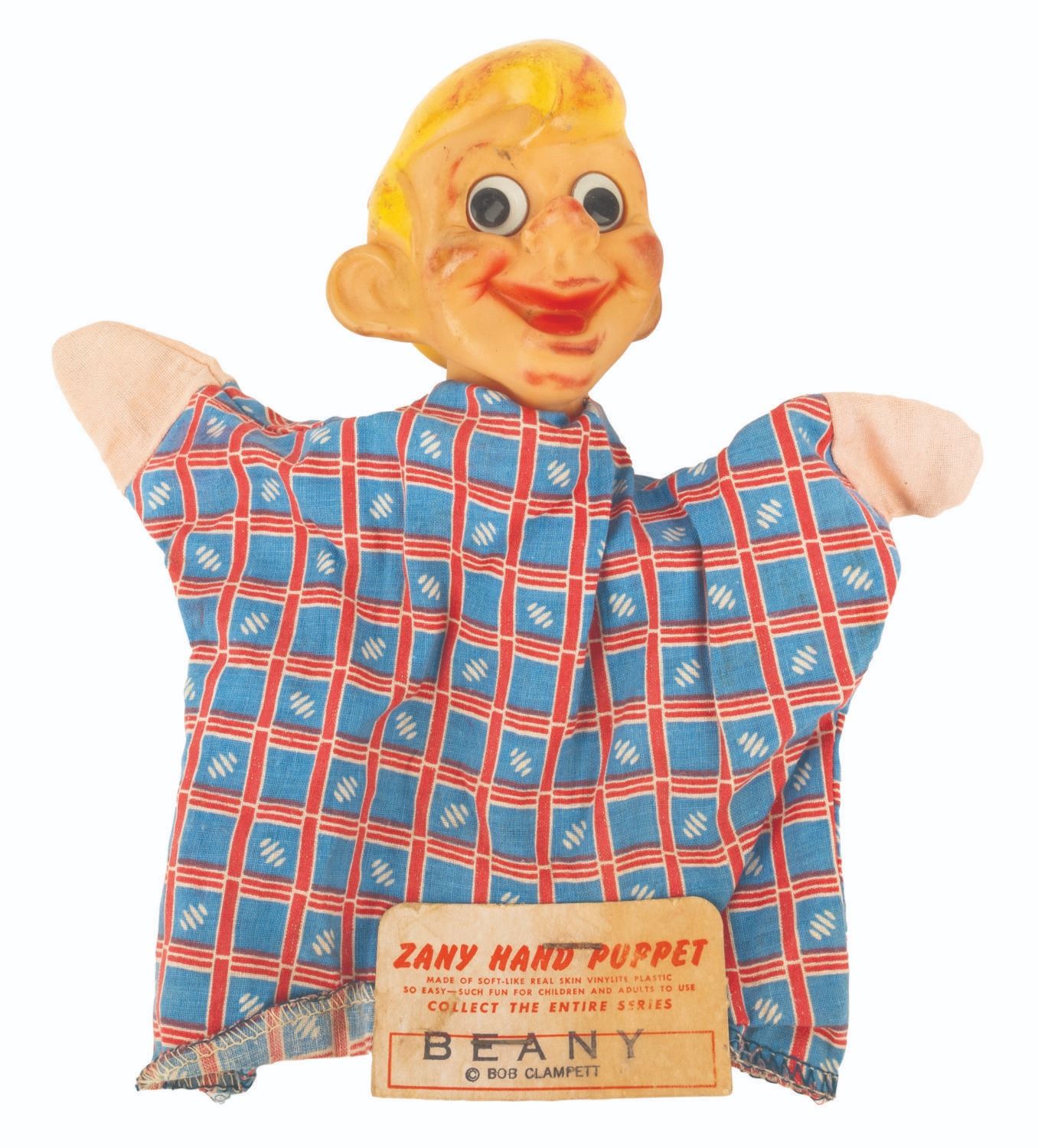 (Zany Toys, 1950s) A “Time For Beany” hand puppet of Beany manufactured by Zany Toys. The puppet with a rubber head and fabric body measures 9” x 3.25” x 8.75” tall, and is in fair condition with plasticization and marks to the head, creases and discoloration to the tag, and the pupils of the googly eyes stuck in place.